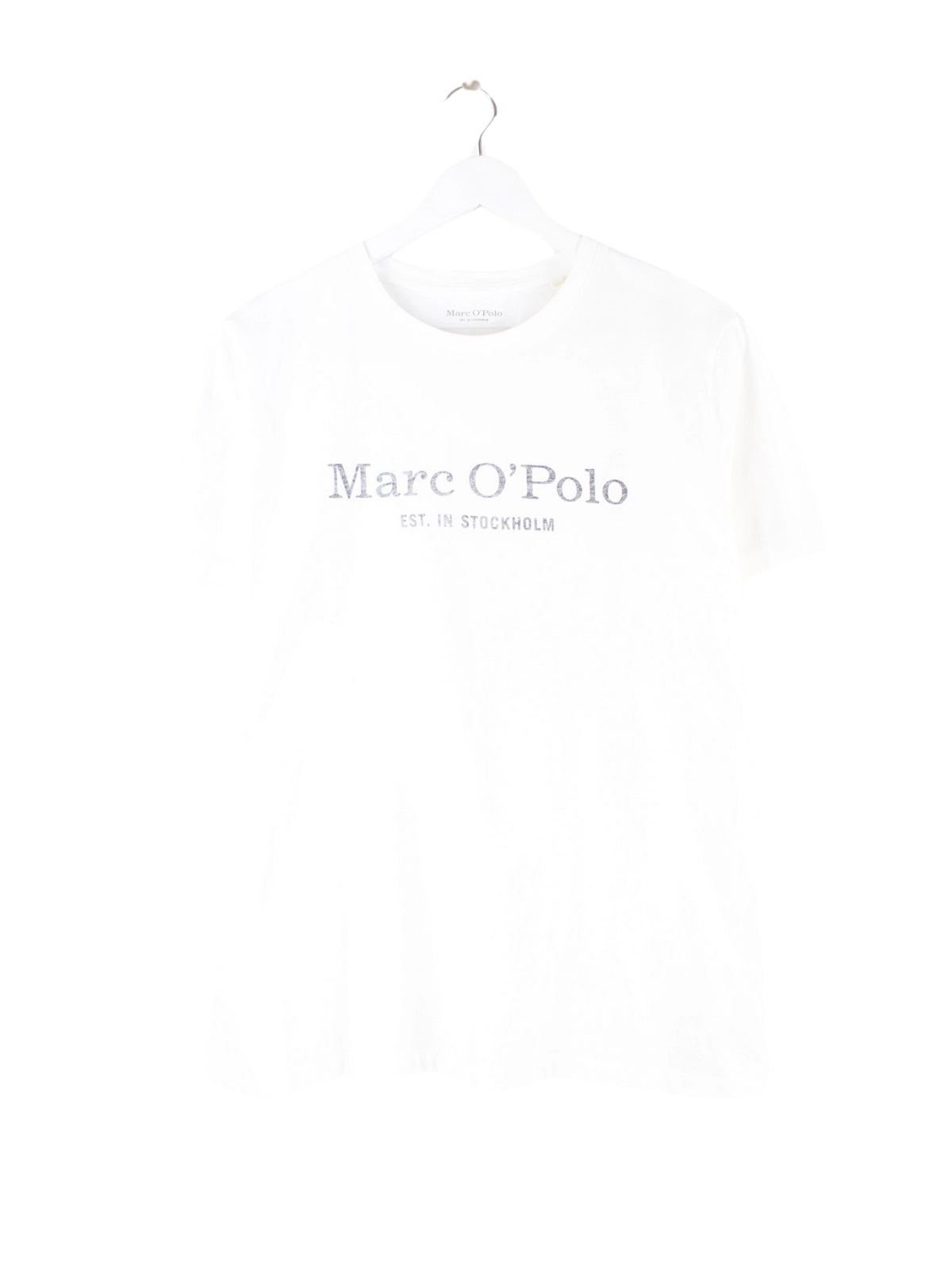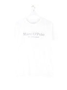 Weißes T-Shirt des Labels Marc O' Polo in Größe XL. Es ist aus Baumwolle angefertigt und in gutem Zustand bei uns vorrätig. Mit chiquem Print.