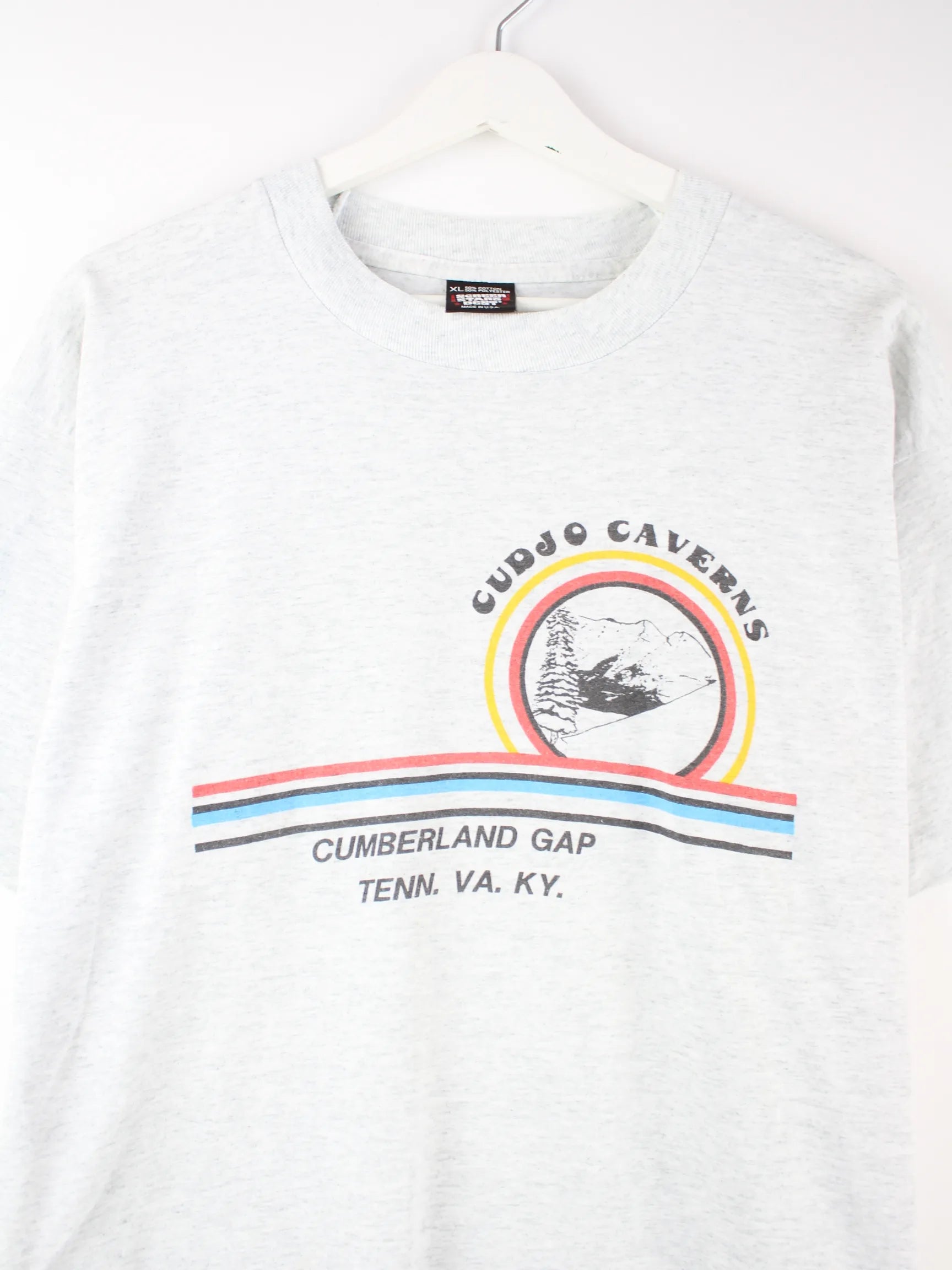 T-Shirt vom Label Screen Stars in Größe XL aus den 90'ern. Es ist aus Baumwolle angefertigt und in Grau im Bestand. Mit schickem Vintage Print.