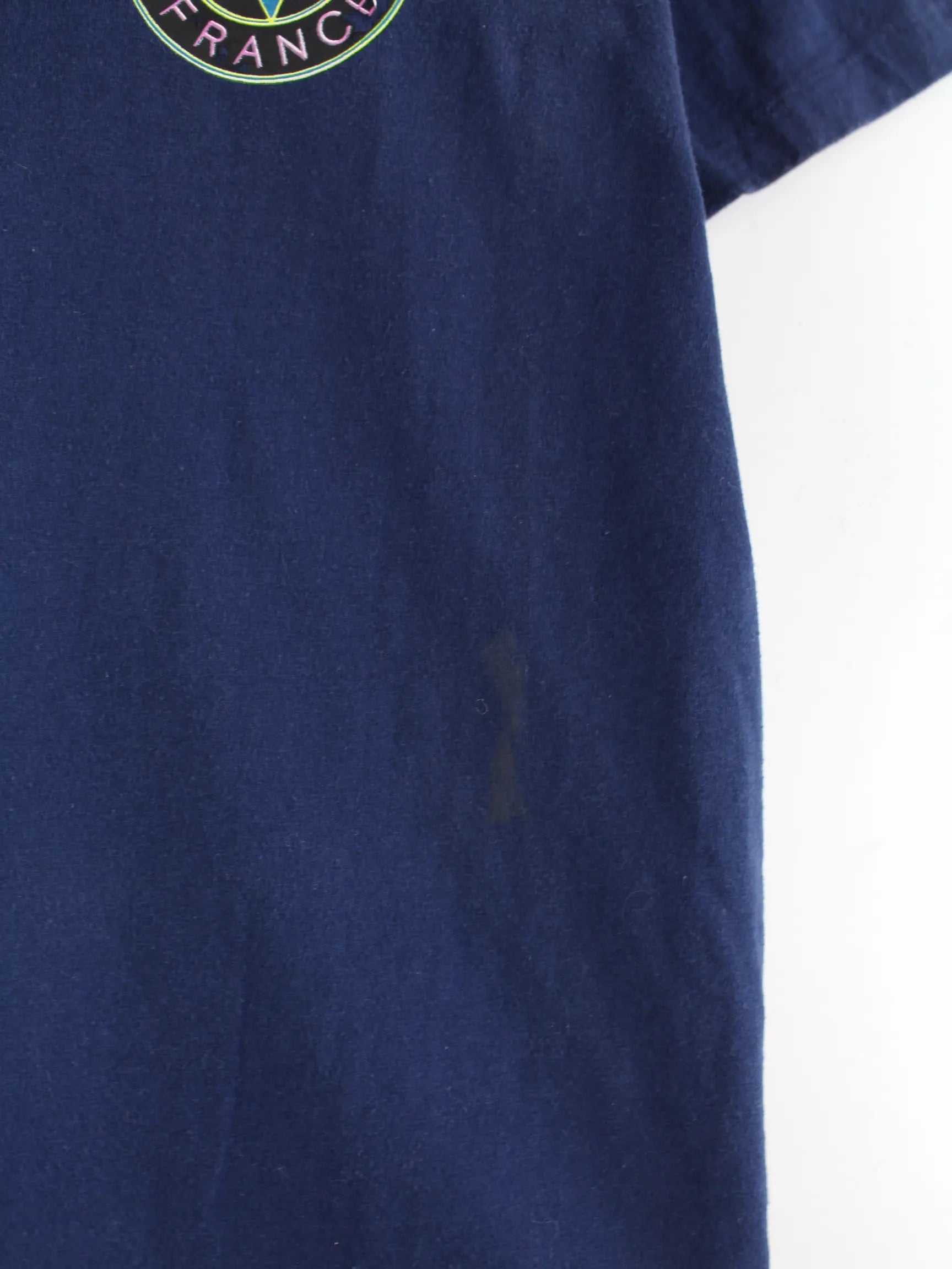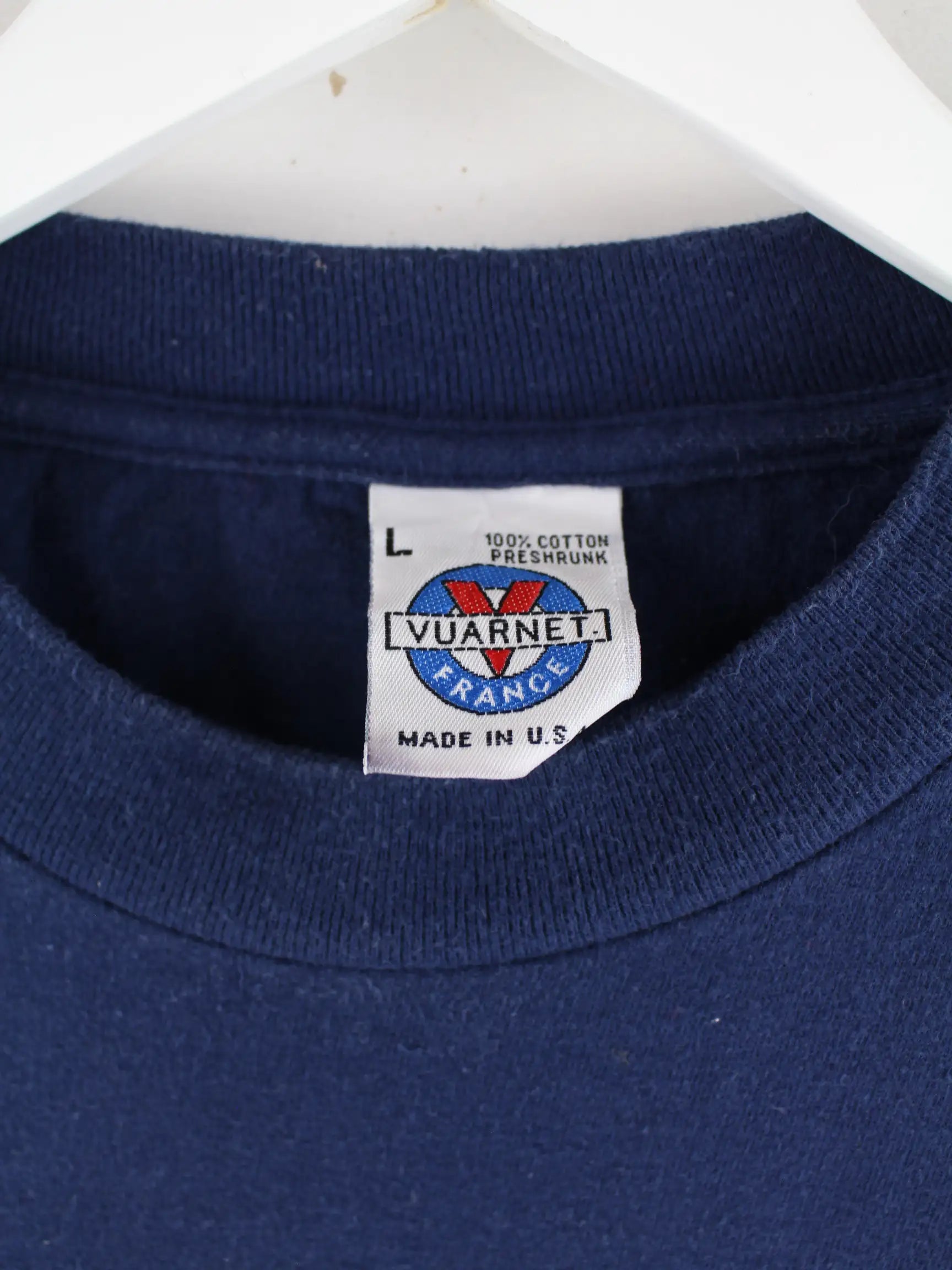 Blaues Vintage T-Shirt aus den 90'ern in Größe L. Es ist aus Baumwolle gemacht. Den Zustand würden wir als 'In Ordnung' bezeichnen (vergl. Bilder).Mit seltenem 90s Print.