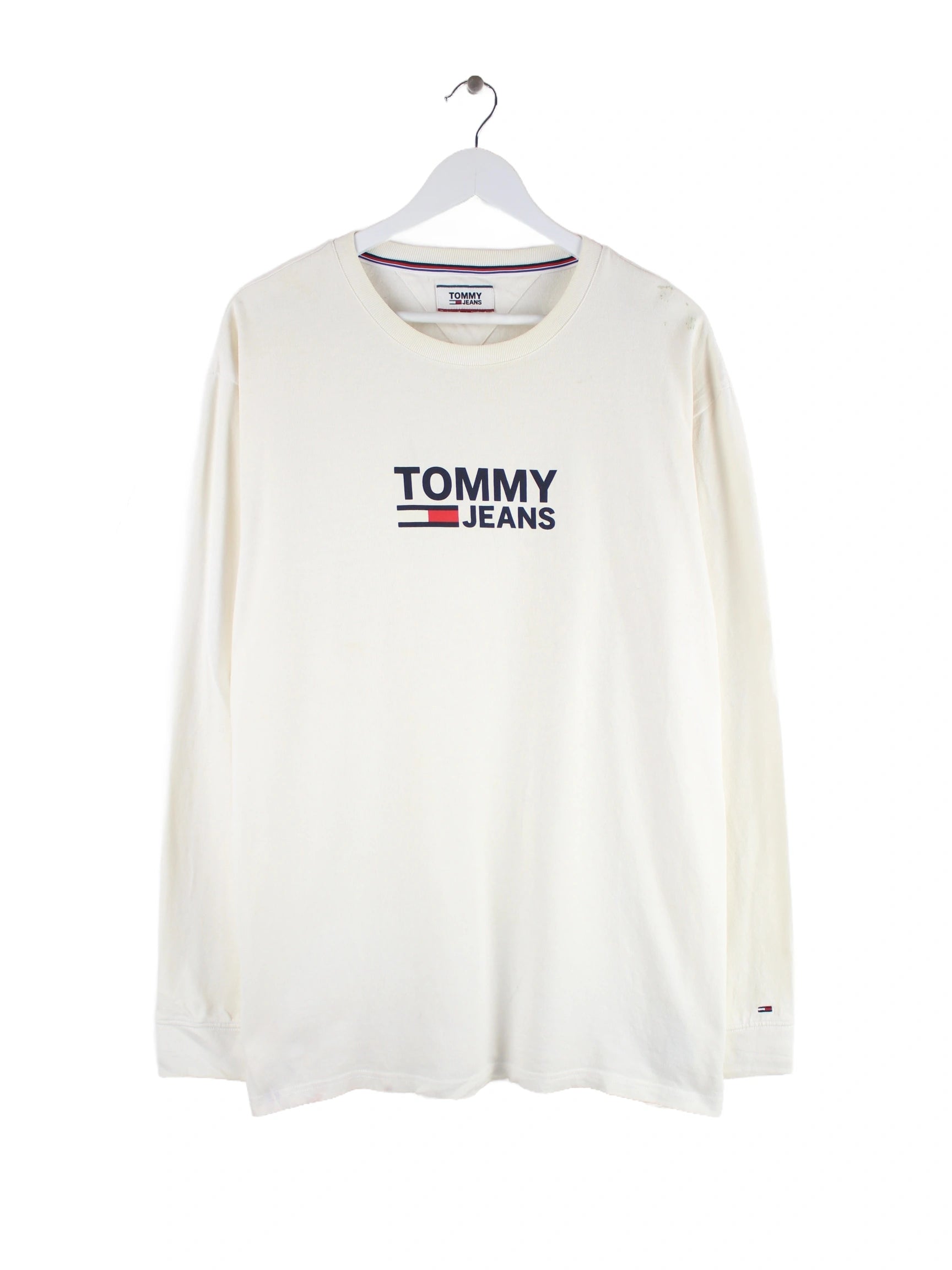 Weißes Sweatshirt der Marke Tommy Hilfiger in Größe XXL. Es ist aus Baumwolle hergestellt. Den Zustand würden wir als 'In Ordnung' bezeichnen (vergl. Bilder).Mit seltenem Logo Print.