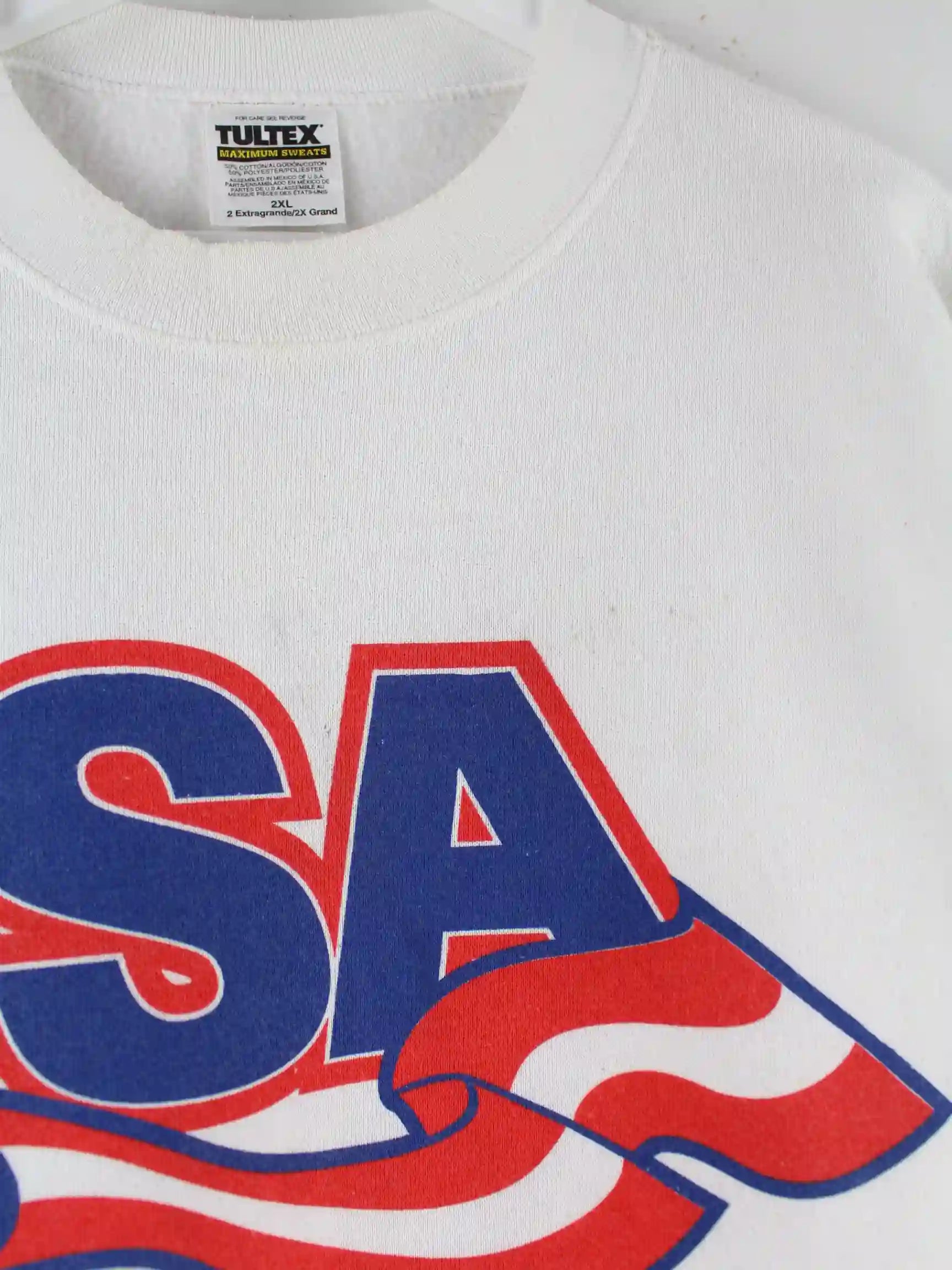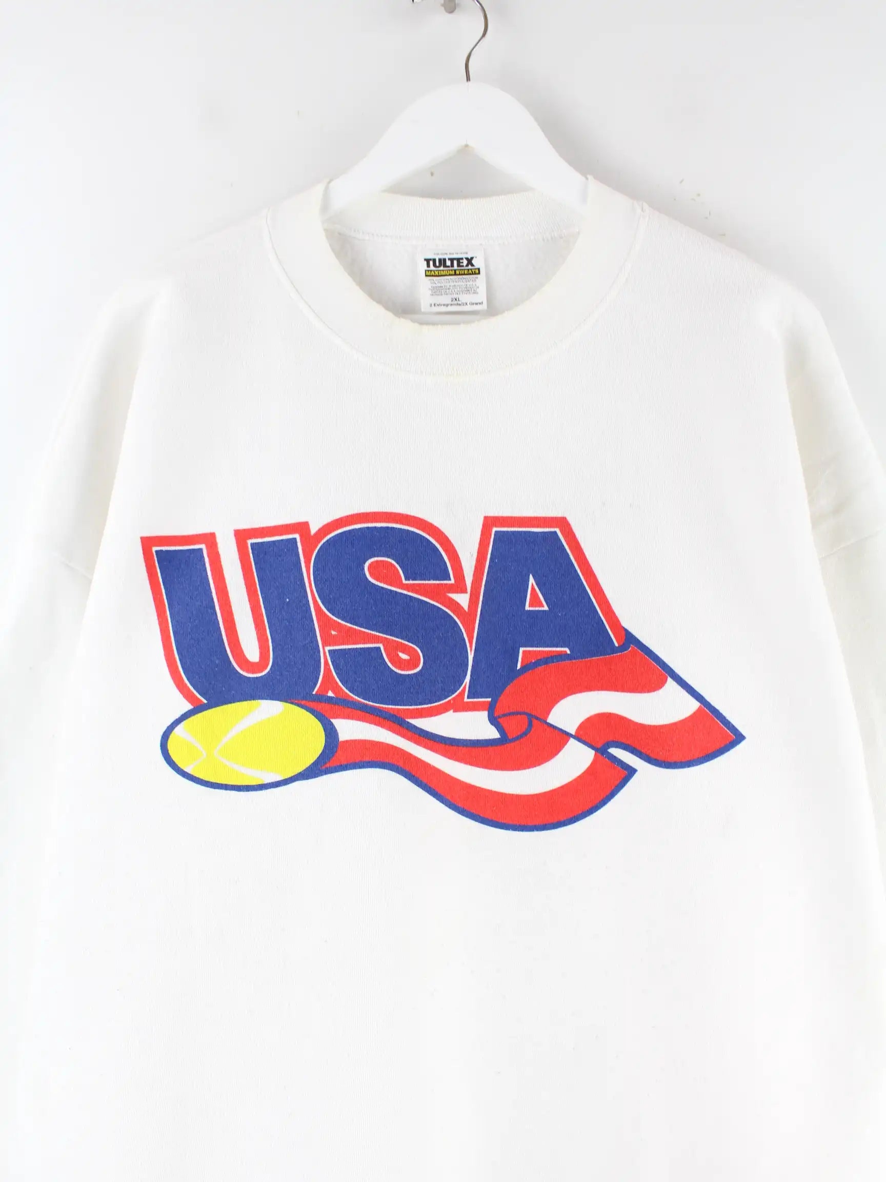 Sweater aus dem Hause Tultex in Größe XXL. Er ist aus einer Baumwollmischung produziert und in Weiß lieferbar. Mit seltenem USA Print.