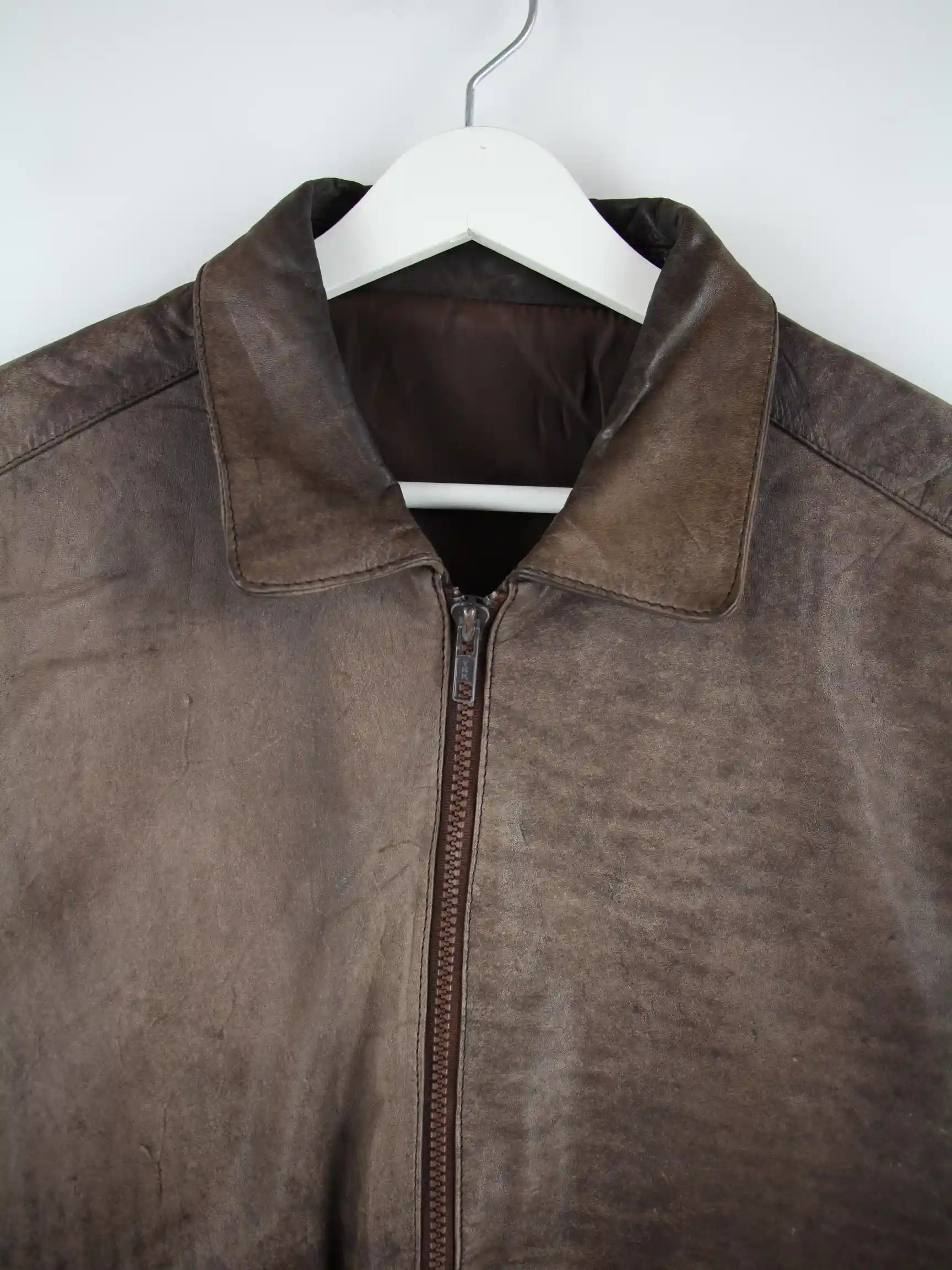 Vintage Jacke in Größe S aus den 90'ern. Sie ist aus Leder hergestellt und in Braun lieferbar.
