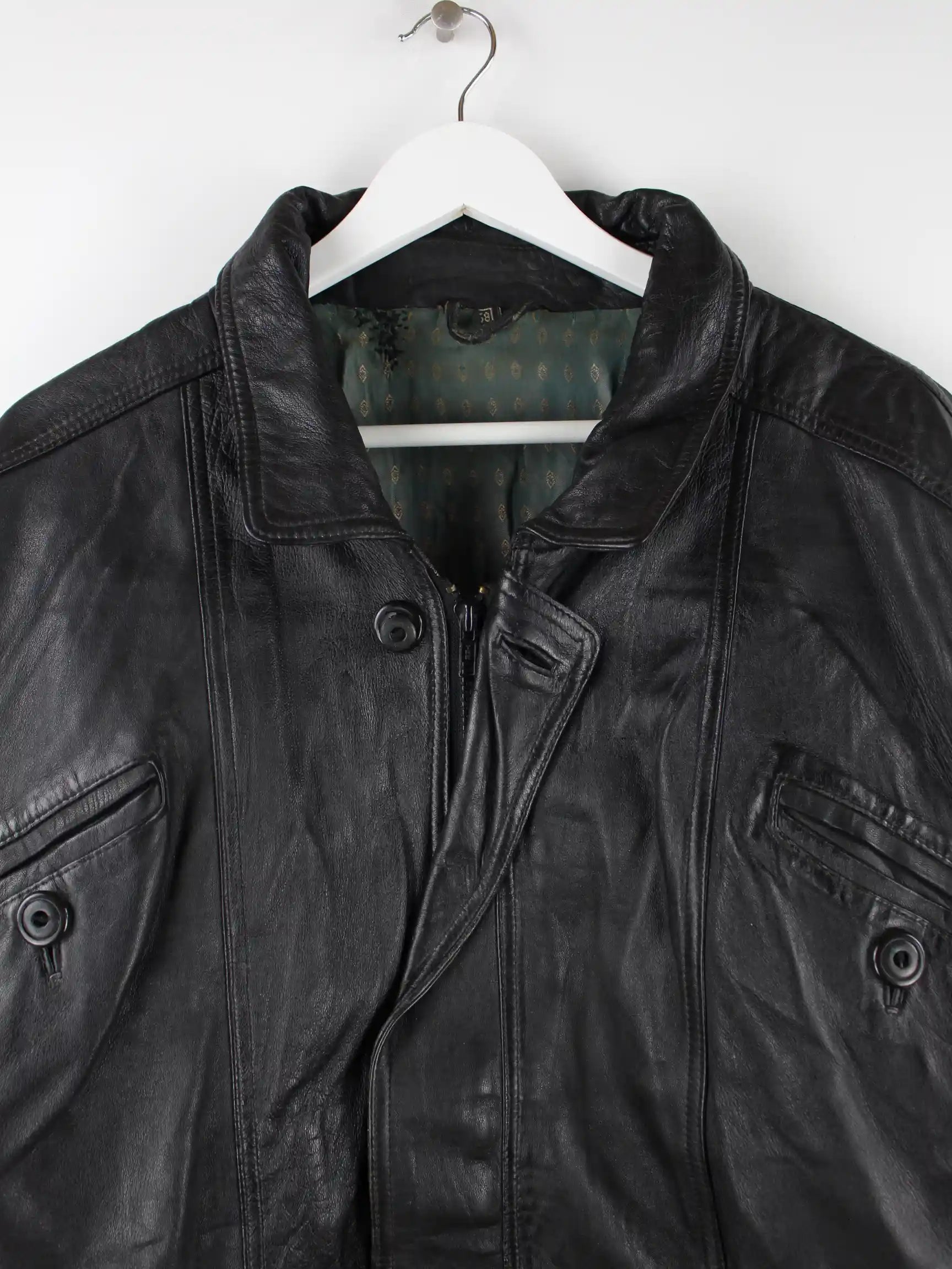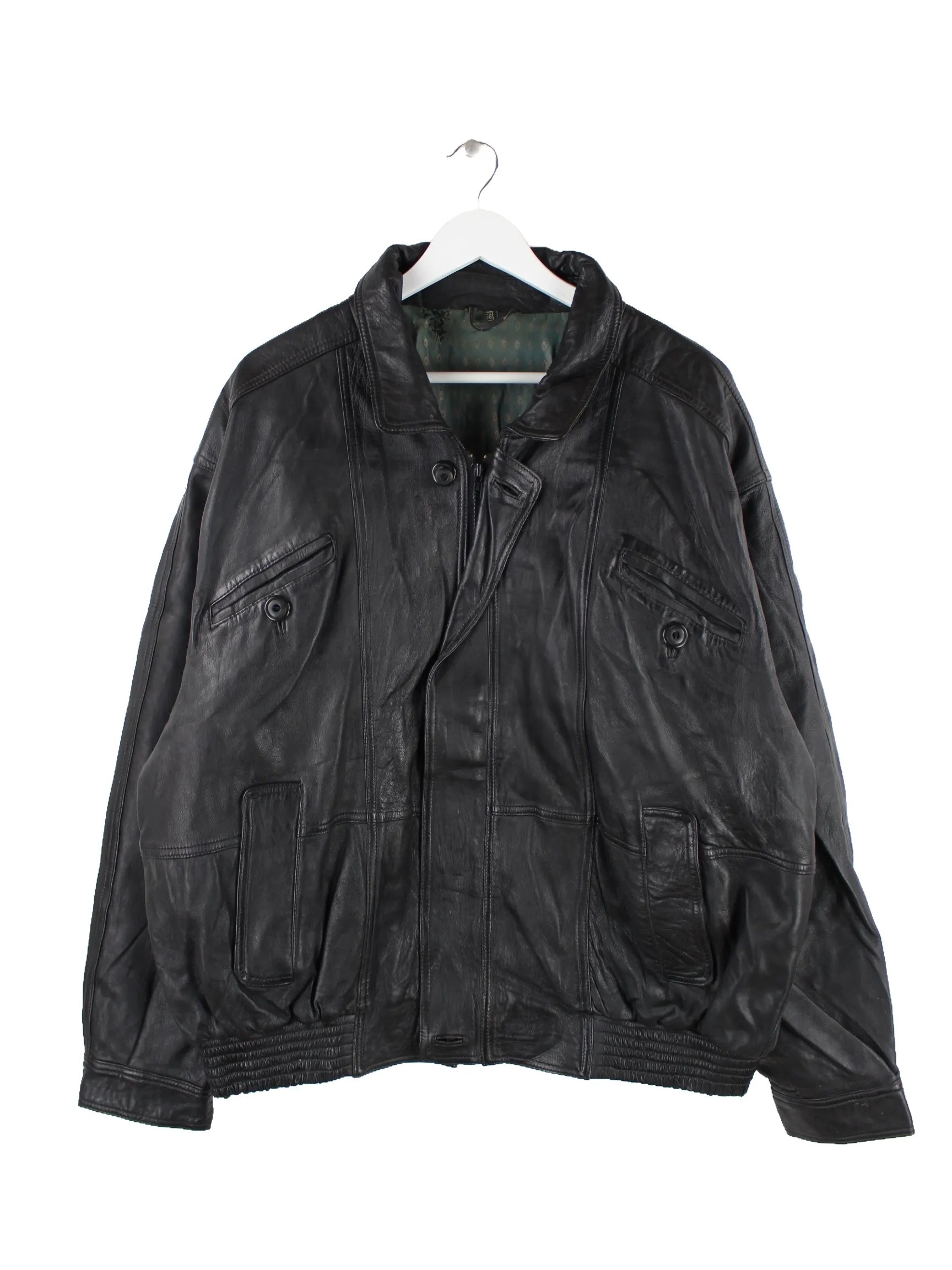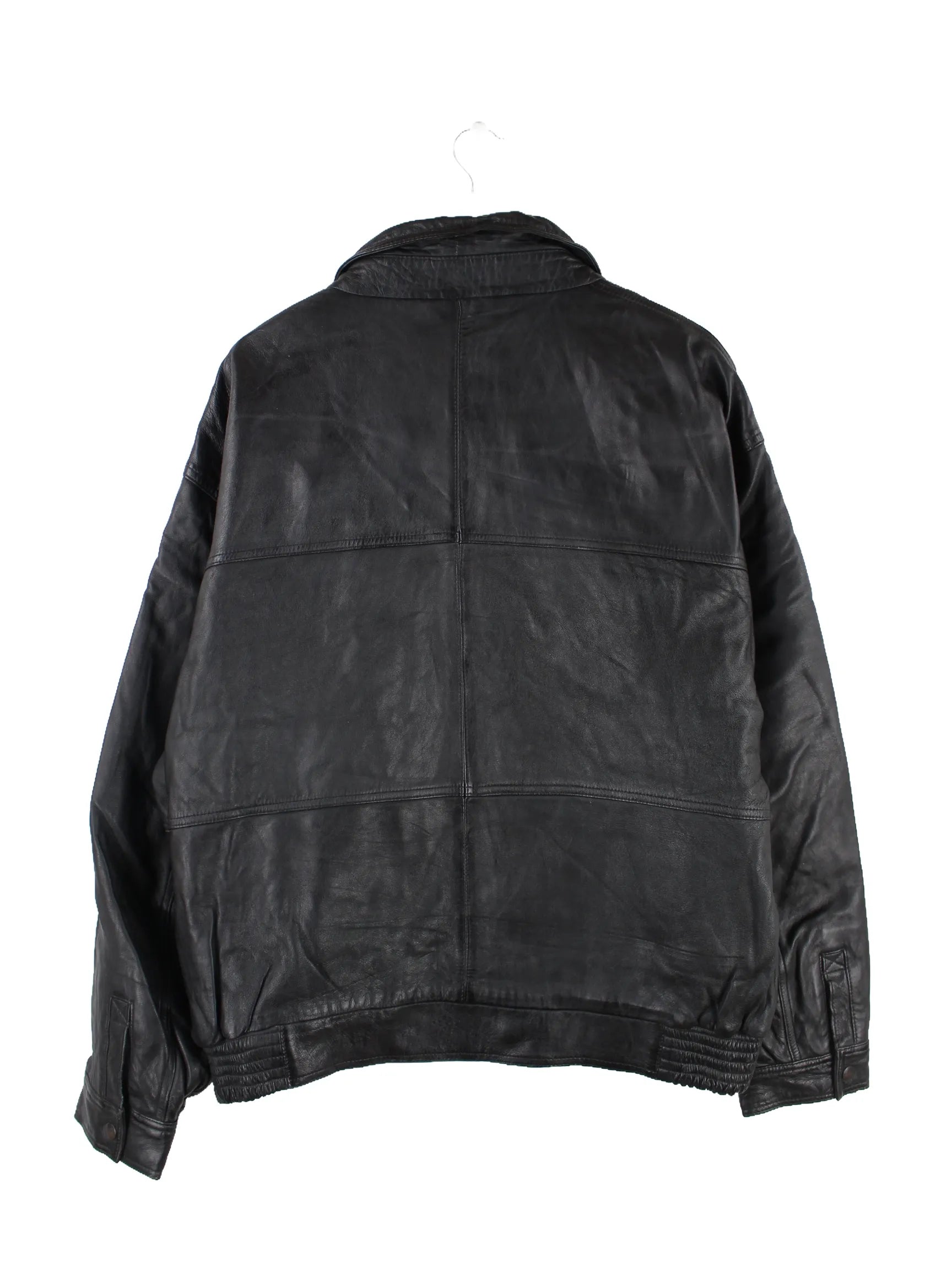 Vintage Jacke in Größe XXL aus den 90'ern. Sie ist aus Leder hergestellt und in Schwarz vorrätig.