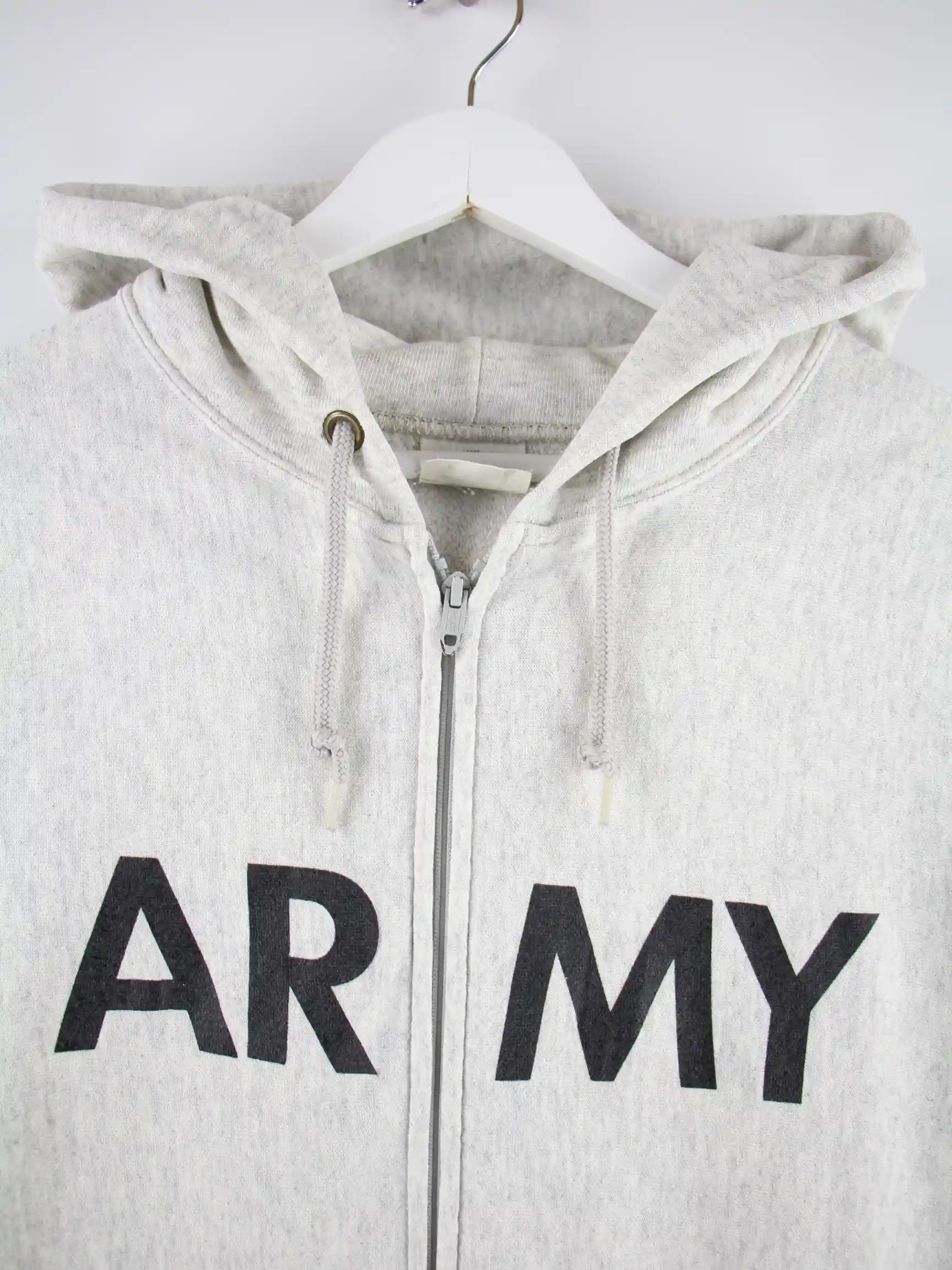 Vintage Hoodie mit durchgehendem Reißverschluß in Größe L. Er ist aus einer Baumwollmischung gemacht und in Grau im Bestand. Mit chiquem Army Print.
