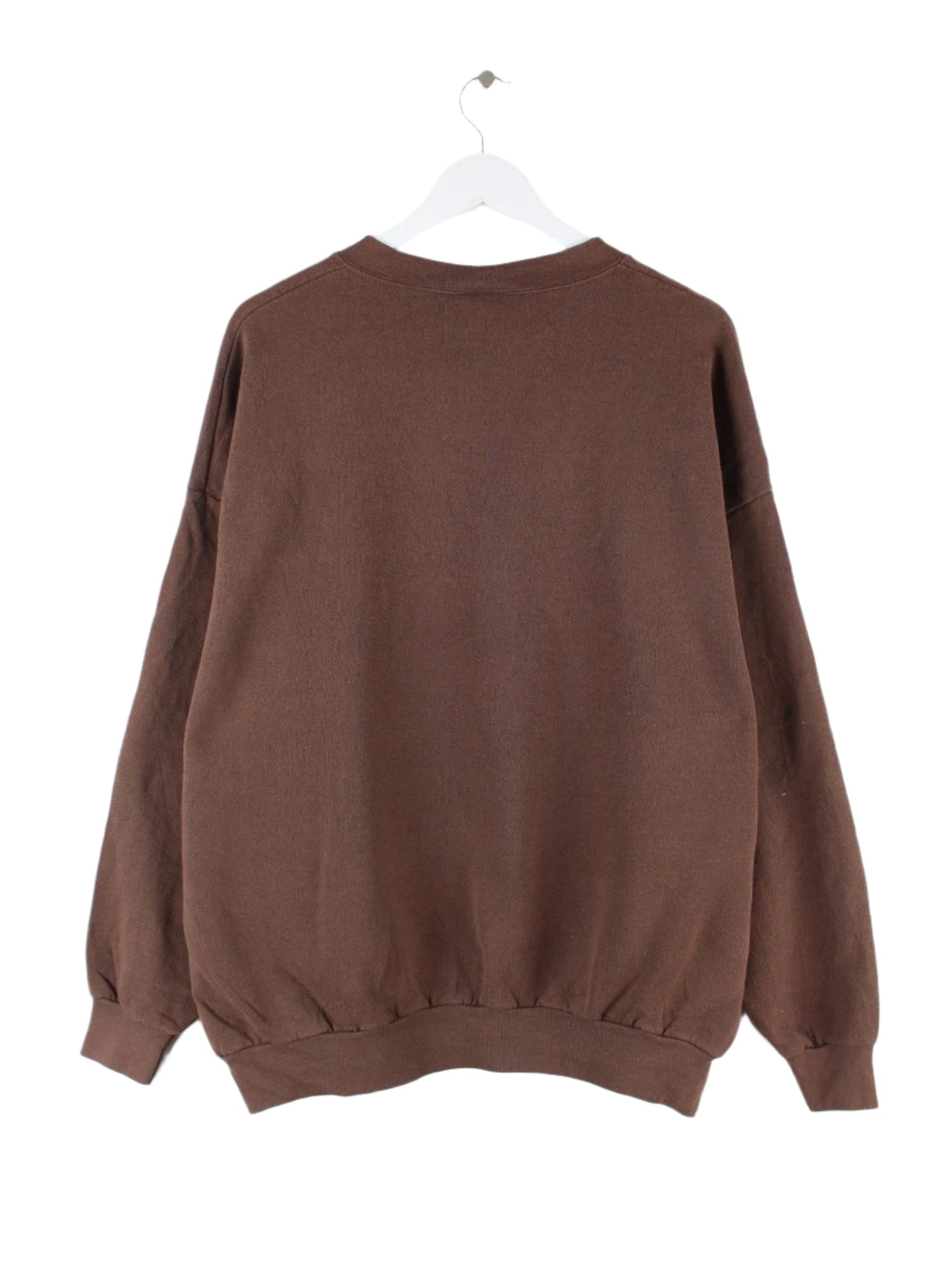 Brauner Vintage Sweater mit Stickereien aus den 90'ern in Größe XL. Er ist aus einer Baumwollmischung produziert und in gutem Zustand bei uns zu bekommen.