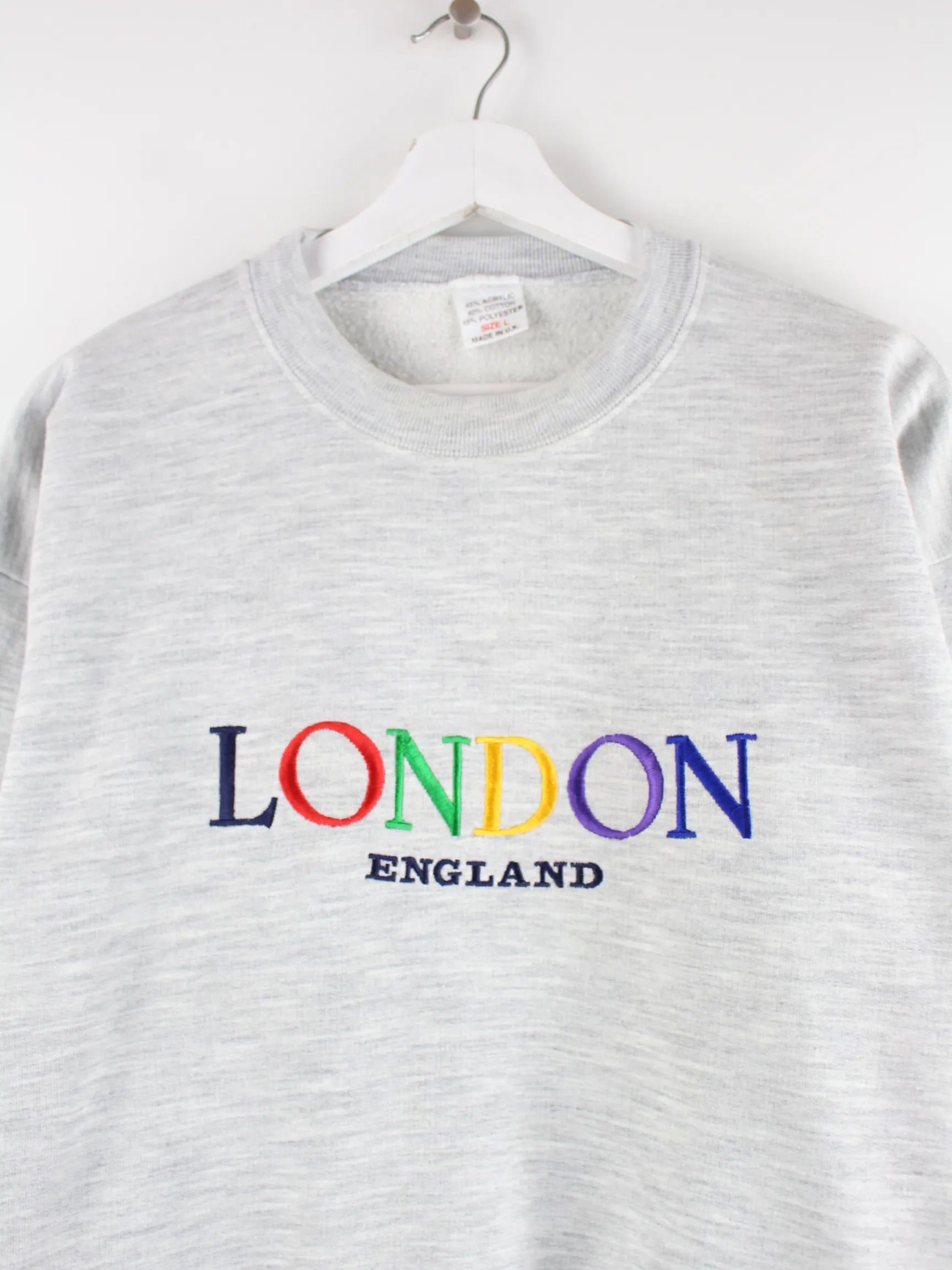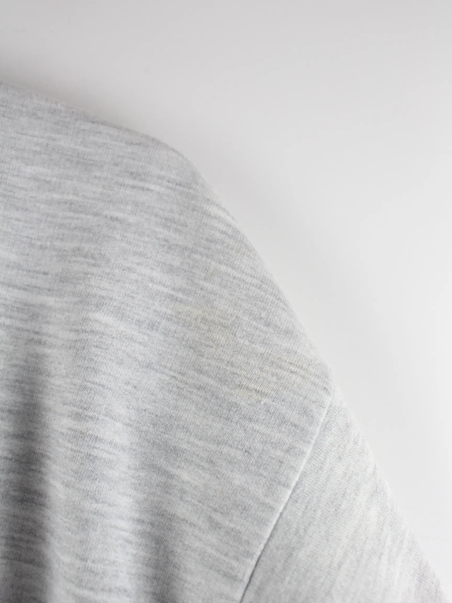 Grauer Vintage Sweater aus den 90'ern in Größe L. Er ist aus einer Baumwollmischung hergestellt und in gutem Zustand im Bestand.