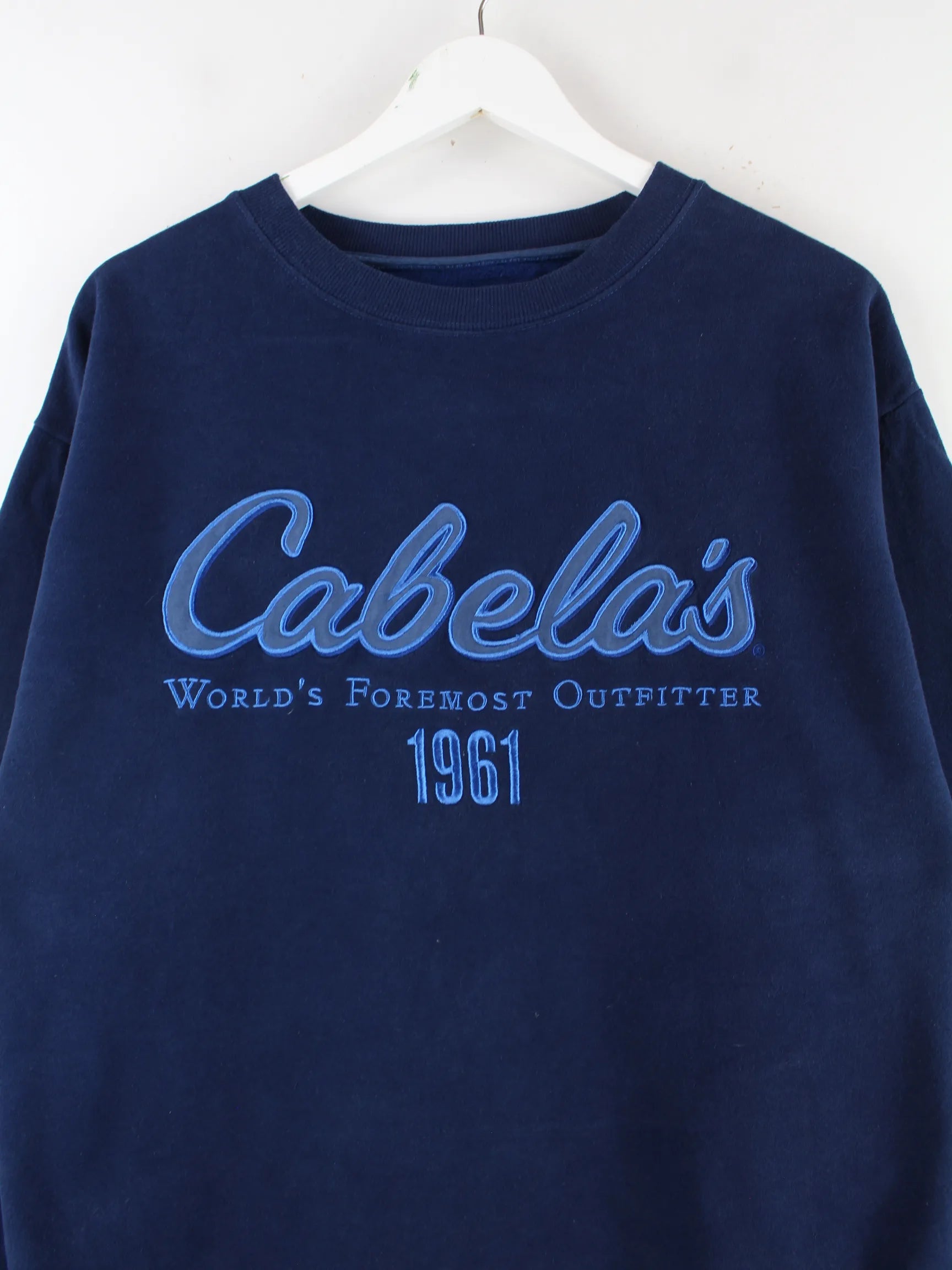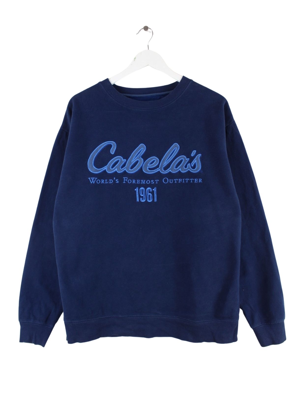 Sweater der Marke Cabela's mit gestickten Motiven in Größe XL. Er ist aus einer Baumwollmischung hergestellt und in Blau bei uns zu bekommen.