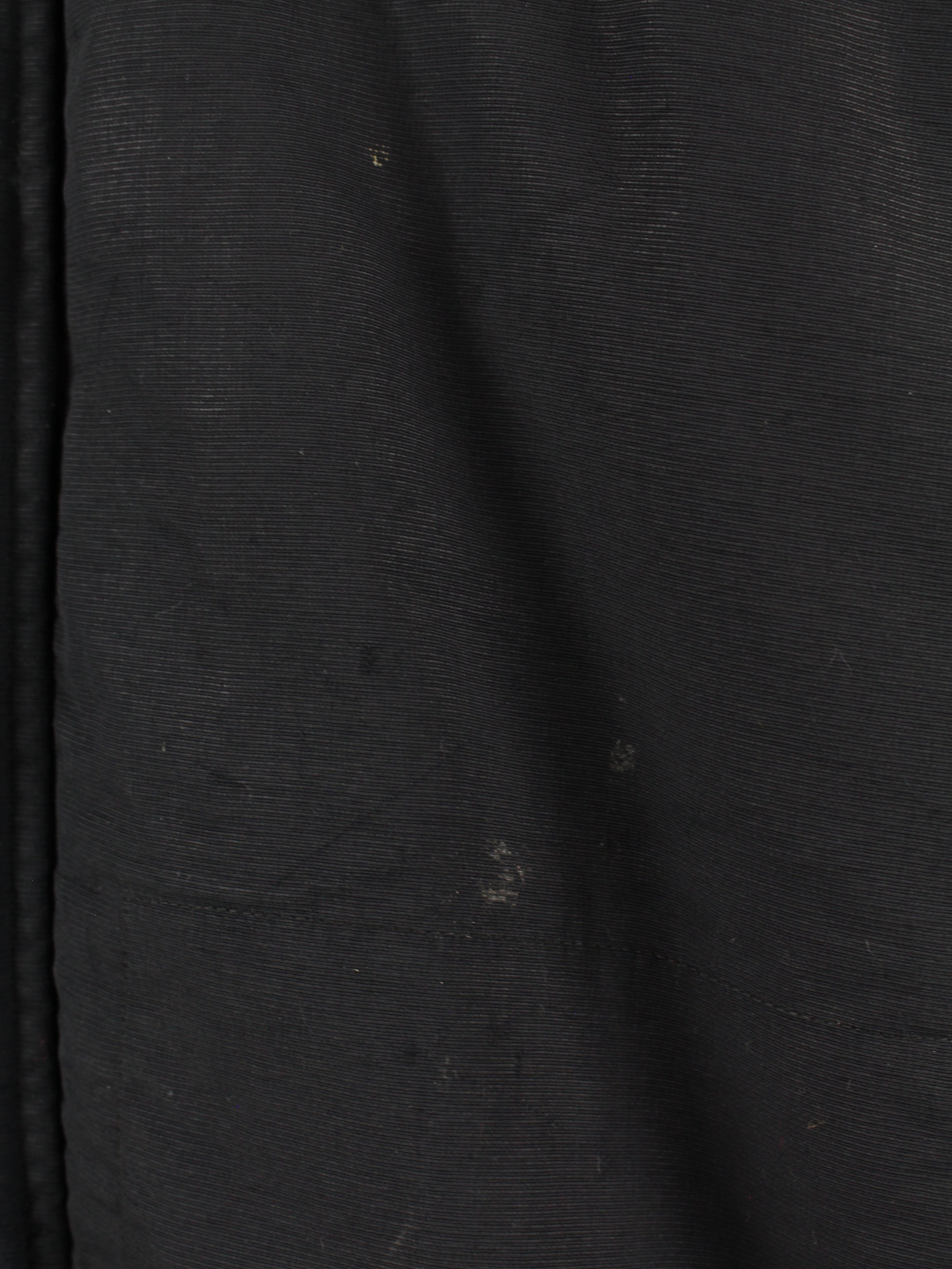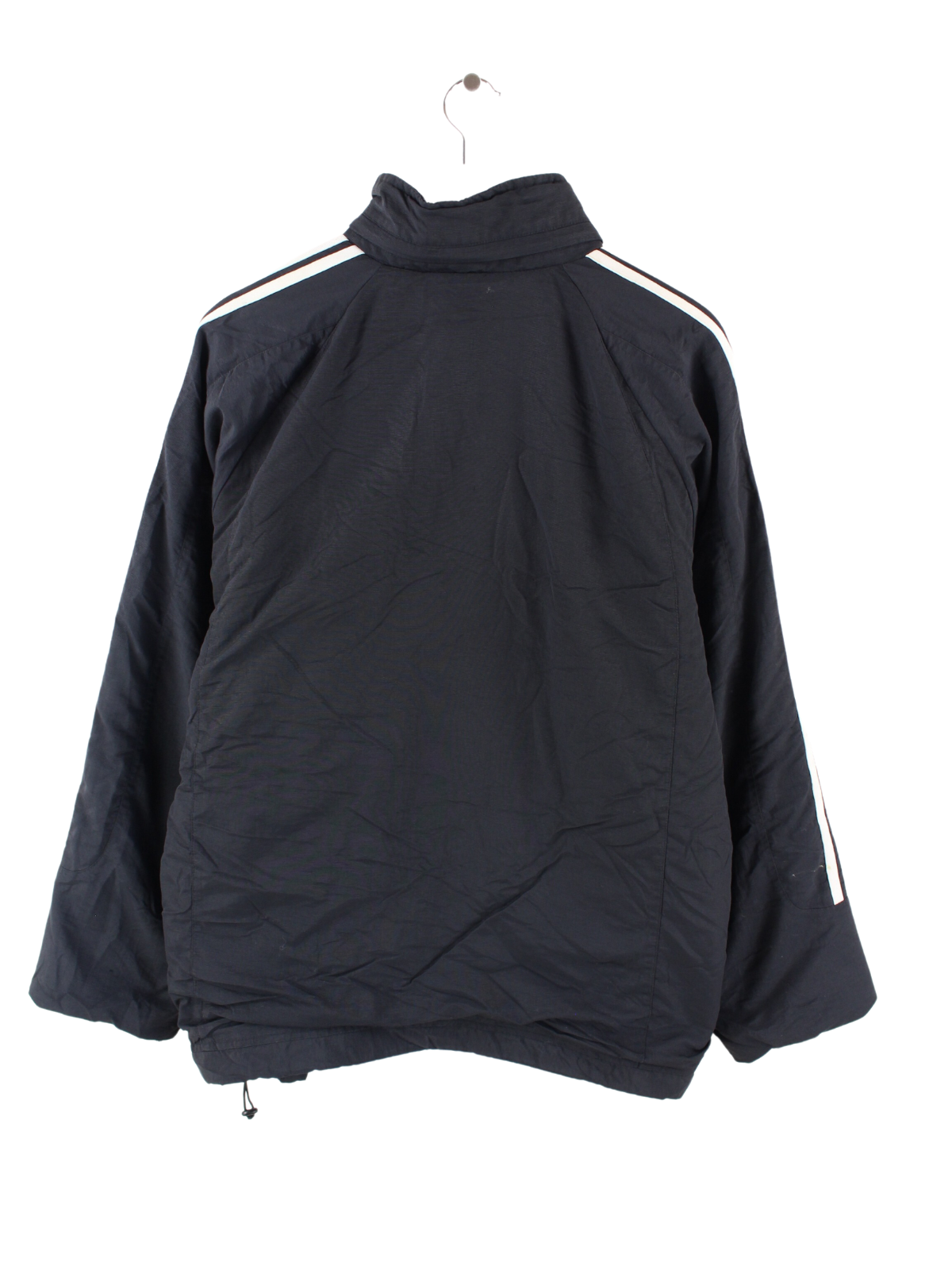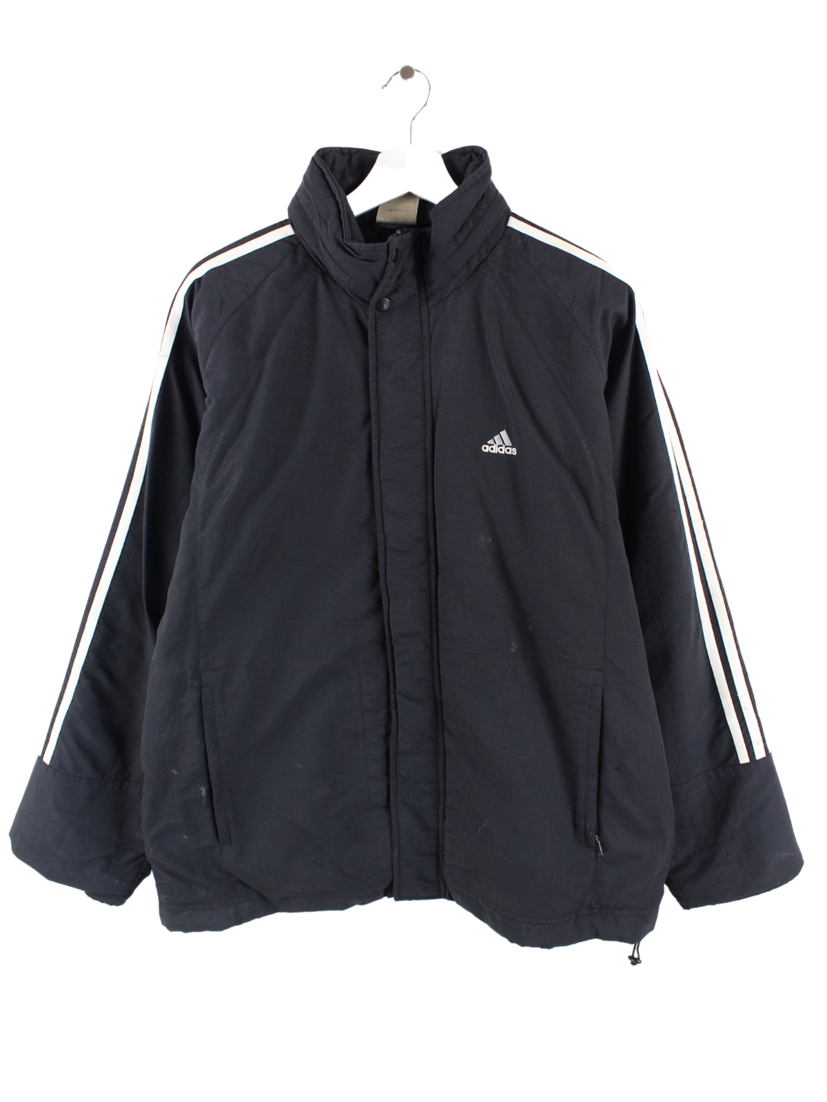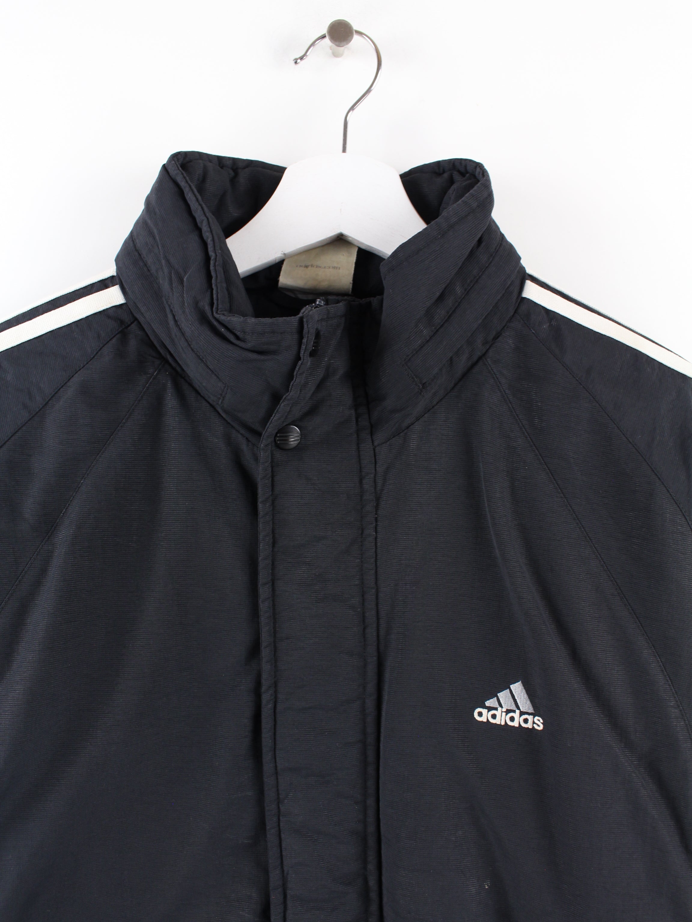 Black Adidas jacket with the typical three stripes on the sleeves.