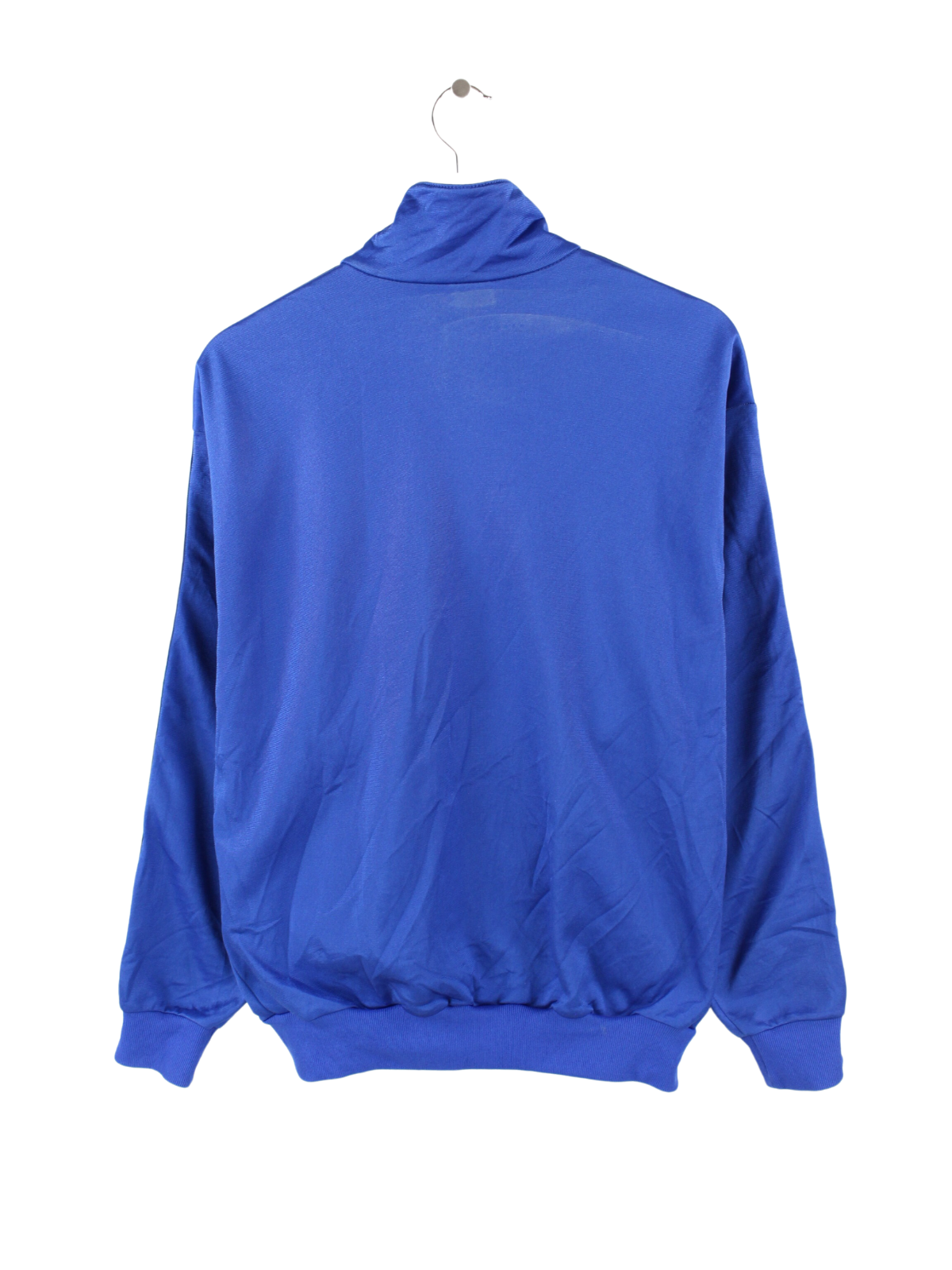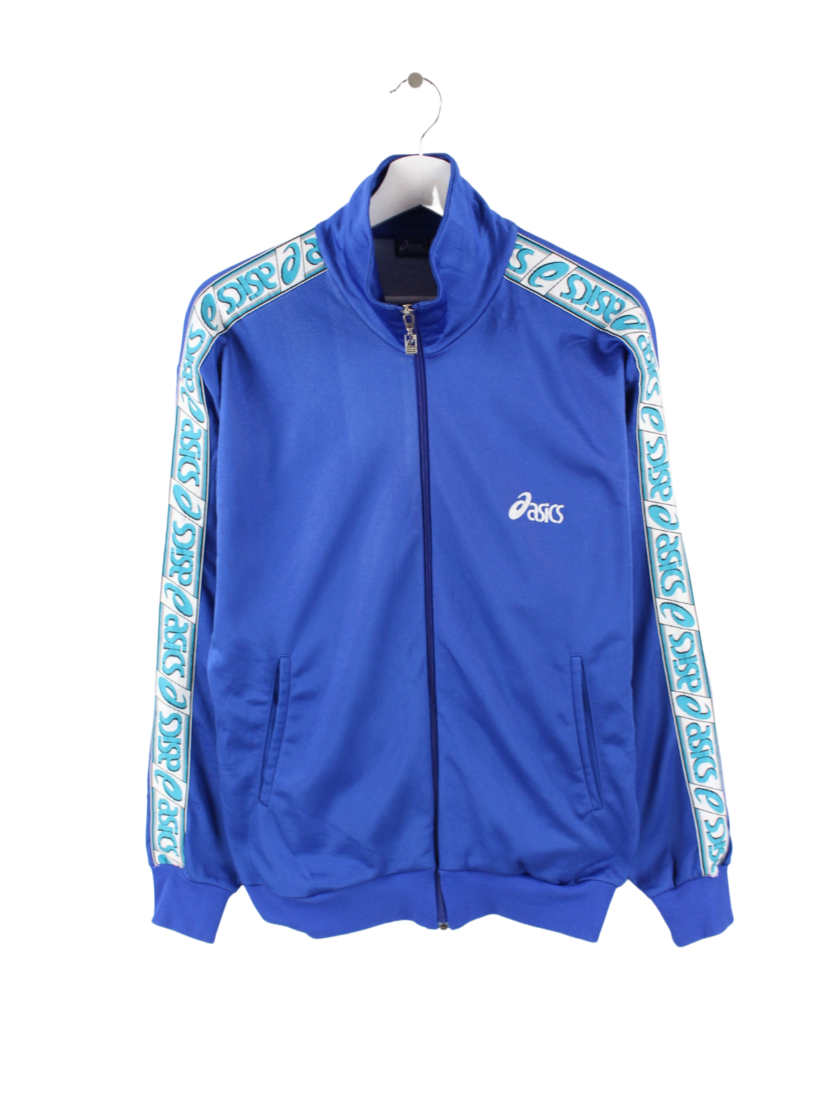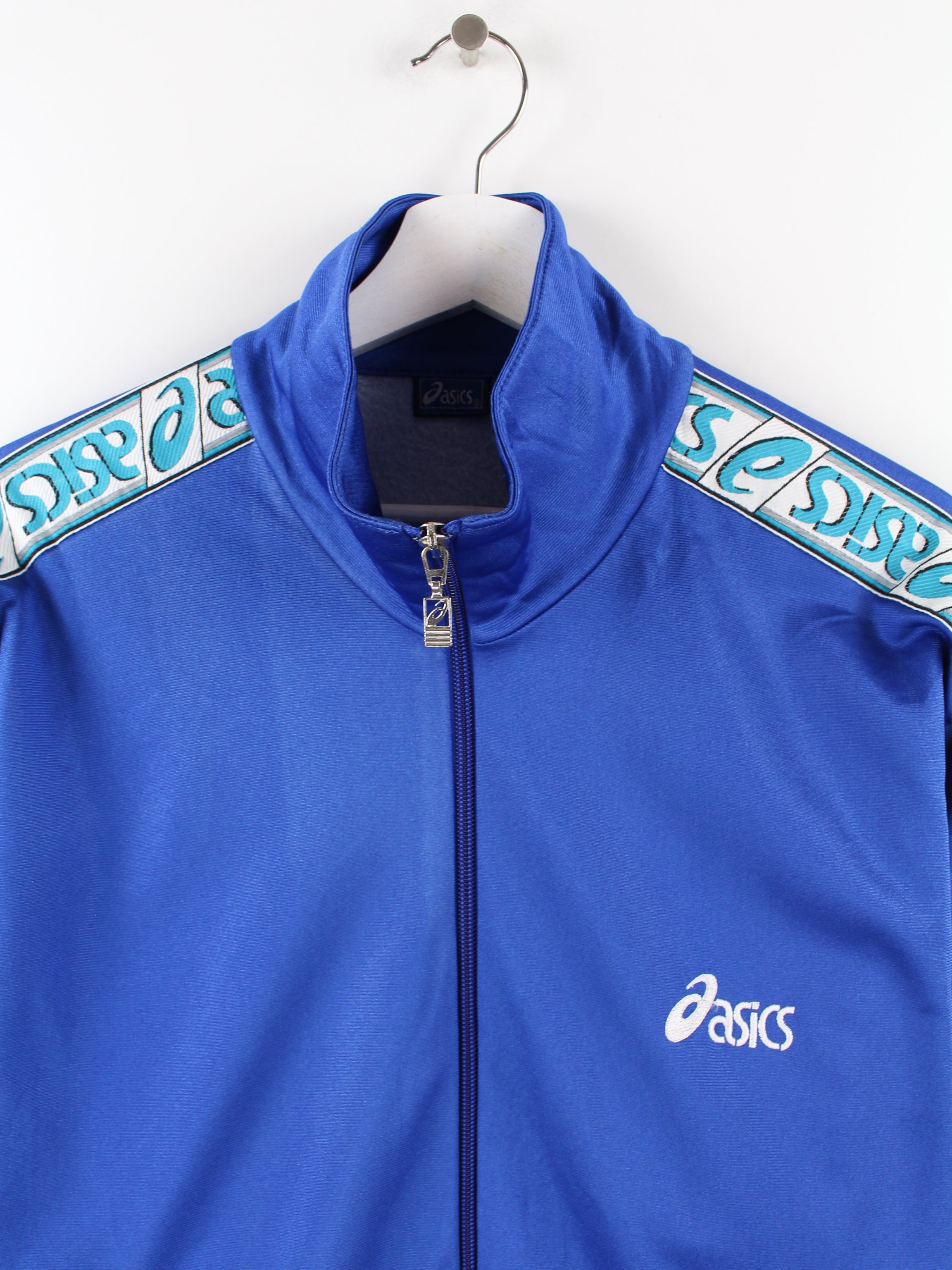 Blue Asics training jacket with tape sleeves.