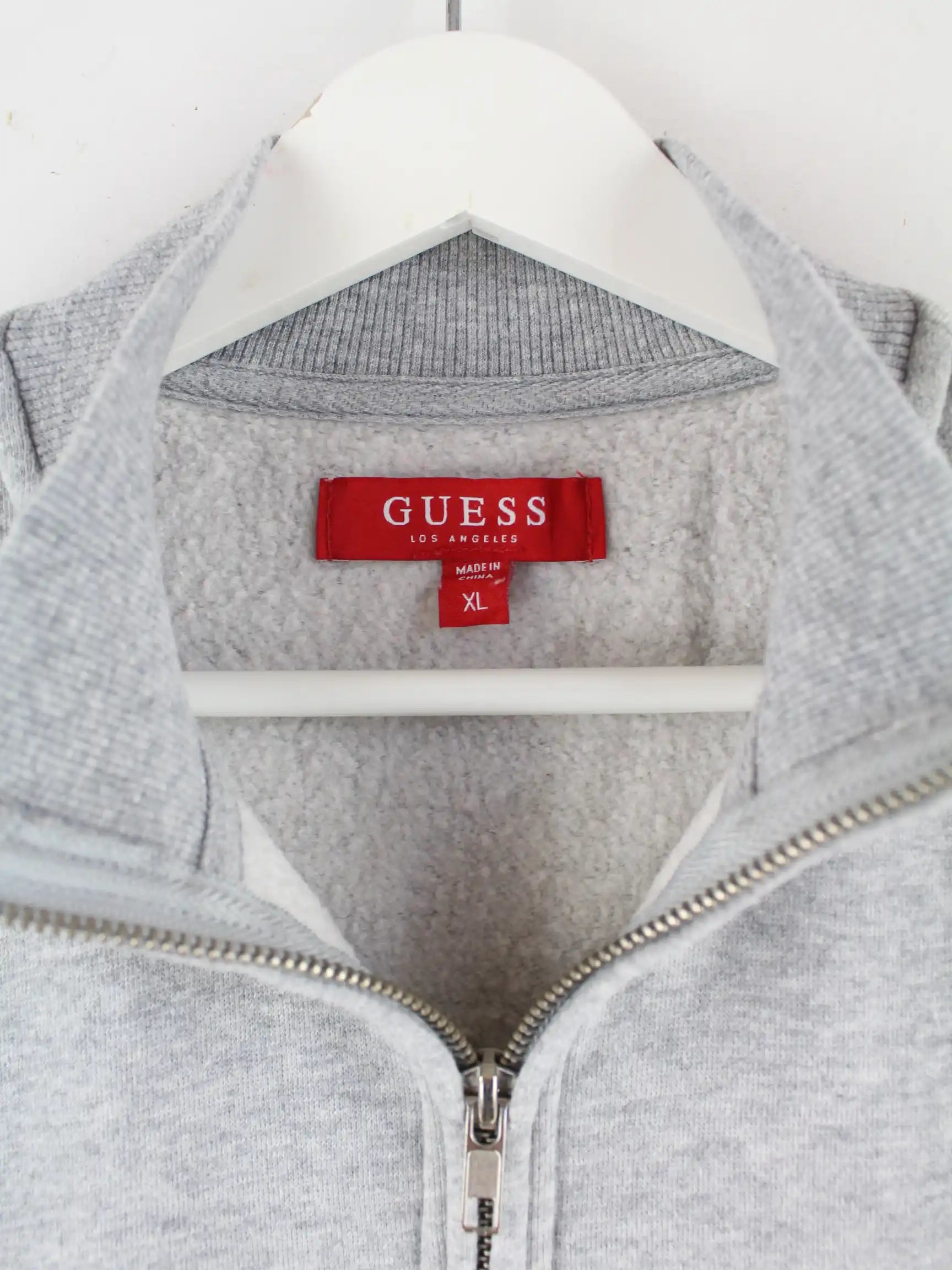 Grauer Sweater mit gesticktem Logo und half Zip vom Brand Guess in Größe XL. Er ist aus Leder gefertigt und in sehr gutem Zustand in Stock.