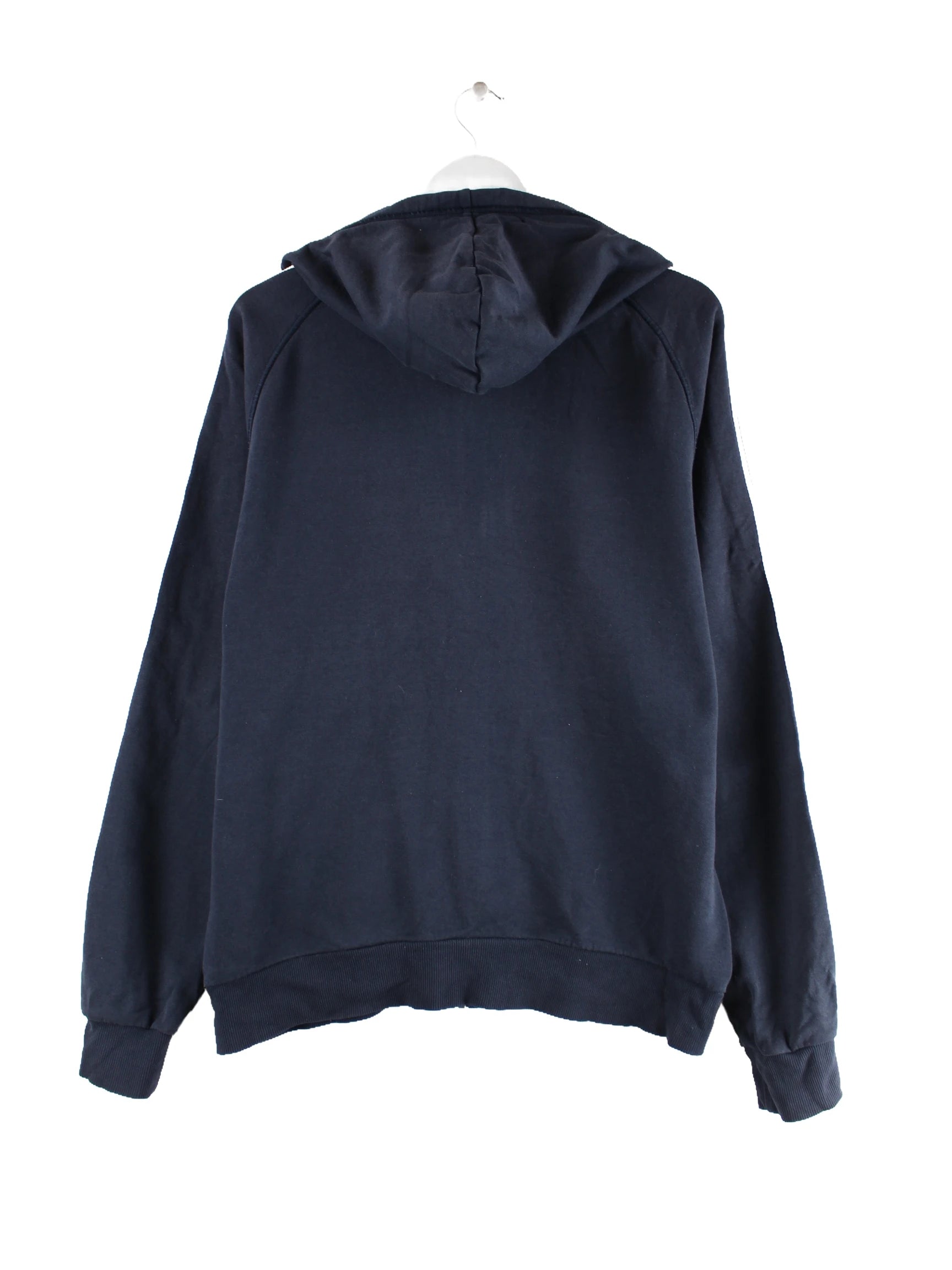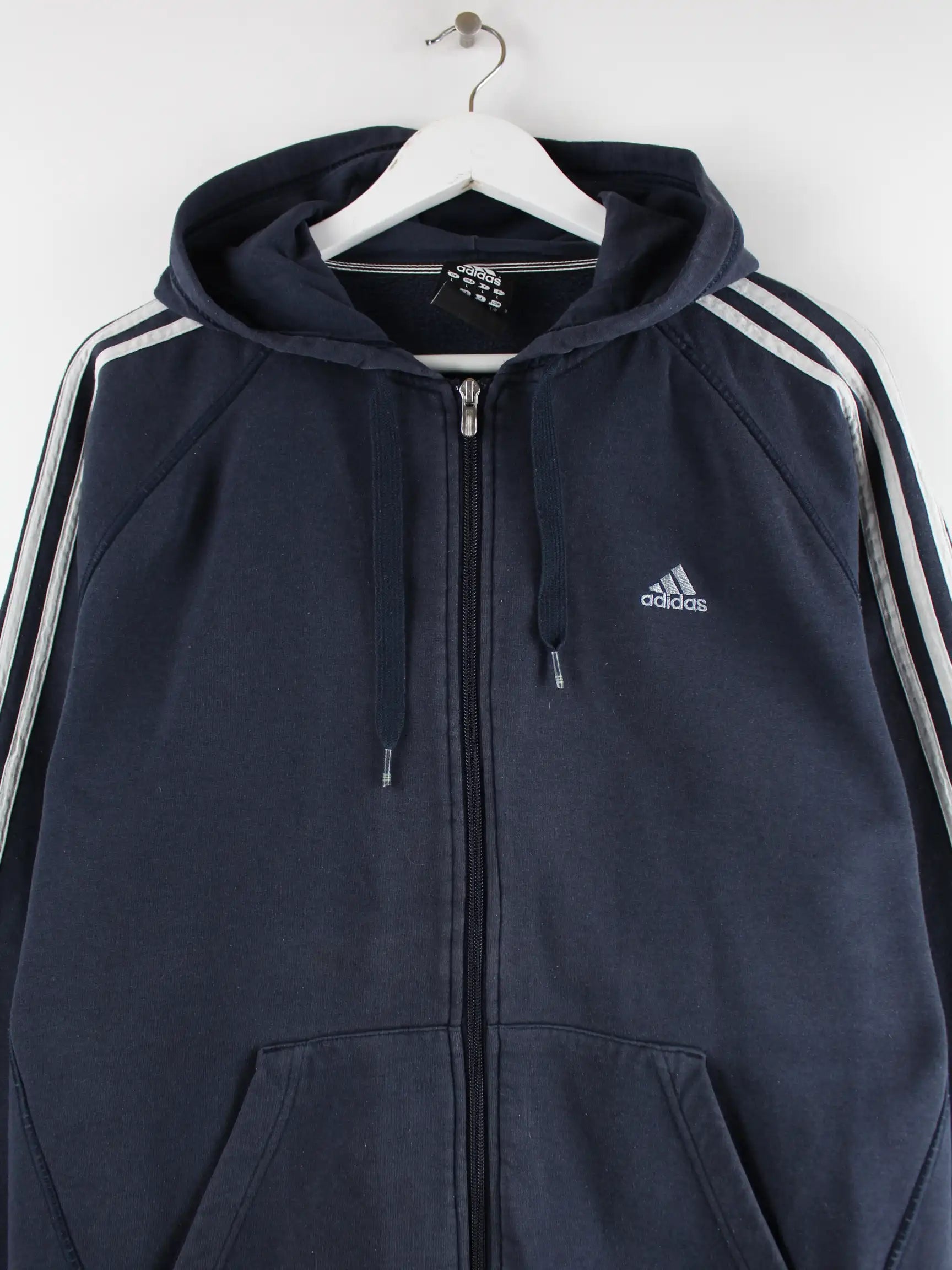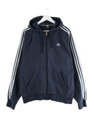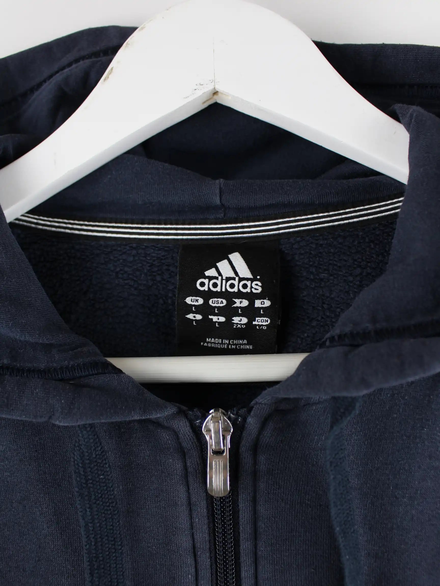 Blauer Hoodie mit Zip von Adidas in Größe L. Er ist aus einer Baumwollmischung gemacht und in sehr gutem Zustand vorrätig.