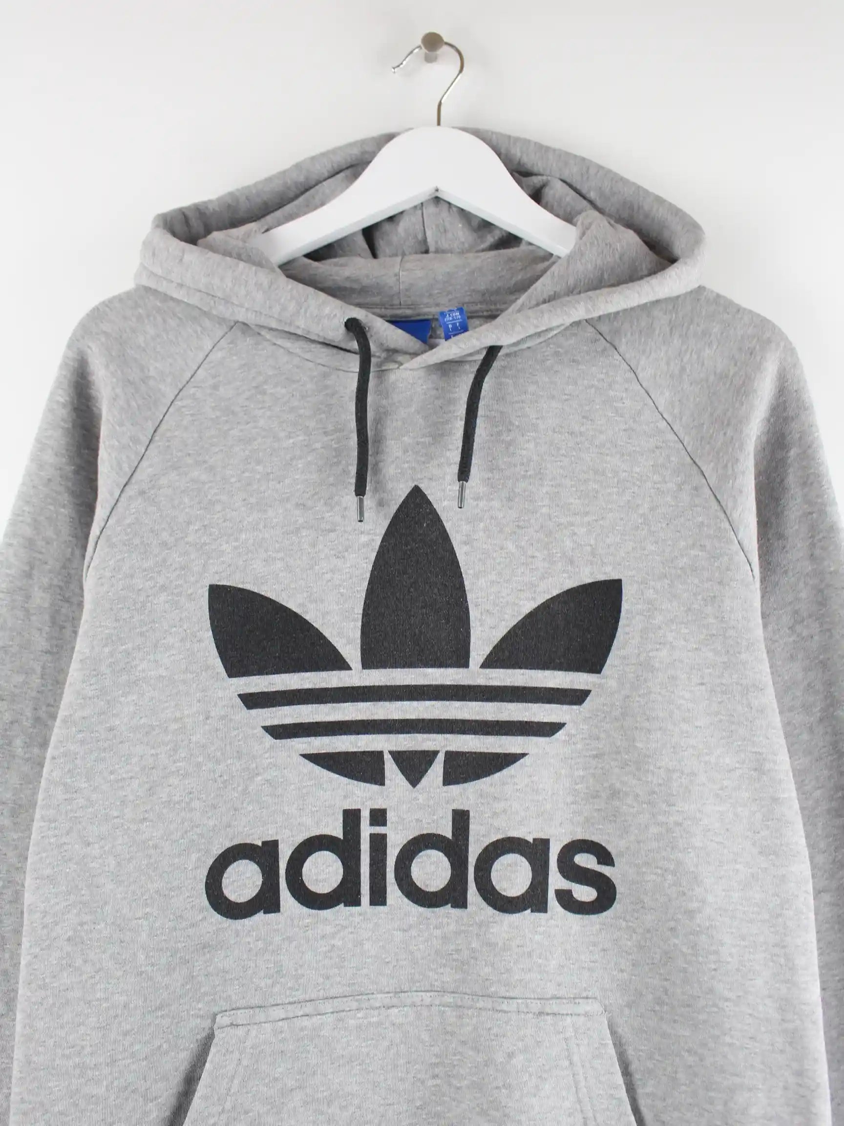 Grauer Hoodie der Marke Adidas in Größe L. Er ist aus einer Baumwollmischung hergestellt und in sehr gutem Zustand bei uns vorrätig.