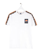 Weißes T-Shirt vom Brand Ellesse in Größe M. Es ist aus Baumwolle gefertigt und in sehr gutem Zustand bei uns vorrätig. Mit schickem Print.