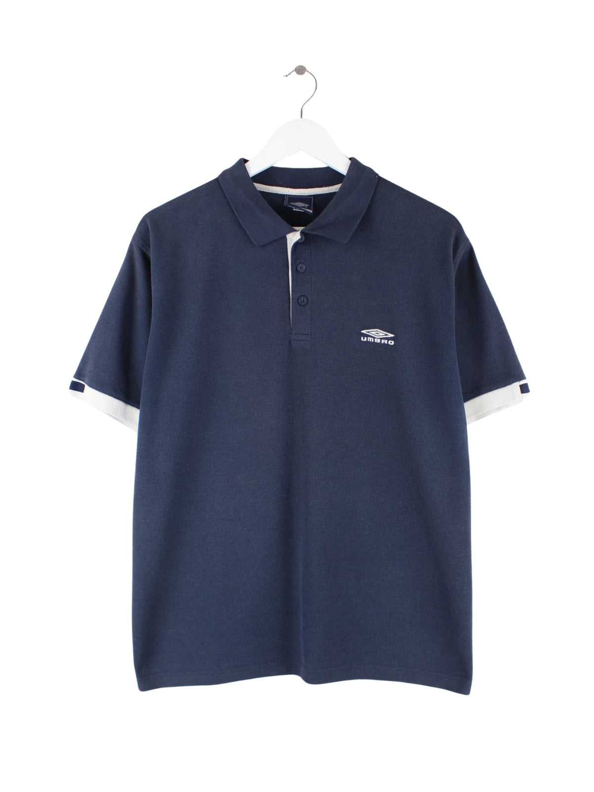 Poloshirt der Marke Umbro in Größe L. Es ist aus Baumwolle gefertigt und in Blau zu bekommen.