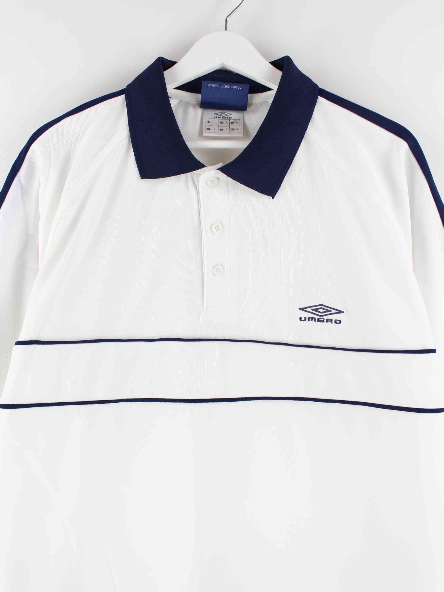 Polo shirt from the Umbro brand in size XL from the 90s. It is made of synthetic material and is available in white.