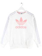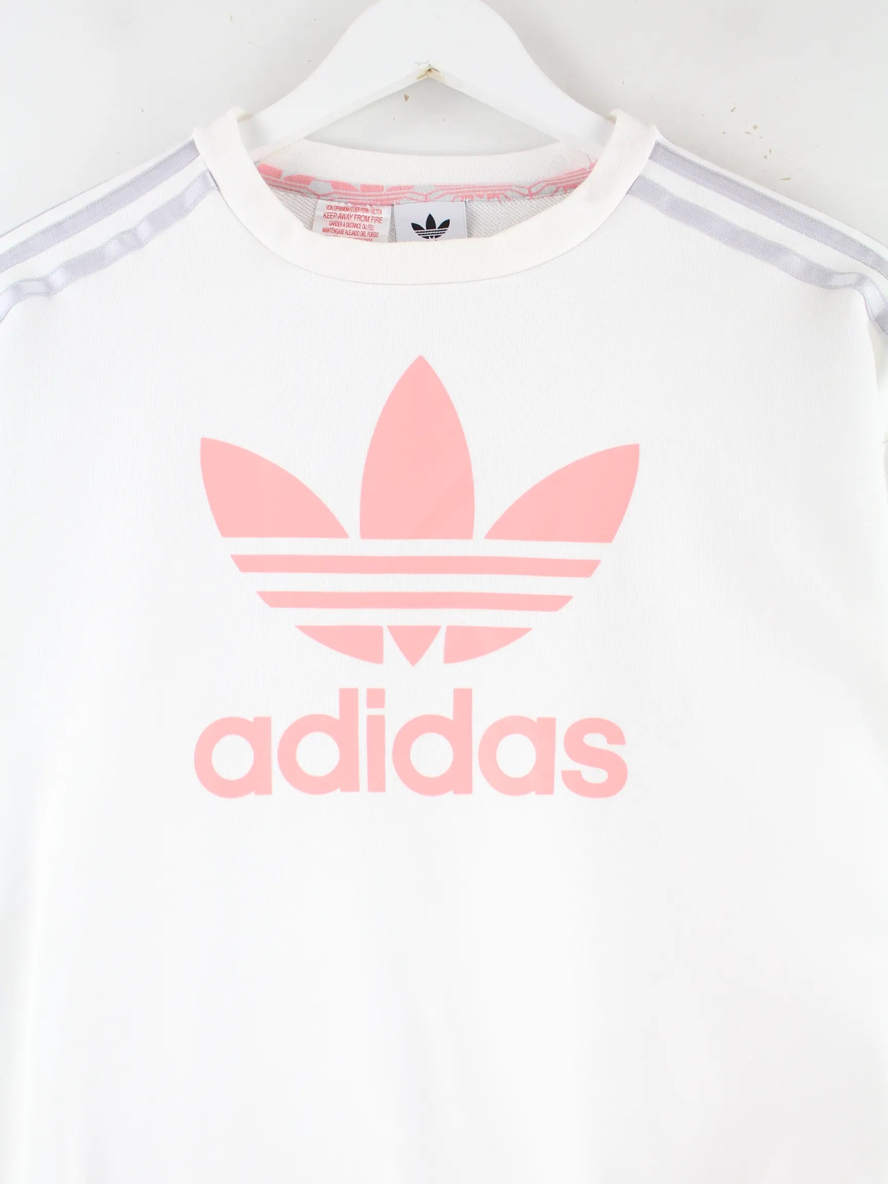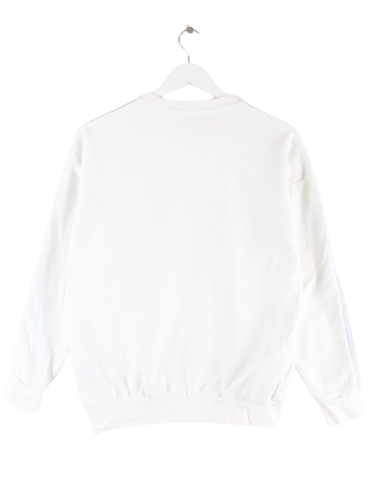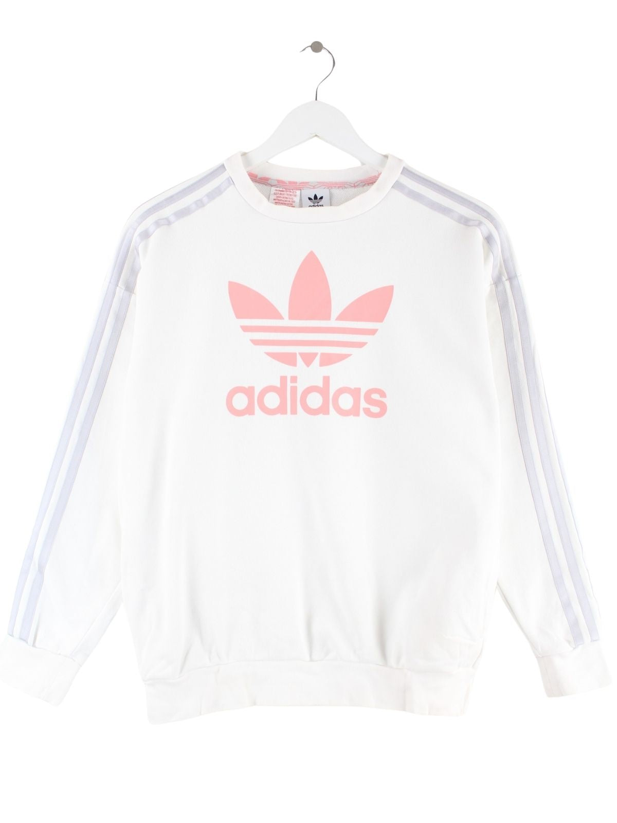 Weißer Sweater vom Brand Adidas in Größe S. Er ist aus einer Baumwollmischung gefertigt und in gutem Zustand bei uns zu bekommen. Mit chiquem Trefoil Print.