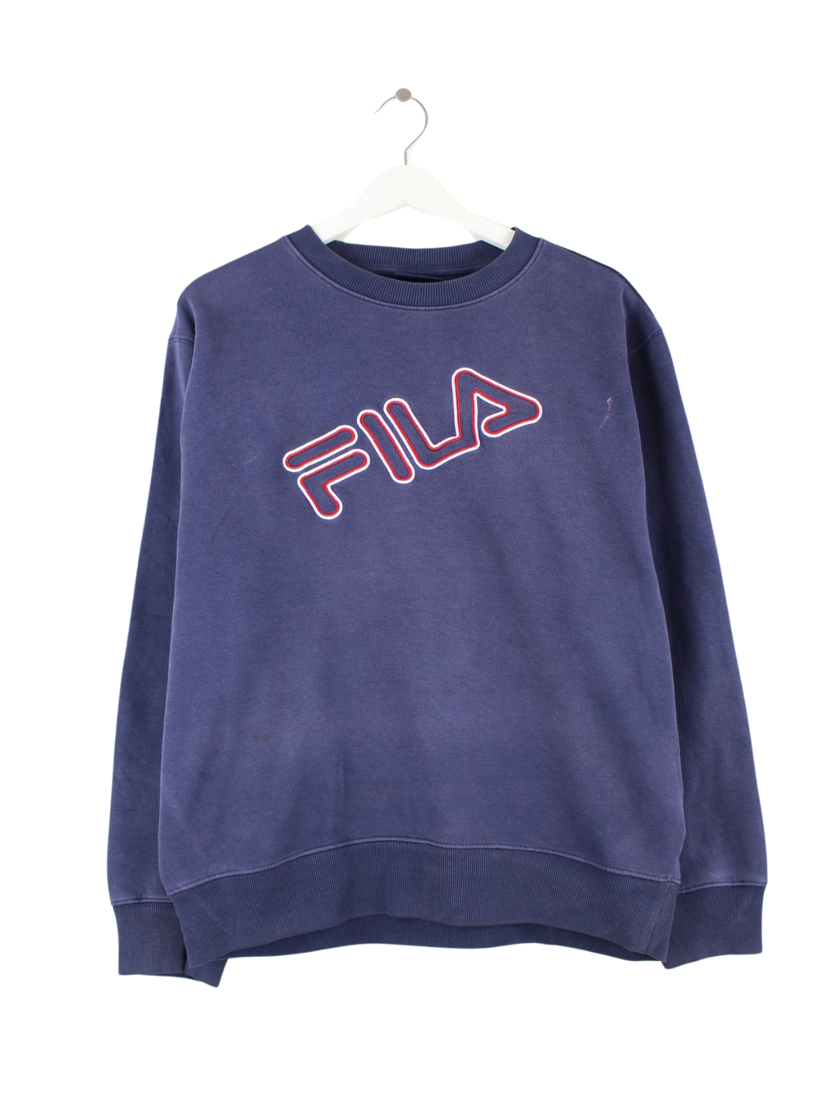 Blue sweater with embroidery from the label Fila in size L. It is made of a cotton blend and is in good condition in stock.