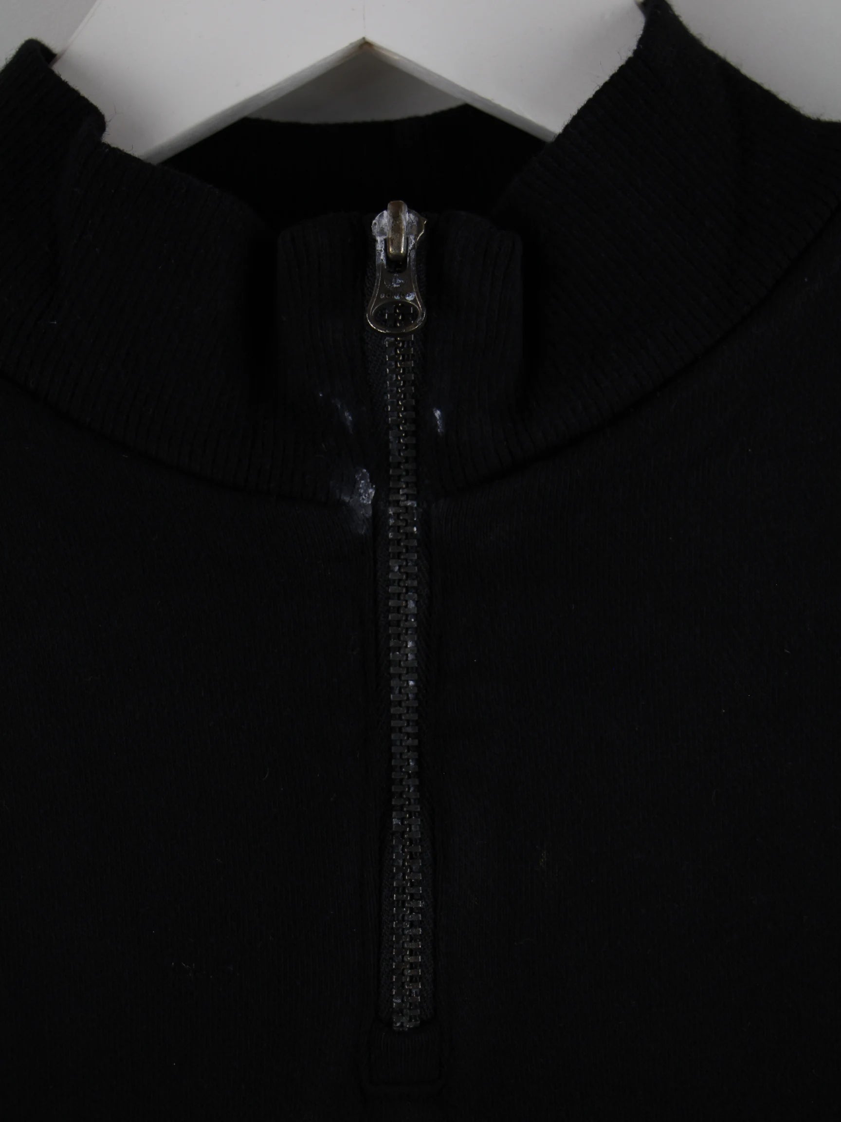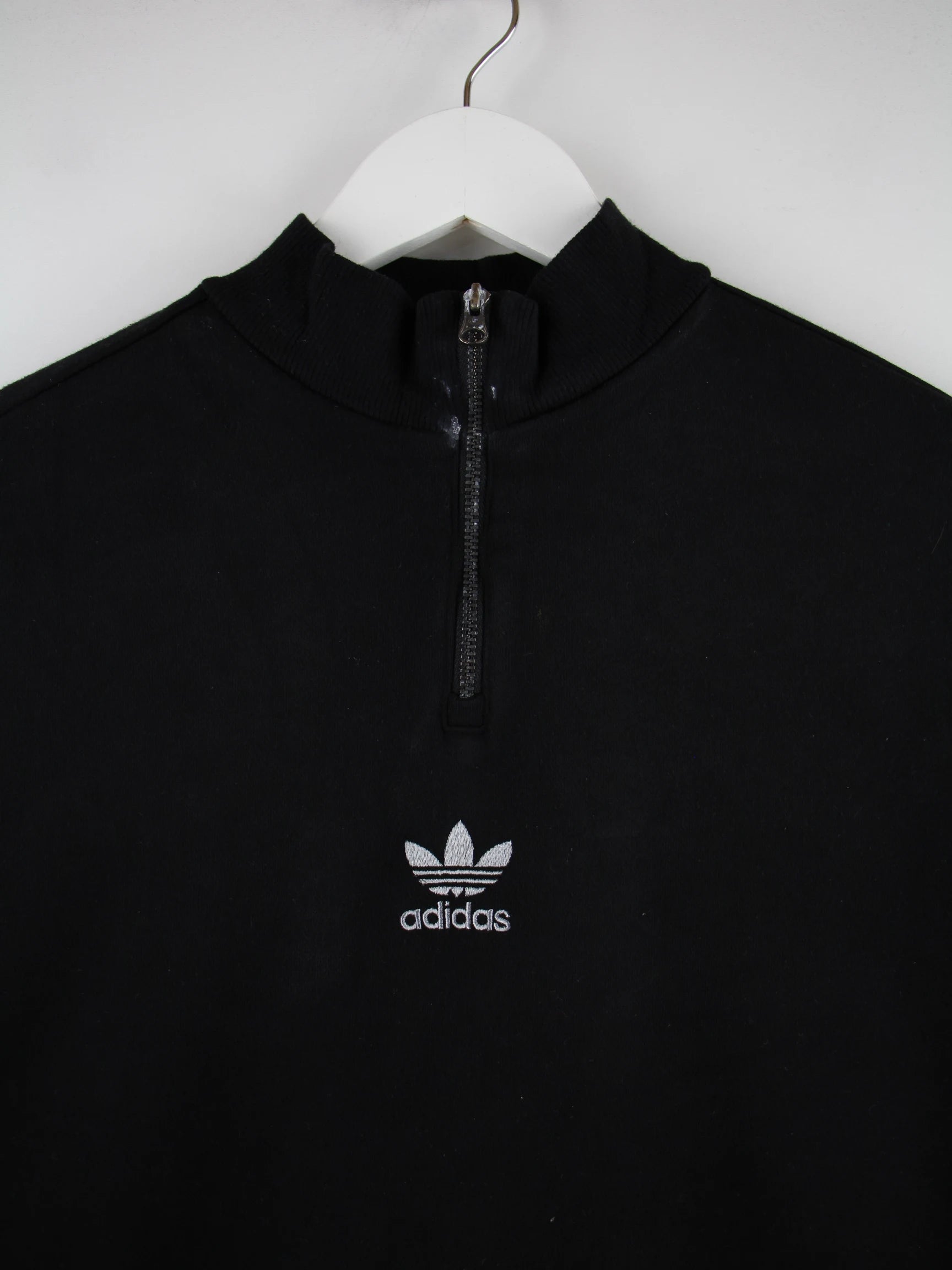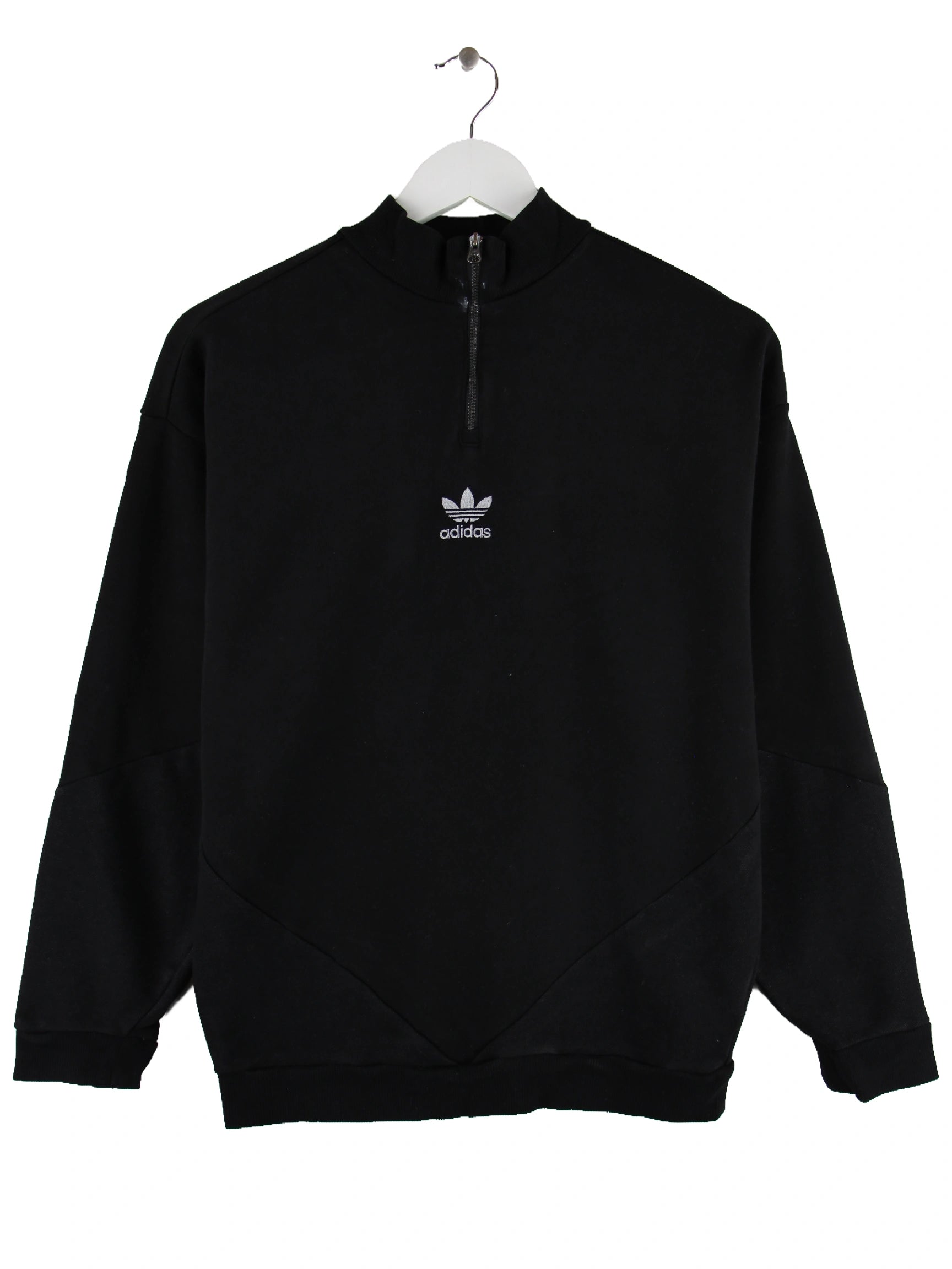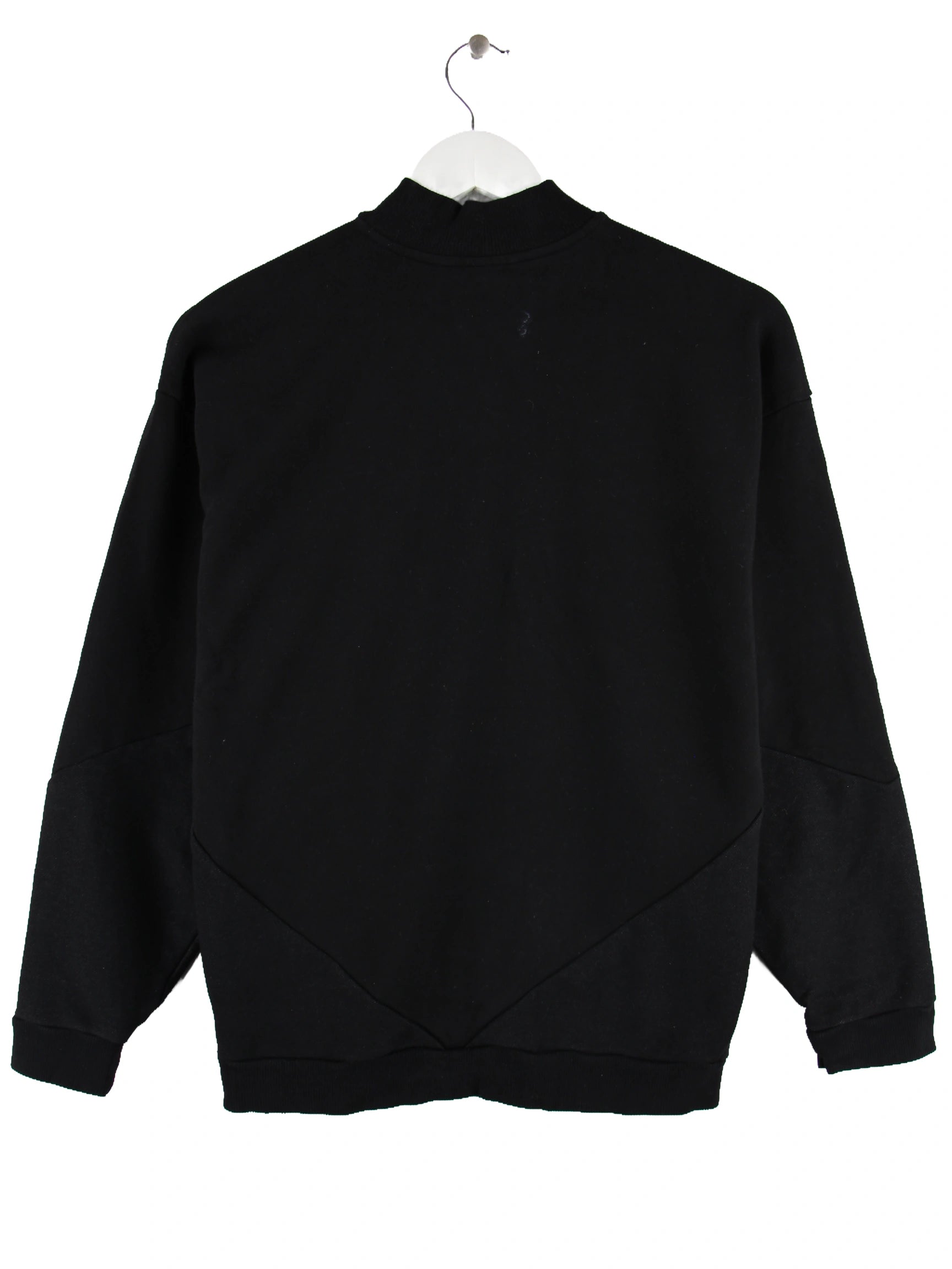 Schwarzer Sweater mit half Zip der Brand Adidas in Größe XS. Er ist aus einer Baumwollmischung hergestellt. Den Zustand würden wir als 'In Ordnung' bezeichnen (vergl. Bilder).