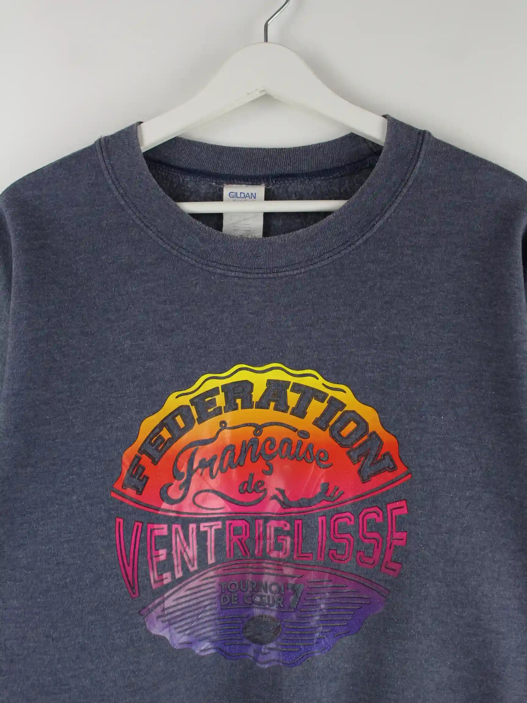 Sweater der Marke Gildan in Größe XL. Er ist aus einer Baumwollmischung hergestellt und in Grau in Stock. Mit schickem Ventriglisse Print.