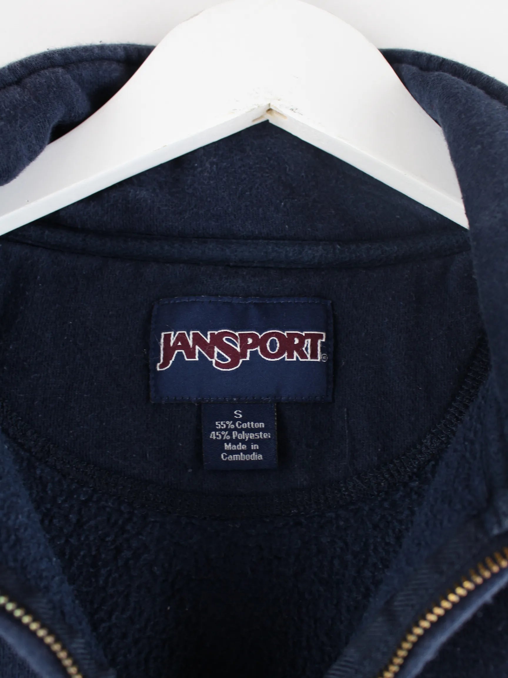 Blauer Sweater mit halbem Reißverschluß aus dem Hause Jansport in Größe S. Er ist aus einer Baumwollmischung produziert und in gutem Zustand lieferbar.