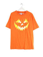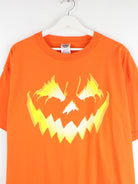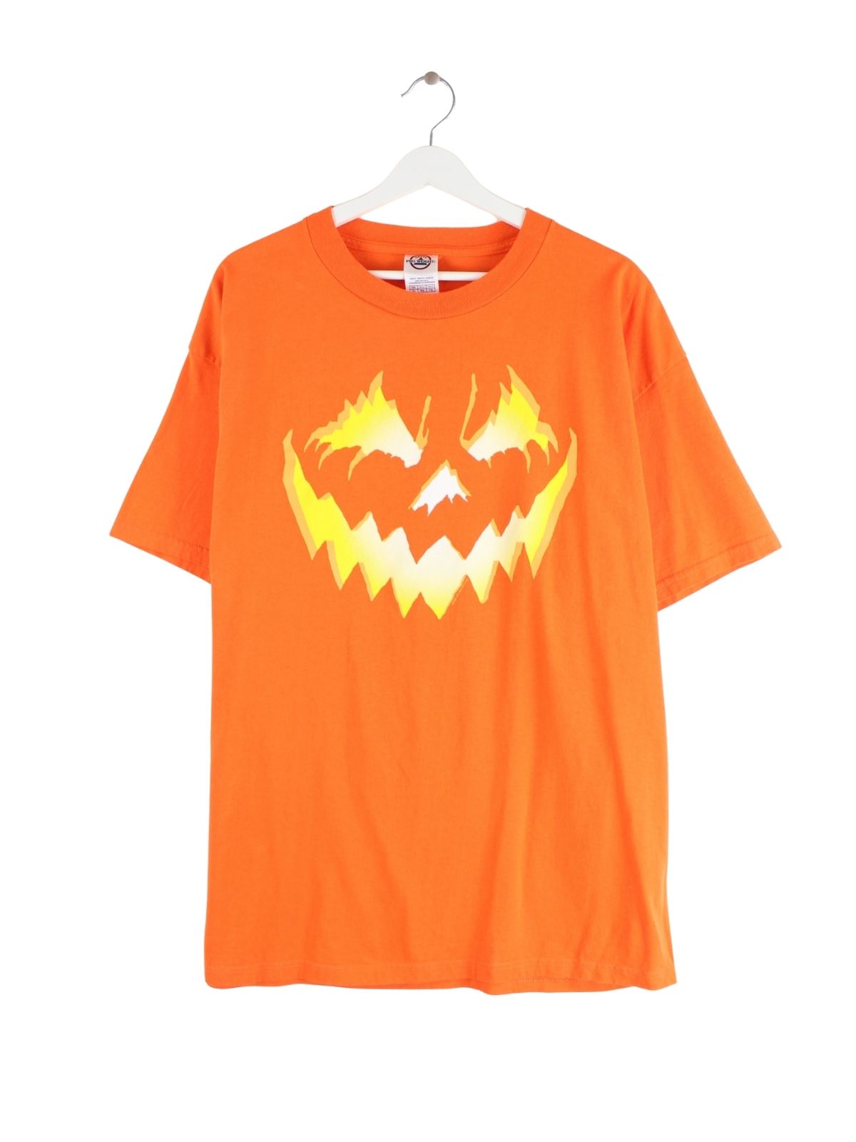 T-Shirt der Brand Delta in Größe XL. Es ist aus einer Baumwollmischung und in Orange im Bestand. Mit schönem Halloween Print.