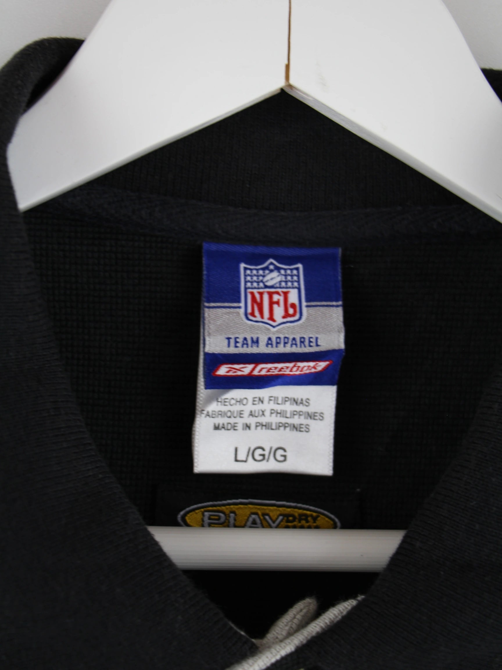 Schwarzes Poloshirt der Marke NFL in Größe L. Es ist aus Baumwolle produziert und in gutem Zustand bei uns vorrätig.