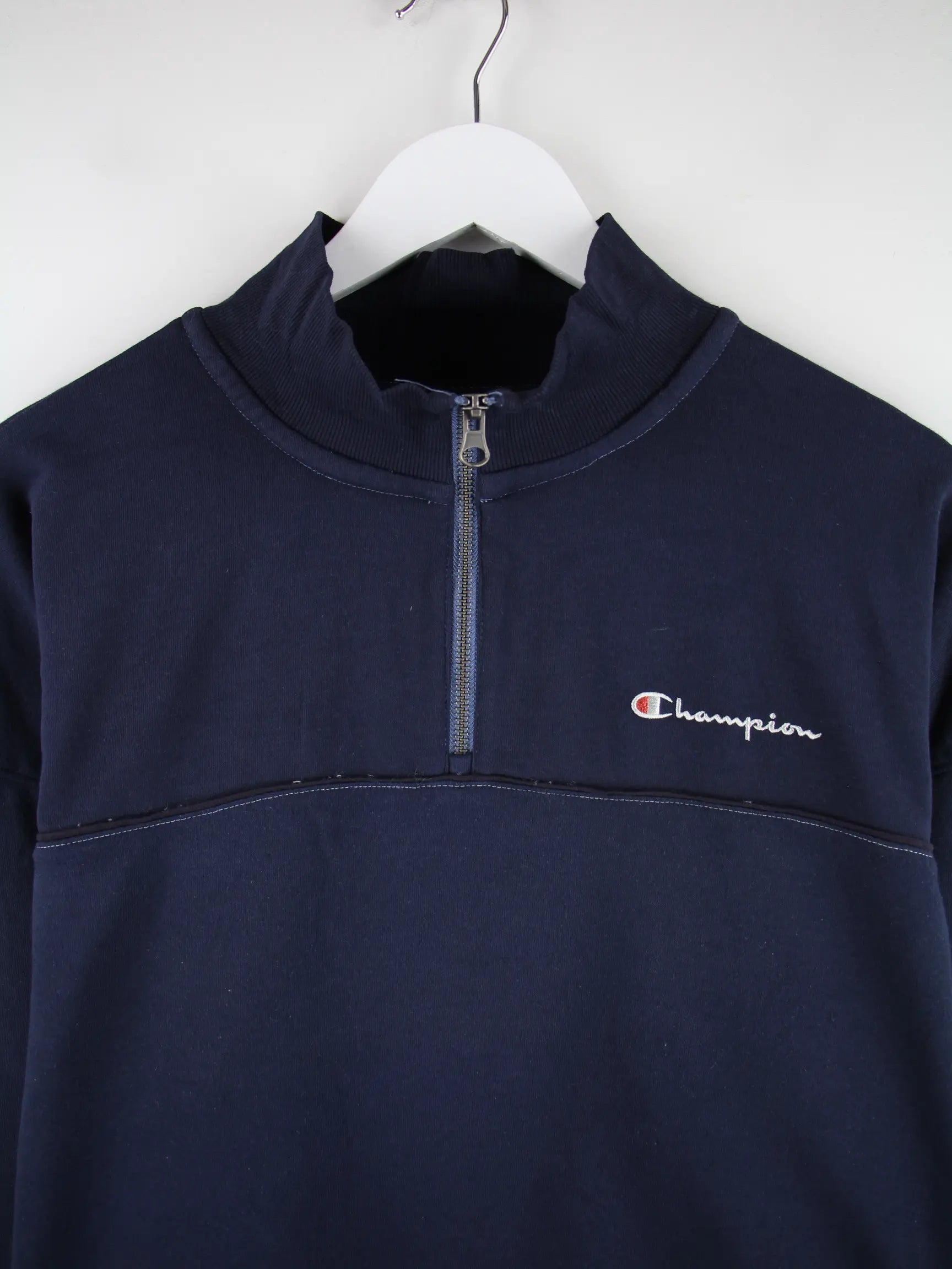 Sweater des Labels Champion mit kurzem Reißverschluß in Größe L. Er ist aus einer Baumwollmischung und in Blau bei uns zu bekommen.