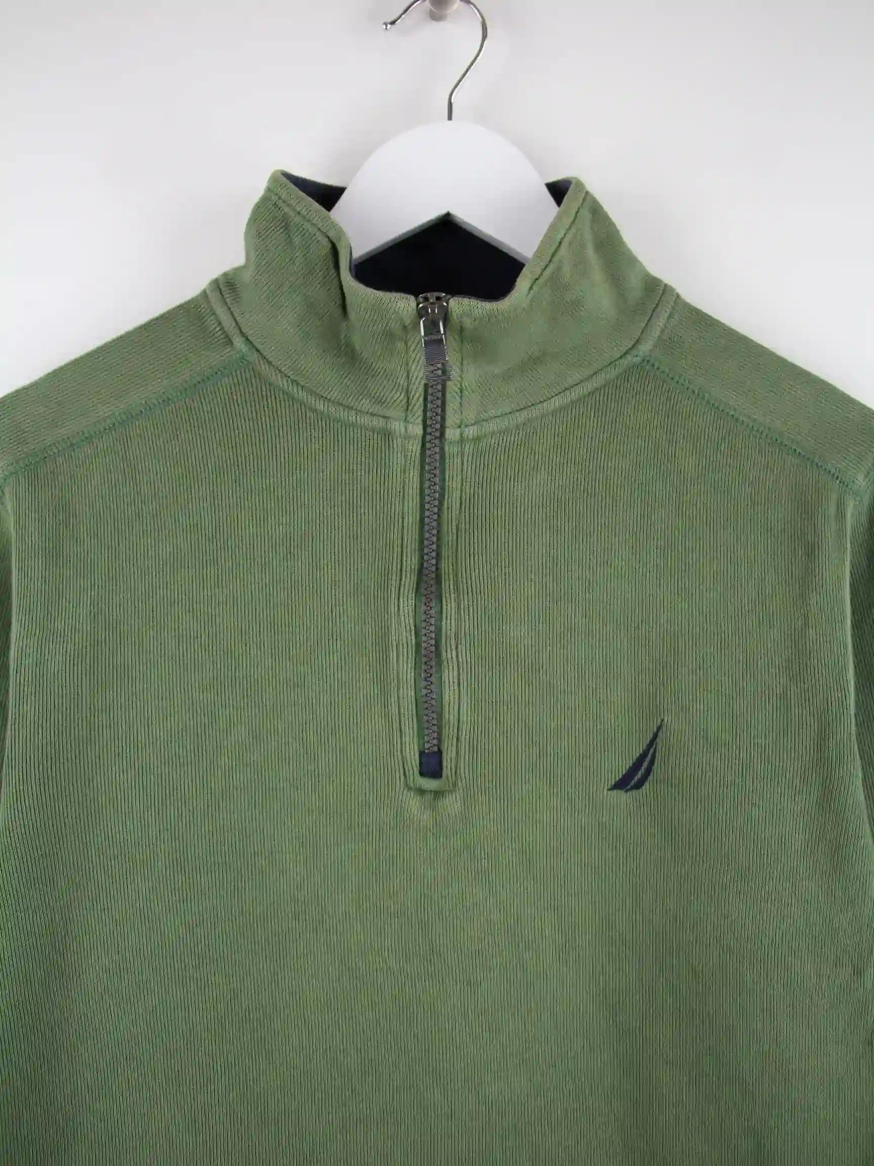 Grüner Sweater mit halbem Reißverschluß vom Label Nautica in Größe S. Er ist aus einer Baumwollmischung produziert und in sehr gutem Zustand auf Lager.