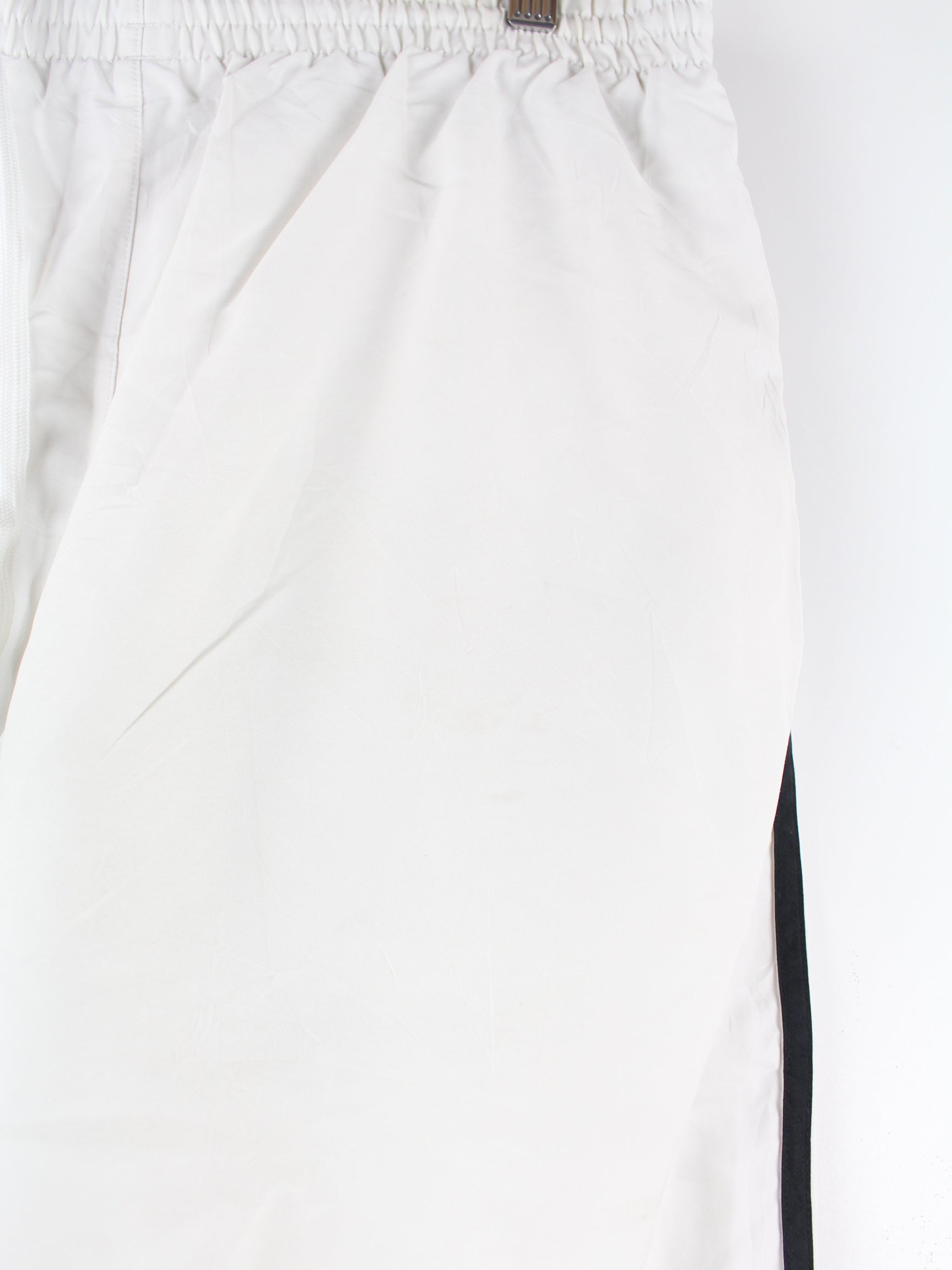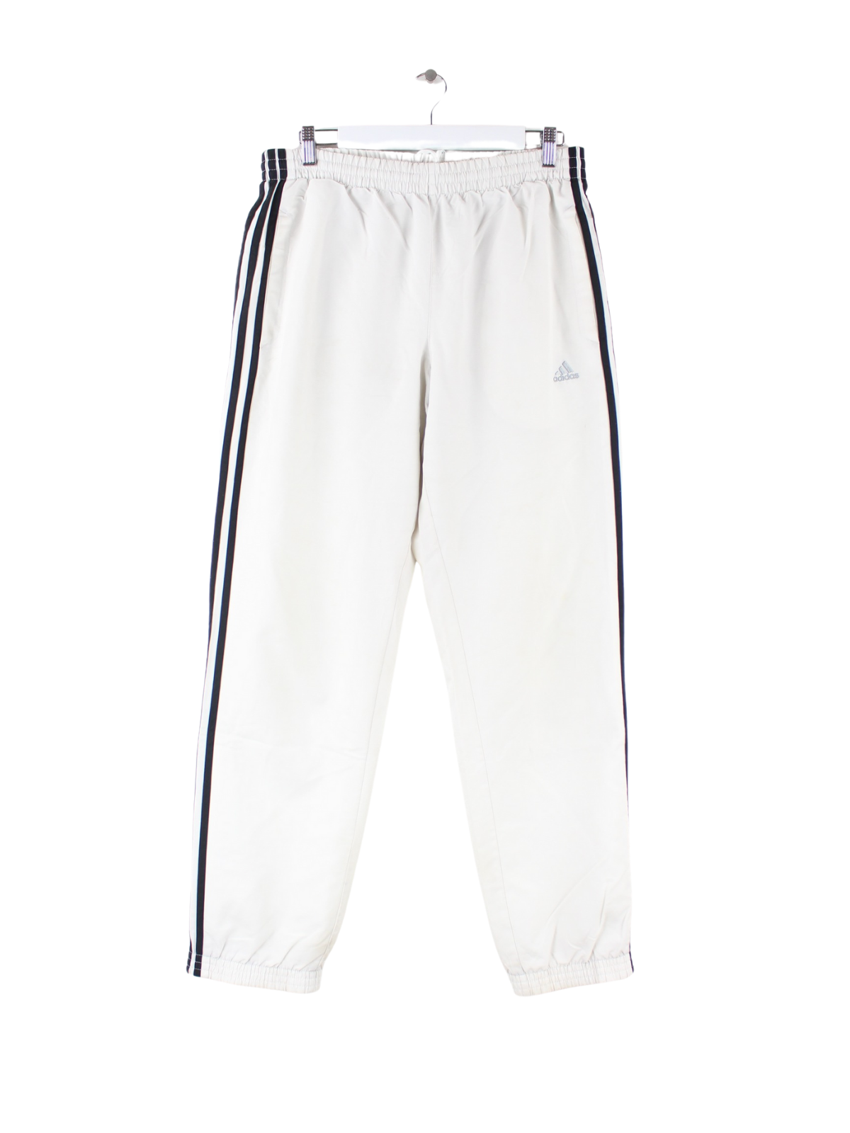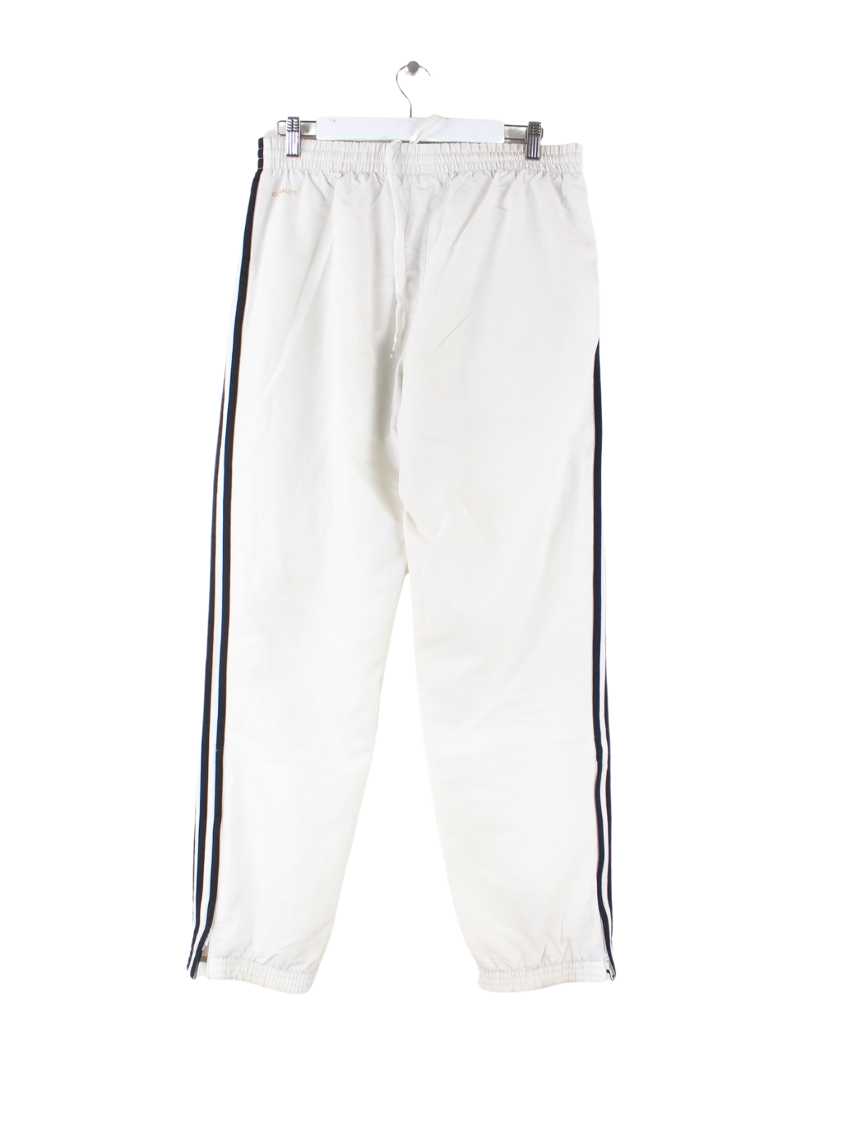 Weiße Track Pants der Brand Adidas in Größe L. Sie sind aus Synthetik produziert. Den Zustand würden wir als 'In Ordnung' bezeichnen (vergl. Bilder).