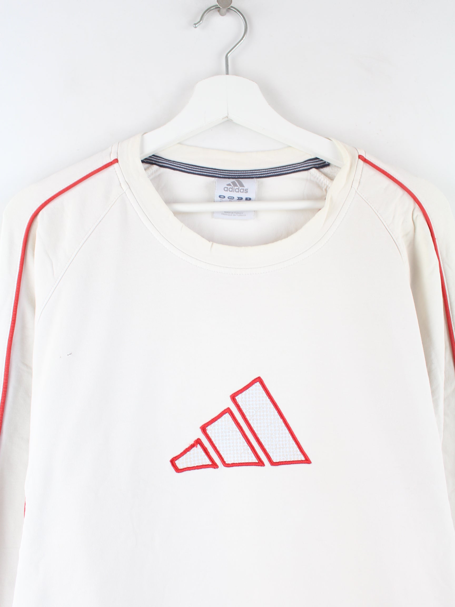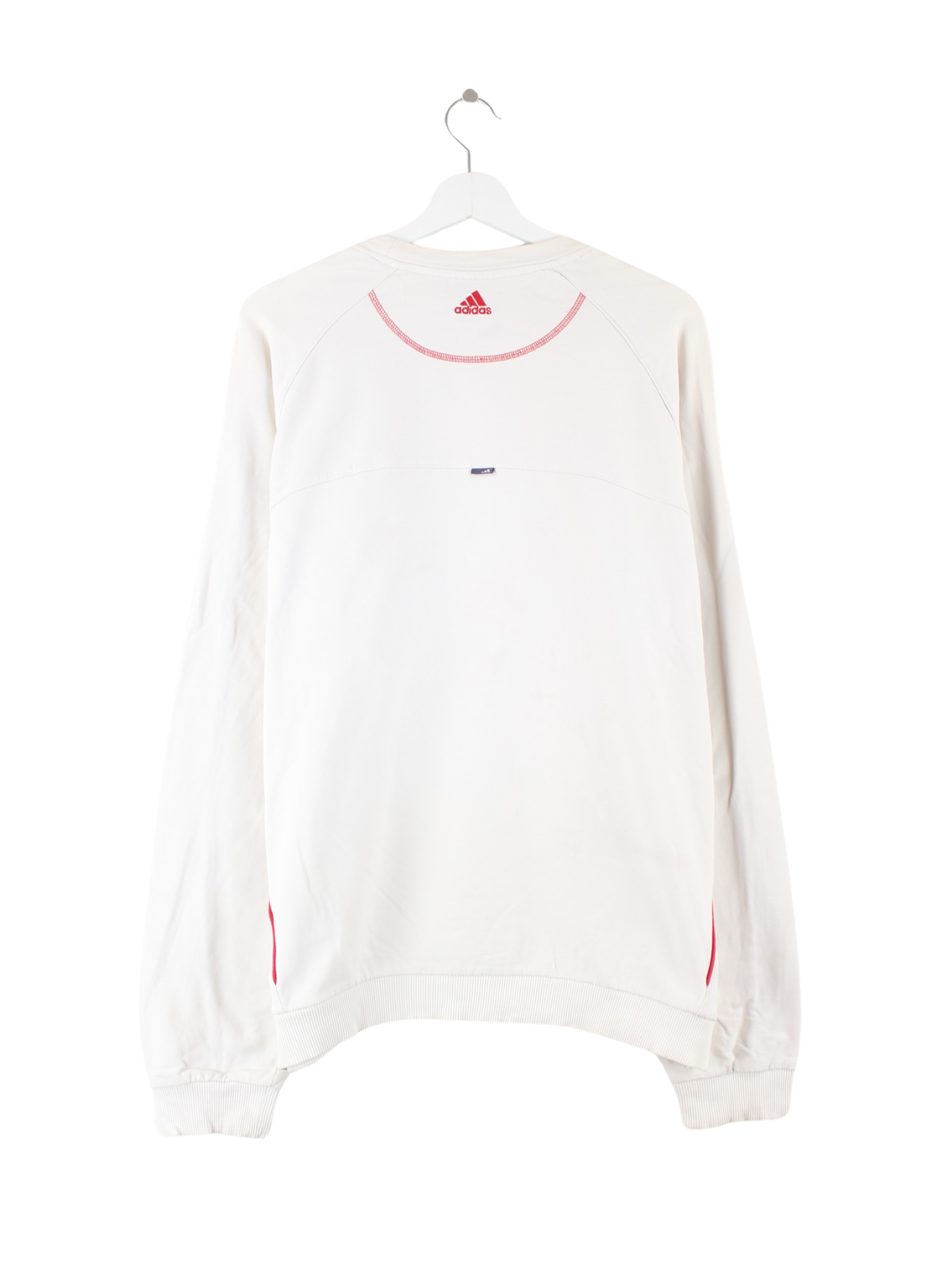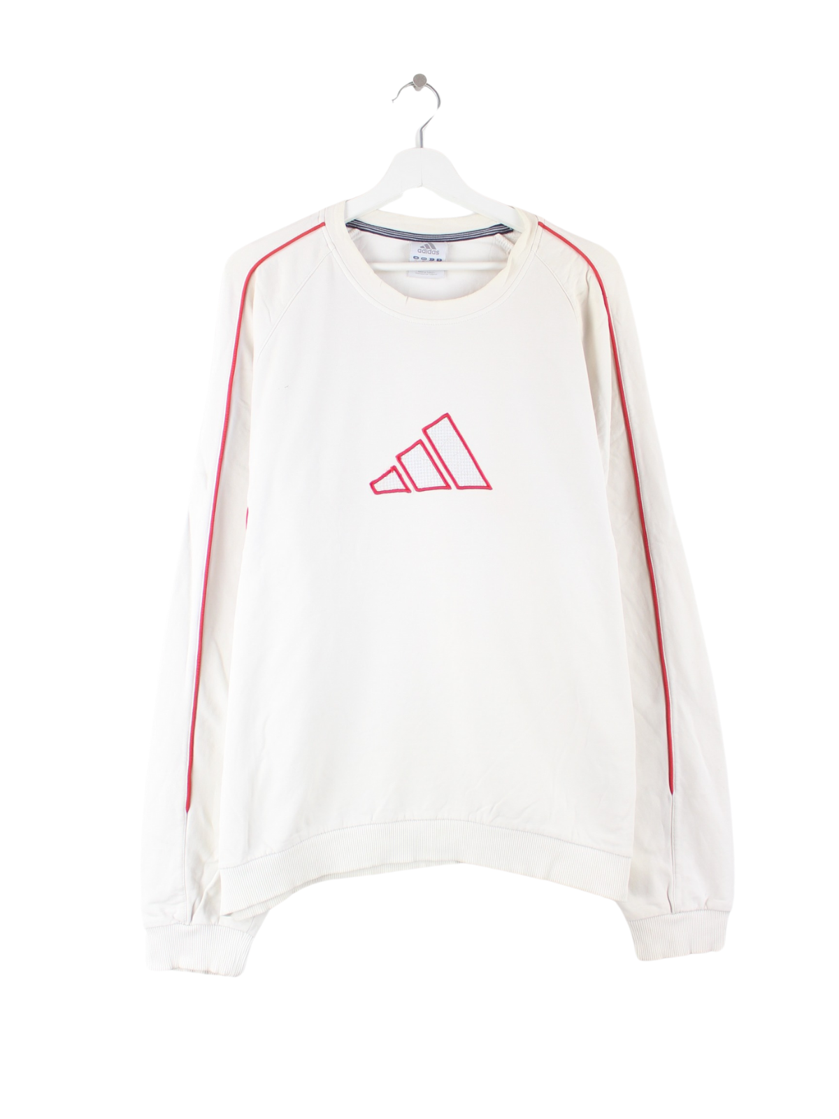 White sweater with embroidered motifs from the Adidas brand in size XL. It is made from a cotton blend and is in stock in good condition.
