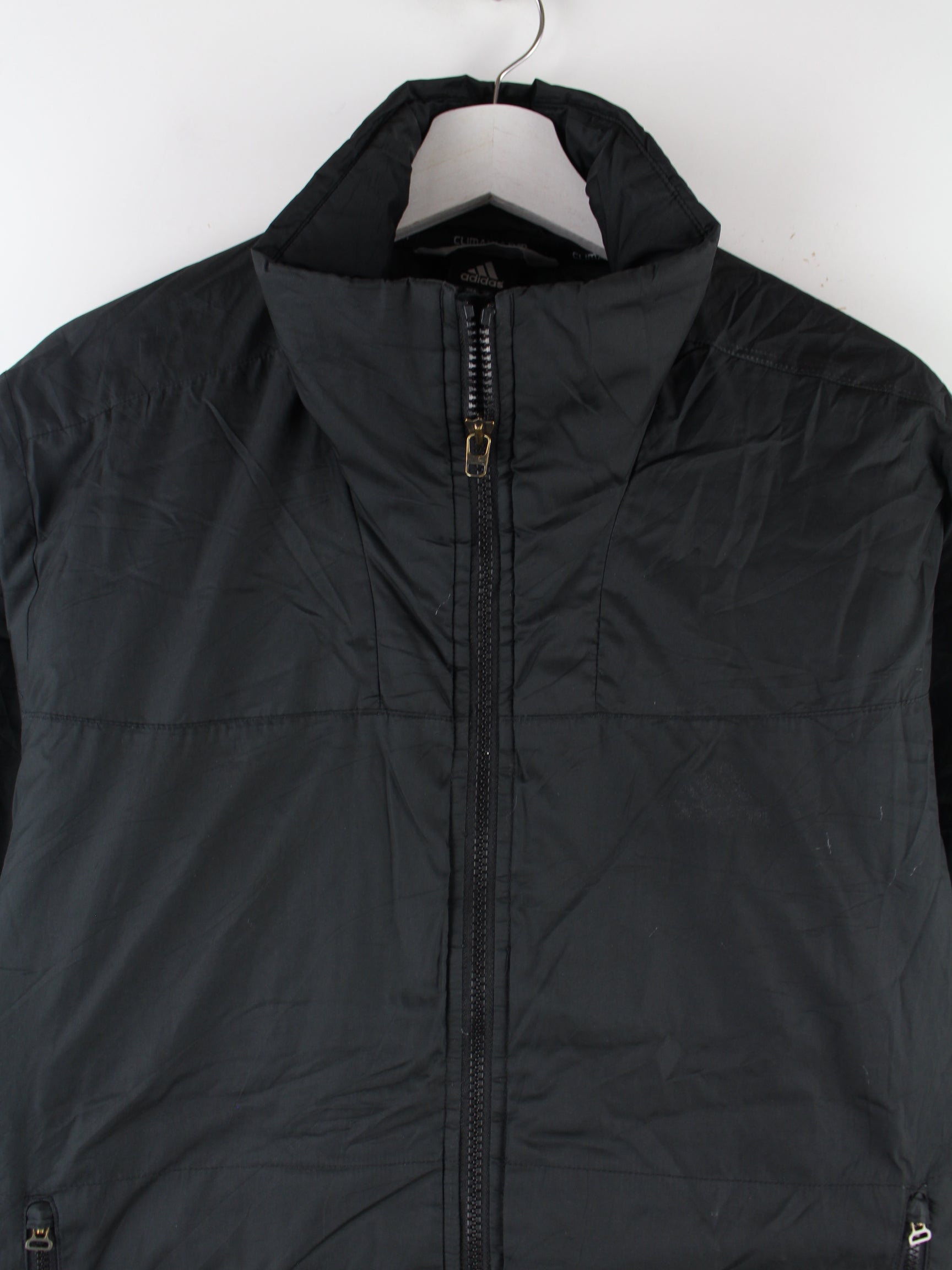 Jacke der Marke Adidas in Größe M. Sie ist aus Synthetik gefertigt und in Schwarz zu haben.