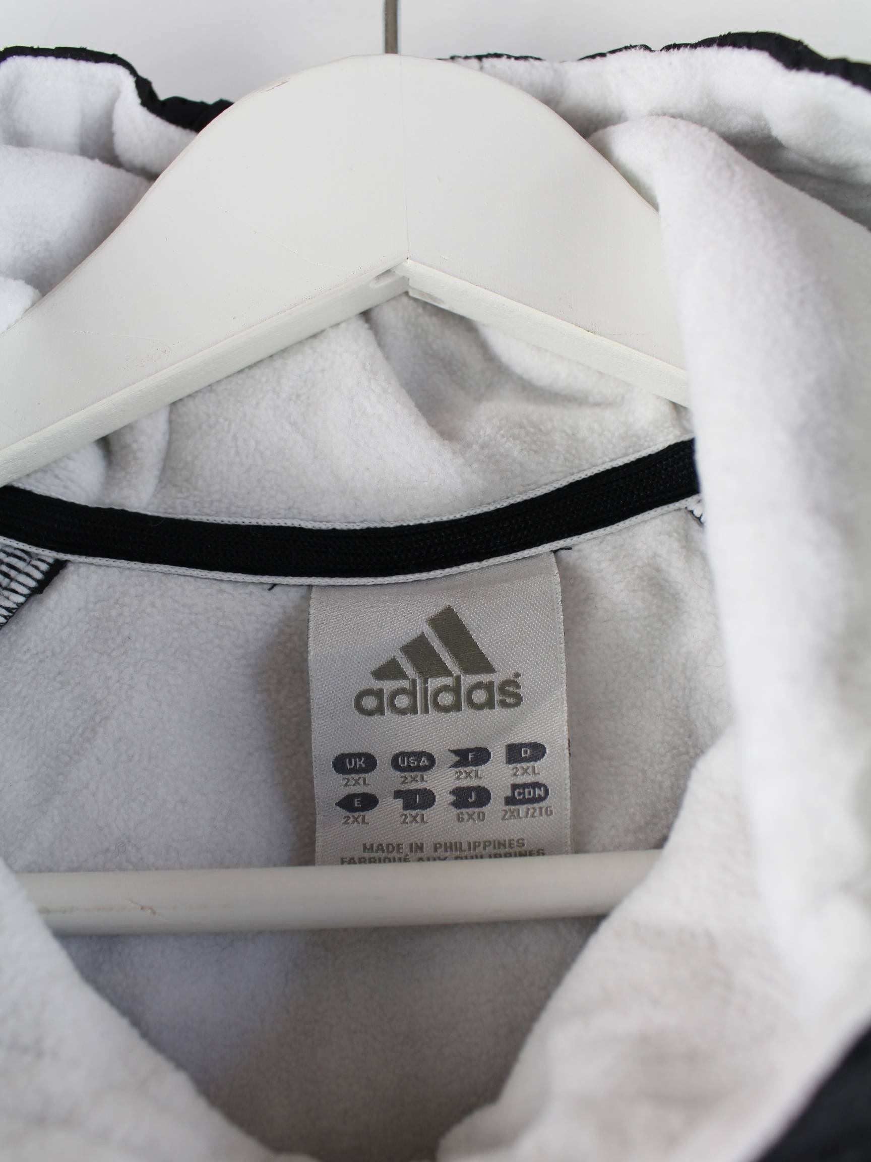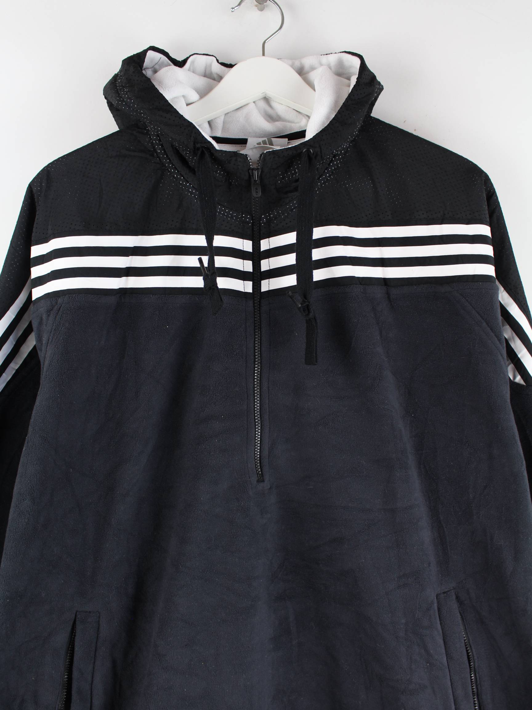 Schwarzer Hoodie mit half Zip der Brand Adidas in Größe XXL. Er ist aus gemütlichem Fleece produziert. Den Zustand würden wir als 'In Ordnung' bezeichnen (vergl. Bilder).