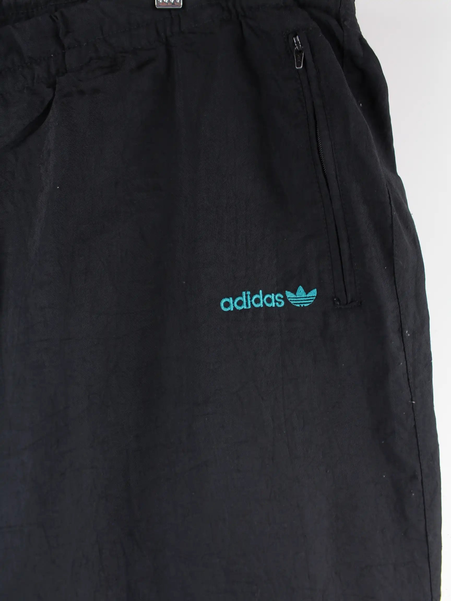 Schwarze Track Pants der Marke Adidas aus den 80'ern in Größe 3XL. Sie sind aus Synthetik gemacht. Den Zustand würden wir als 'In Ordnung' bezeichnen (vergl. Bilder).