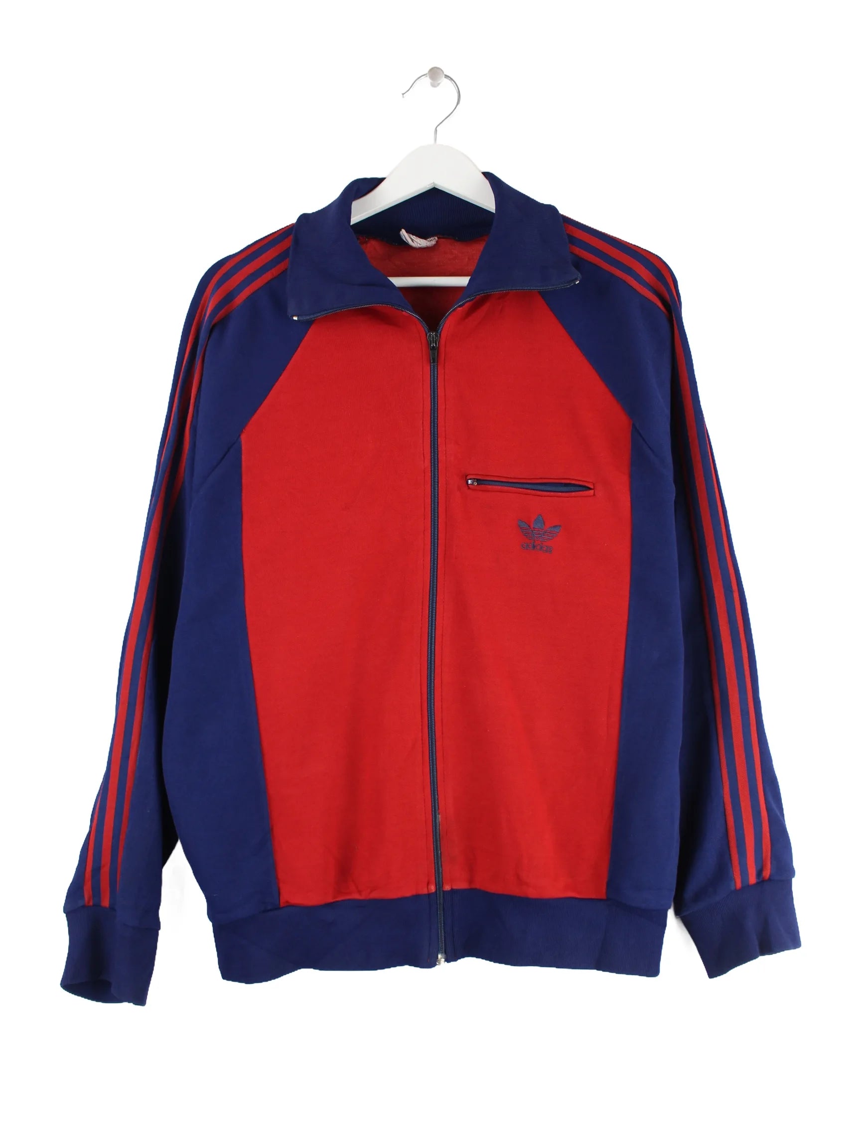 Trainingsjacke aus dem Hause Adidas in Größe M aus den 80'ern. Sie ist aus Synthetik gefertigt und in Rot in Stock.
