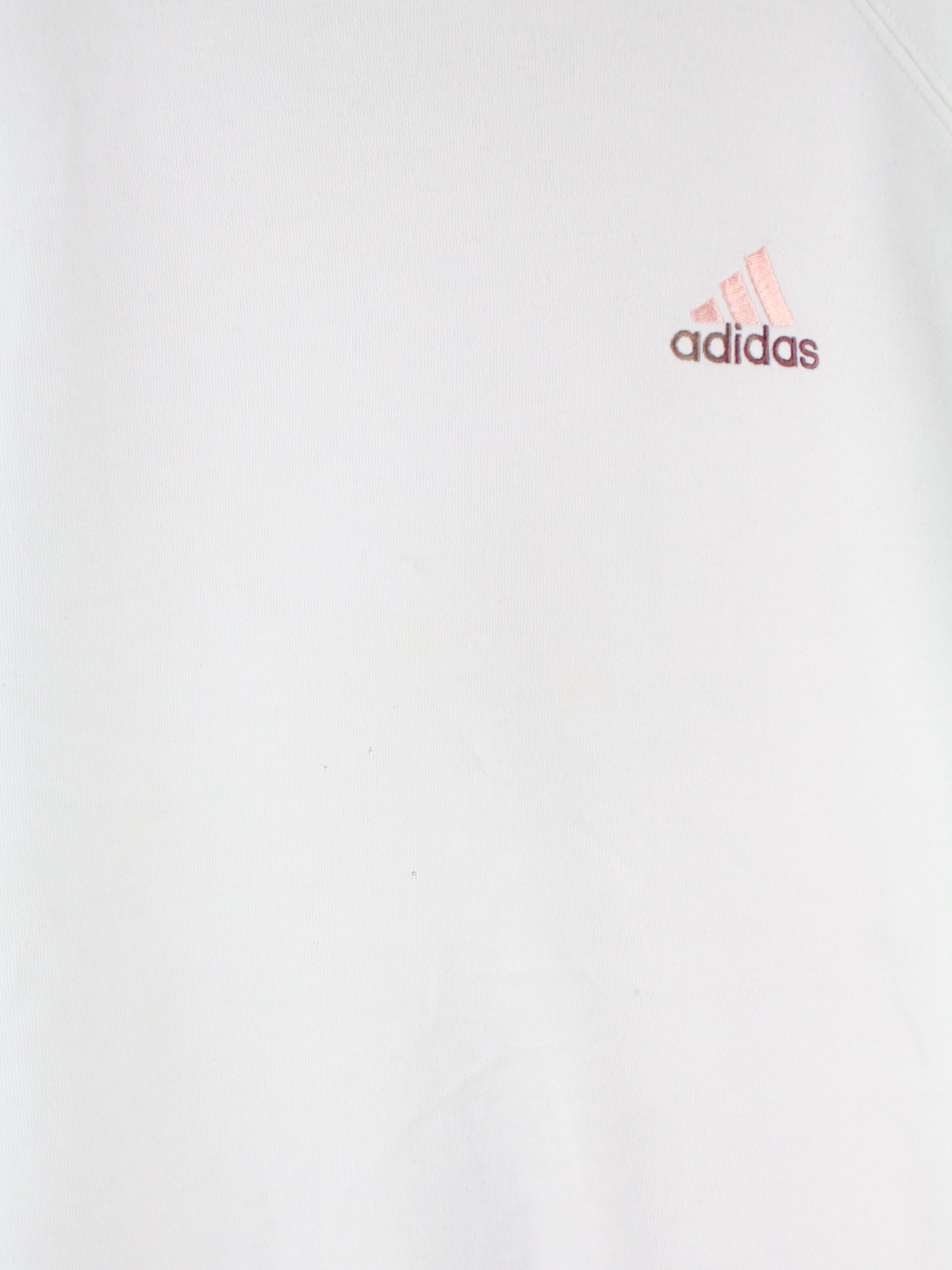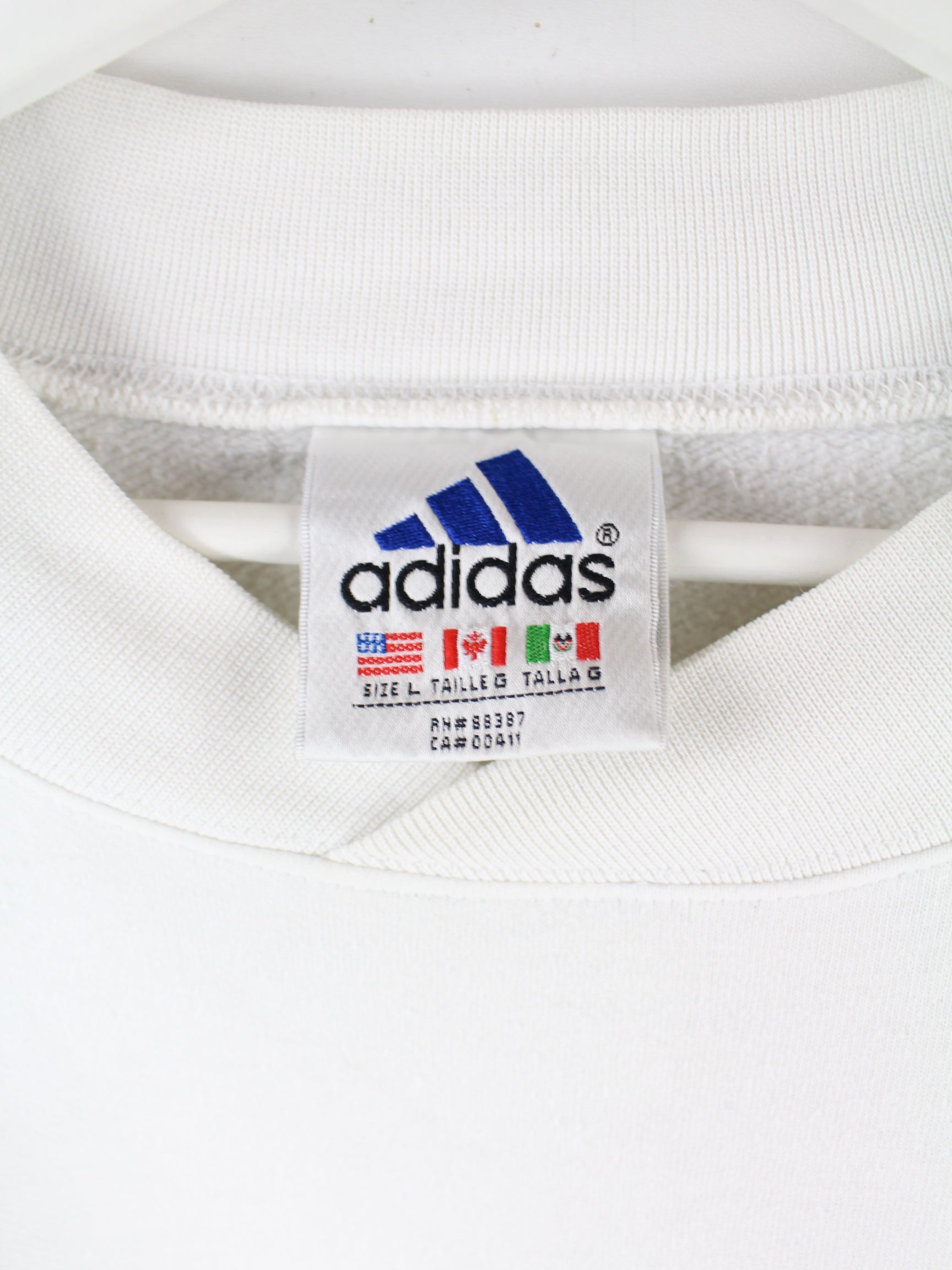 Weißer Sweater vom Brand Adidas aus den 90'ern in Größe L. Er ist aus einer Baumwollmischung gemacht. Den Zustand würden wir als 'In Ordnung' bezeichnen (vergl. Bilder).
