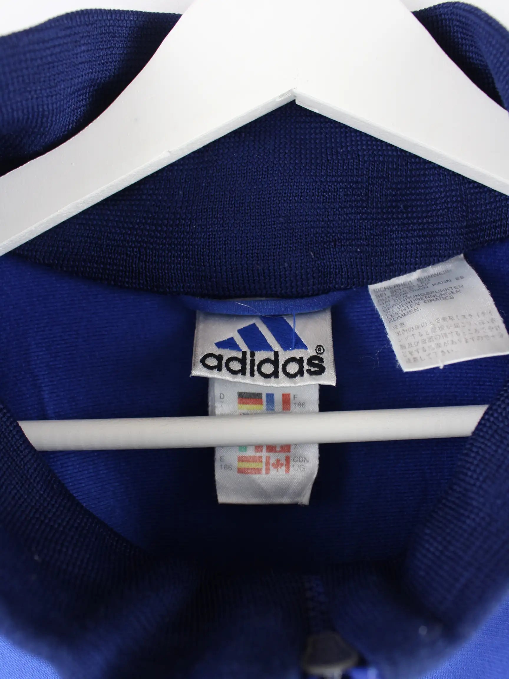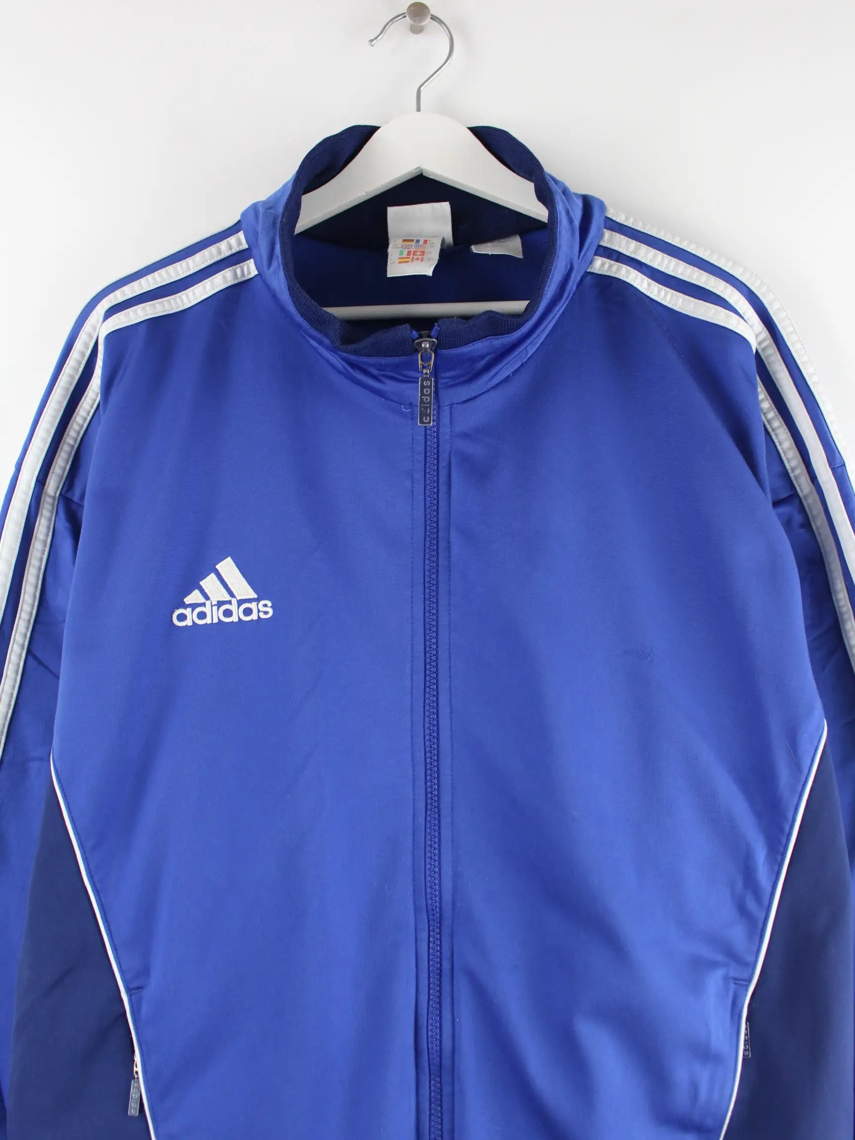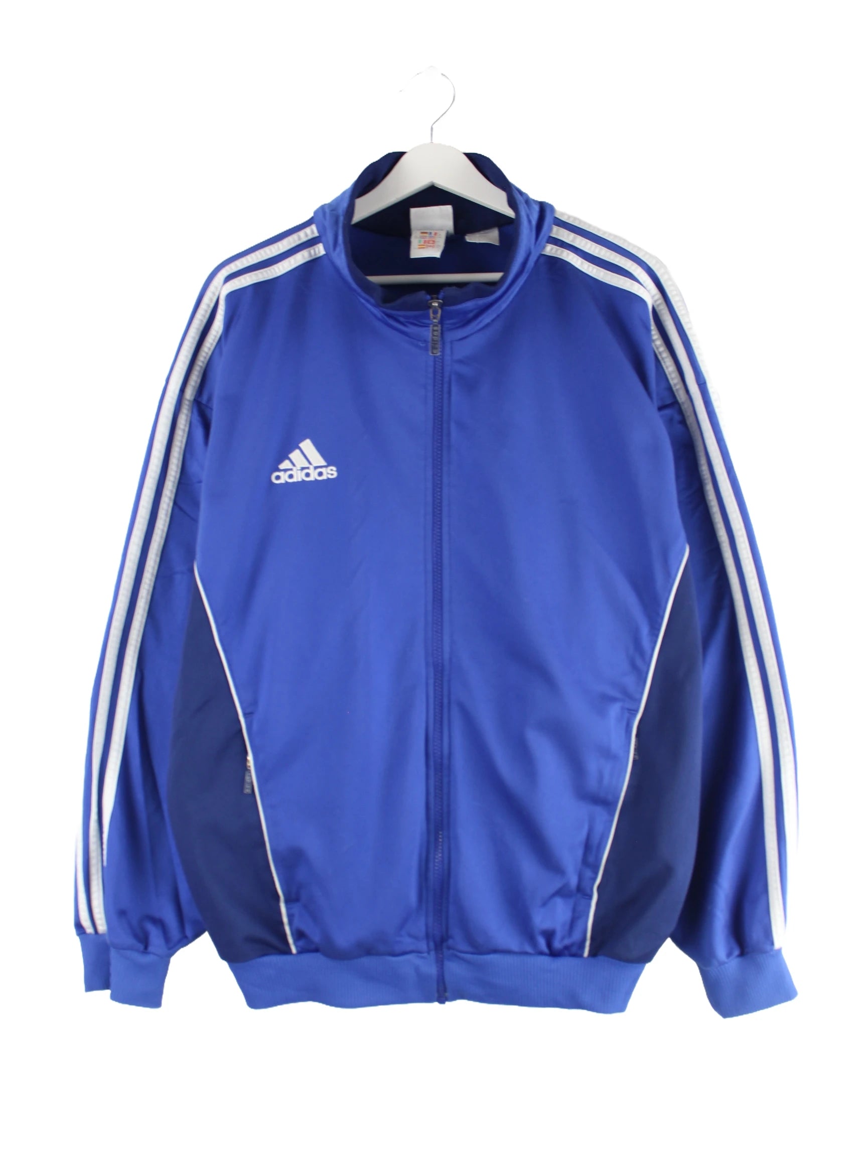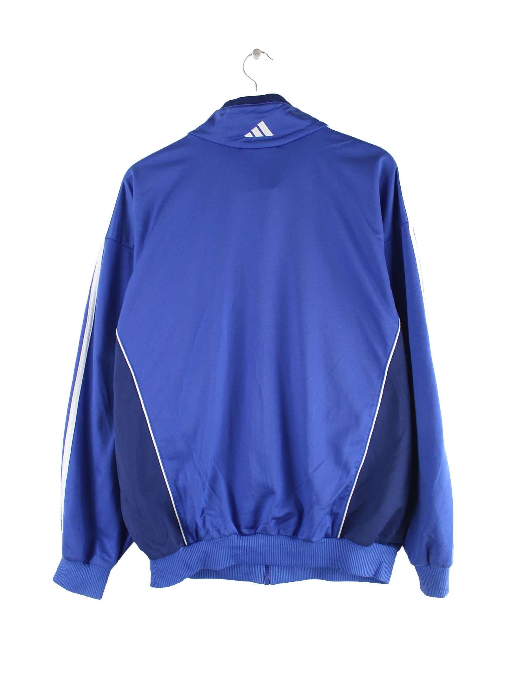 Blaue Trainingsjacke der Brand Adidas aus den 90'ern in Größe L. Sie ist aus Synthetik hergestellt und in gutem Zustand in Stock.