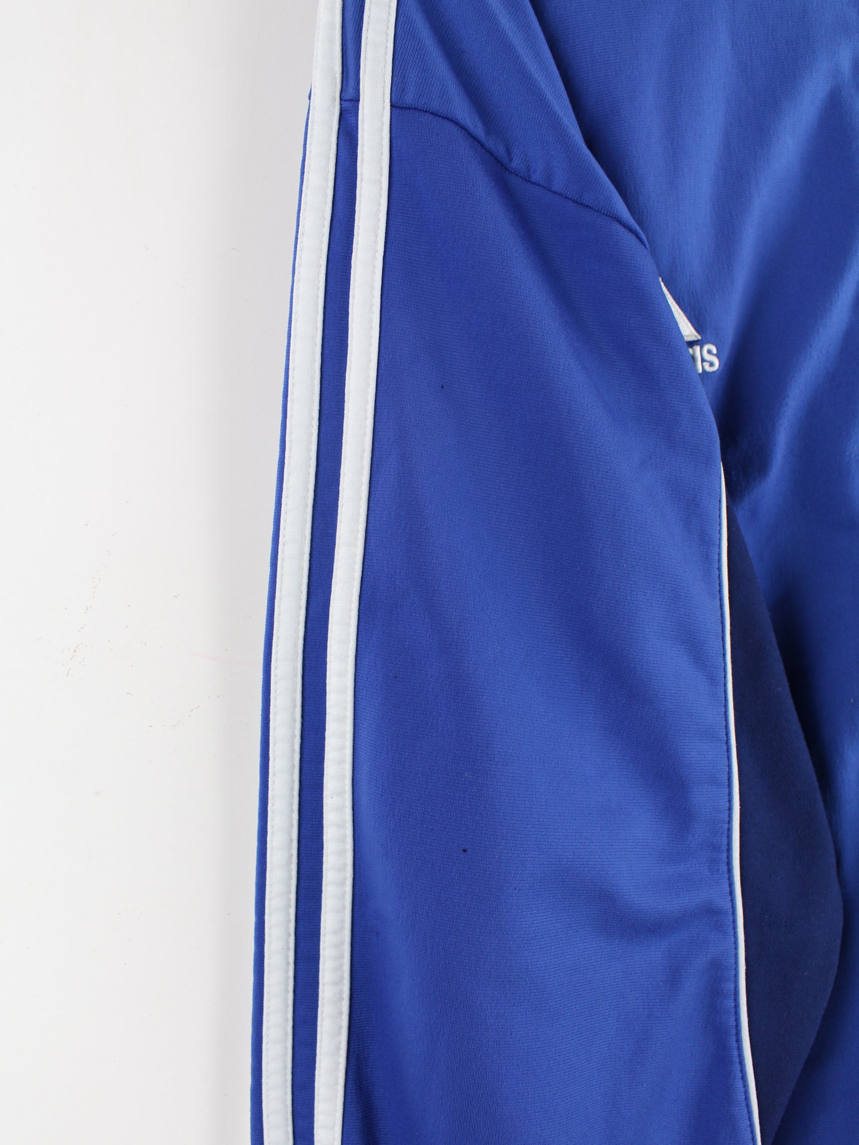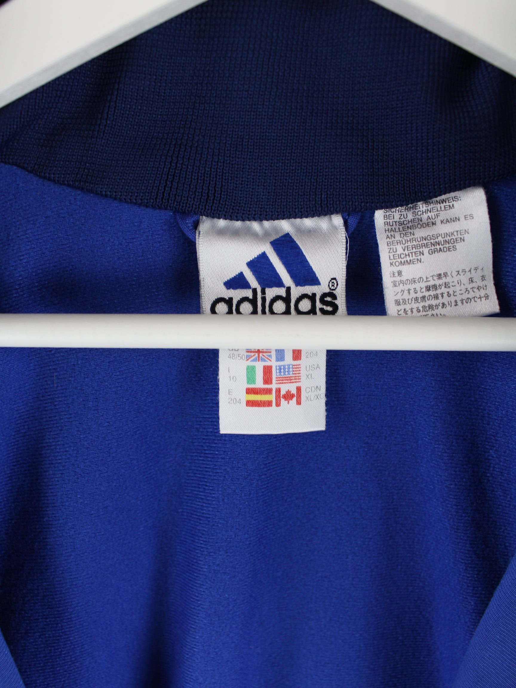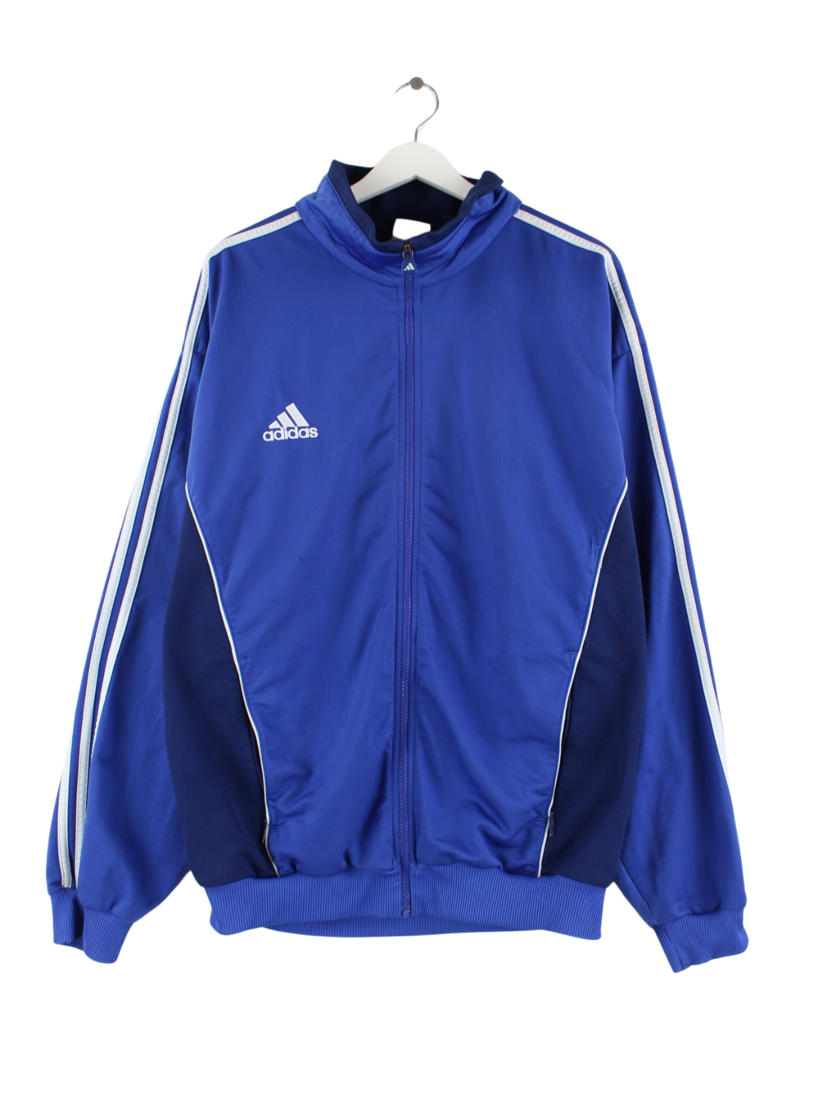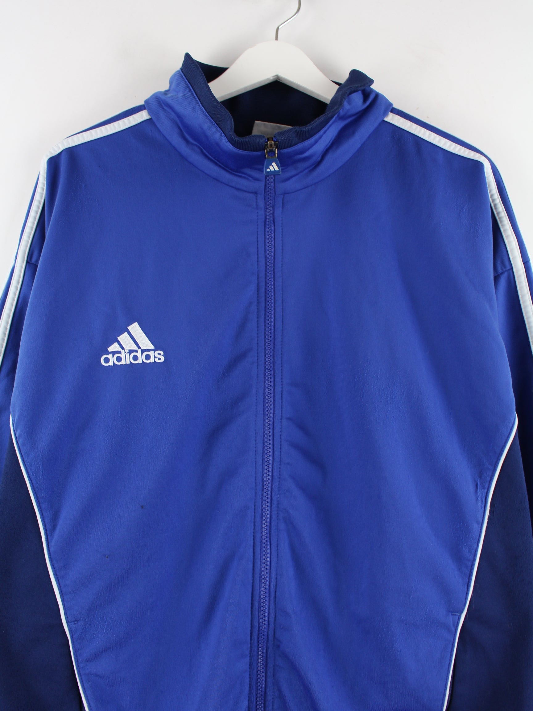 Blaue Trainingsjacke vom Label Adidas aus den 90'ern in Größe XL. Sie ist aus Synthetik angefertigt und in gutem Zustand bei uns vorrätig.