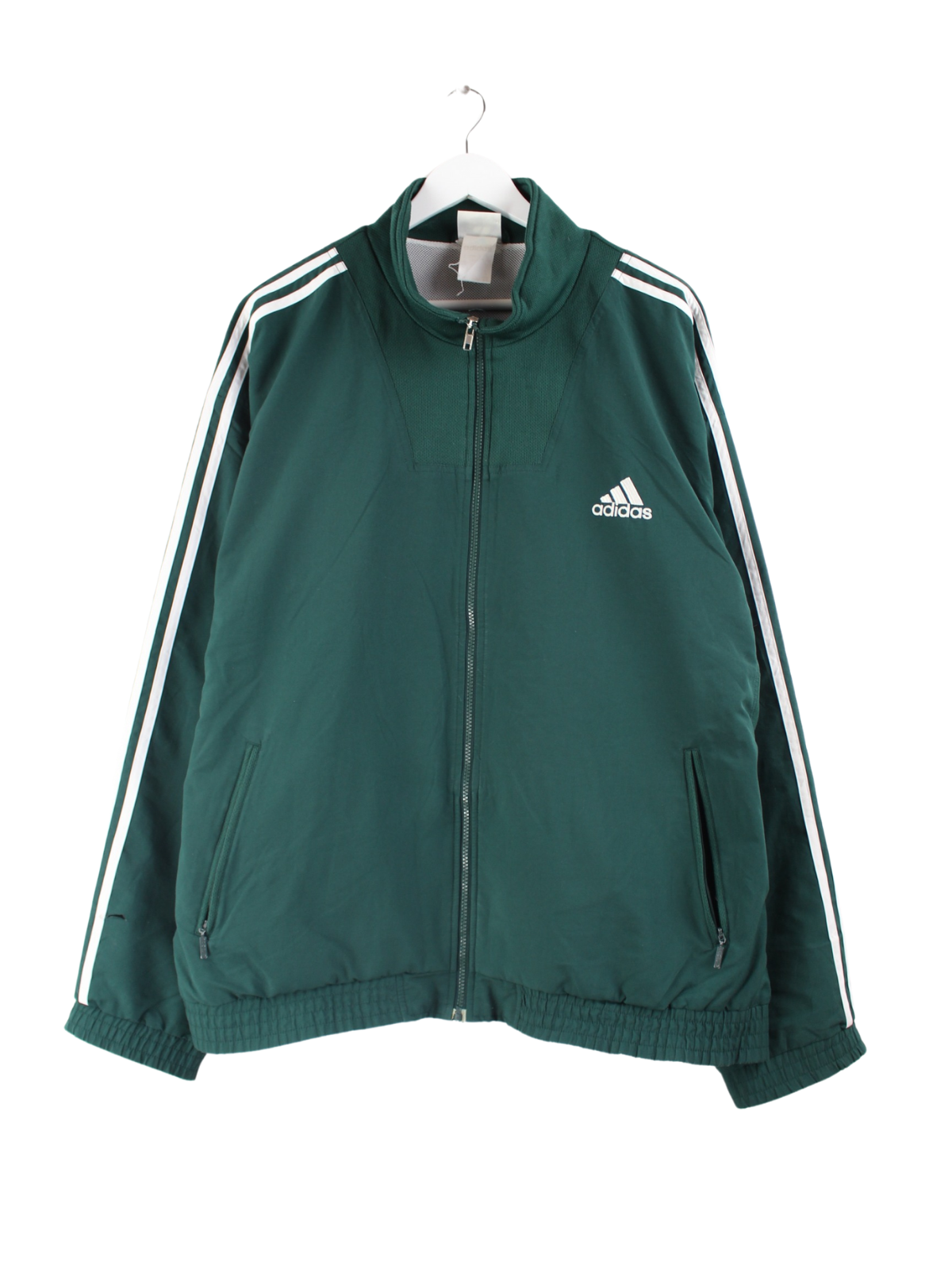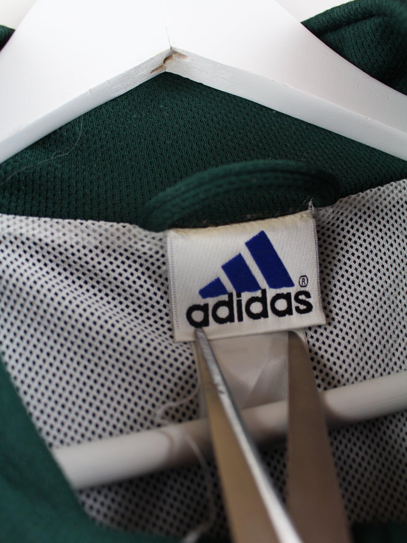 Training jacket from the Adidas brand in size XXL from the 90s. It is made of synthetic and comes in green in stock.