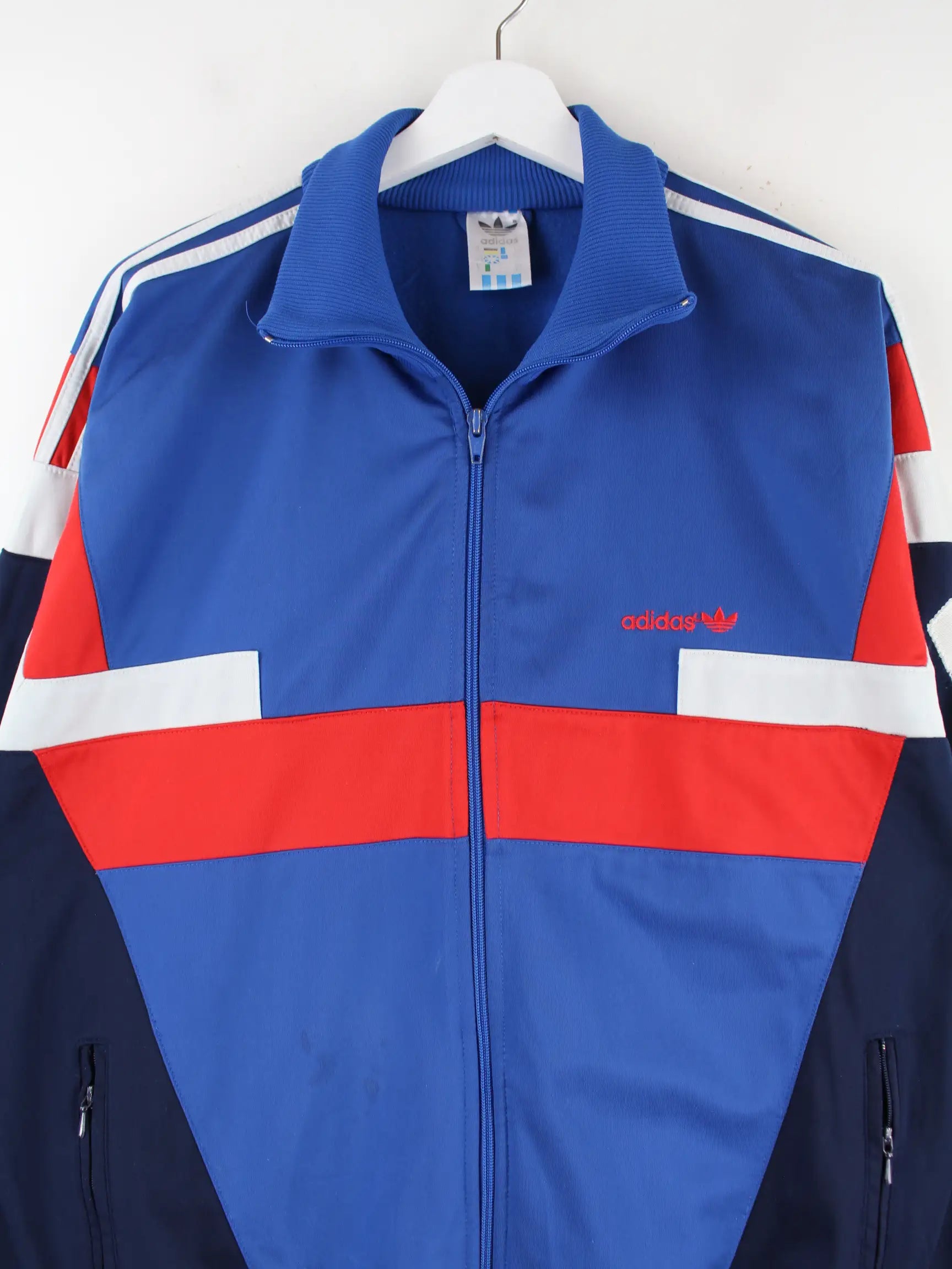 Blaue Trainingsjacke von Adidas aus den 90'ern in Größe L. Sie ist aus Synthetik gefertigt und in gutem Zustand auf Lager.