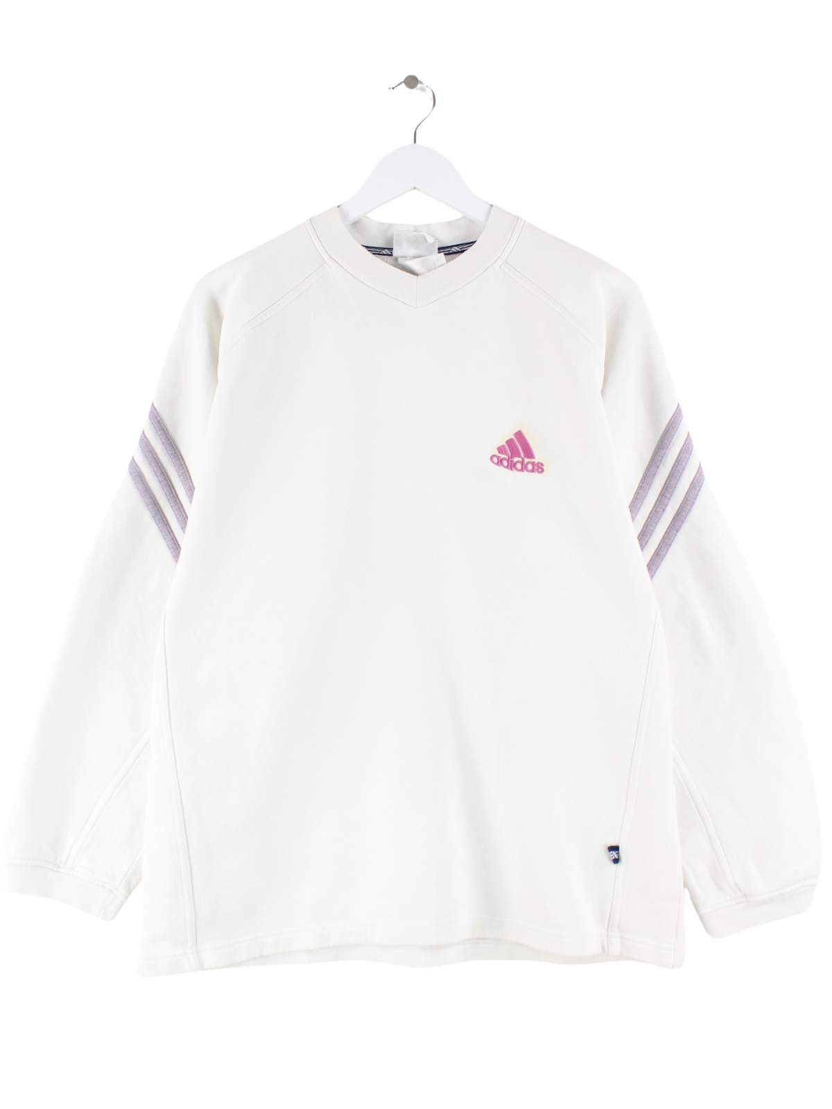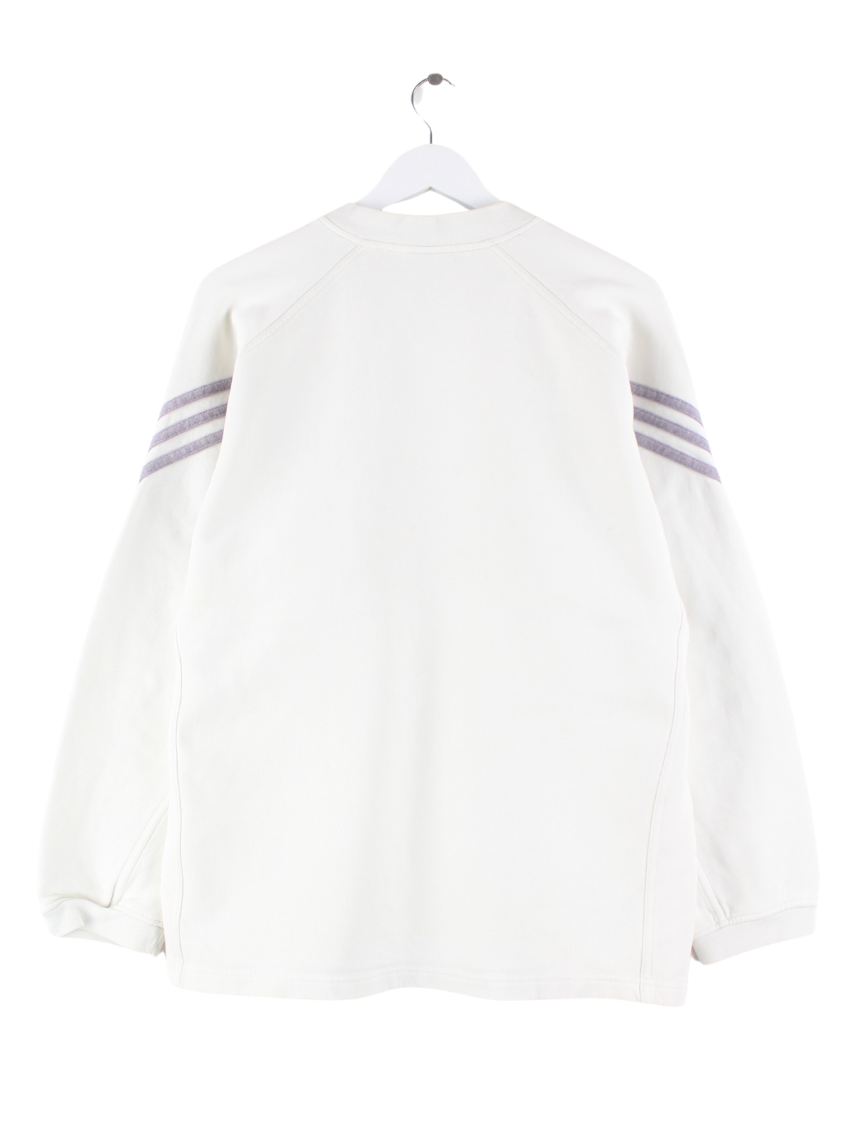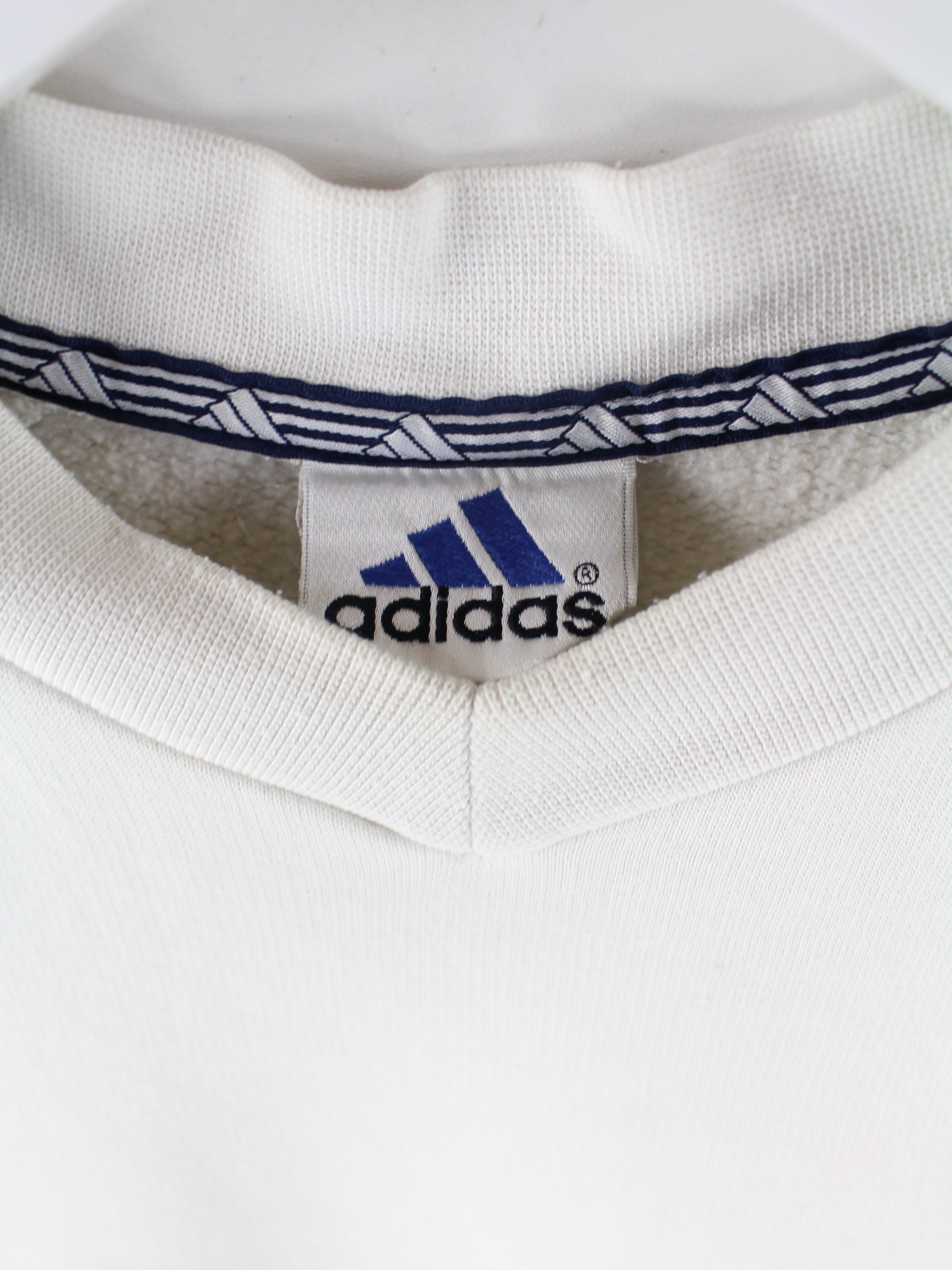 Weißer Sweater der Marke Adidas aus den 90'ern in Größe M. Er ist aus einer Baumwollmischung produziert und in gutem Zustand bei uns vorrätig.