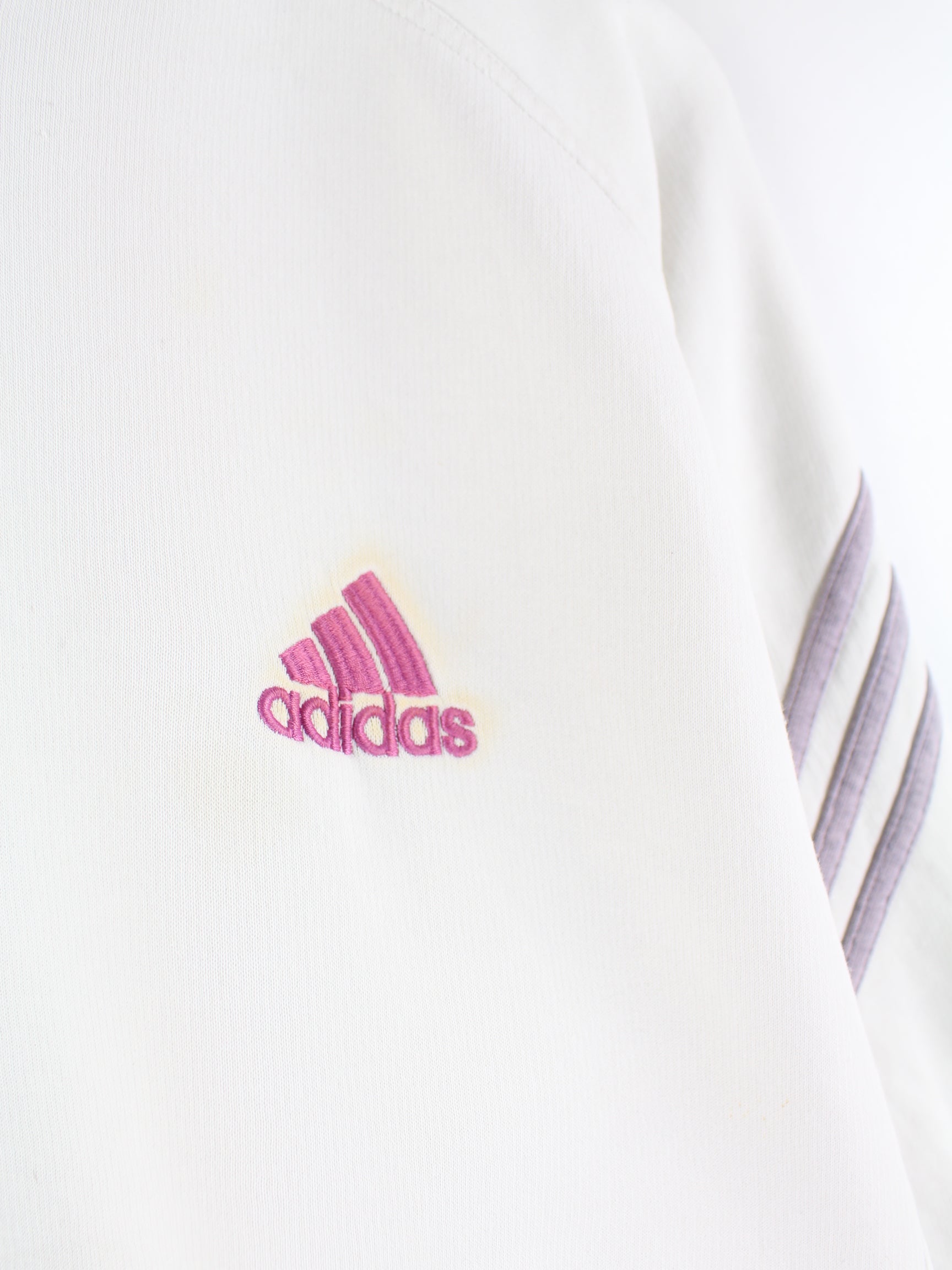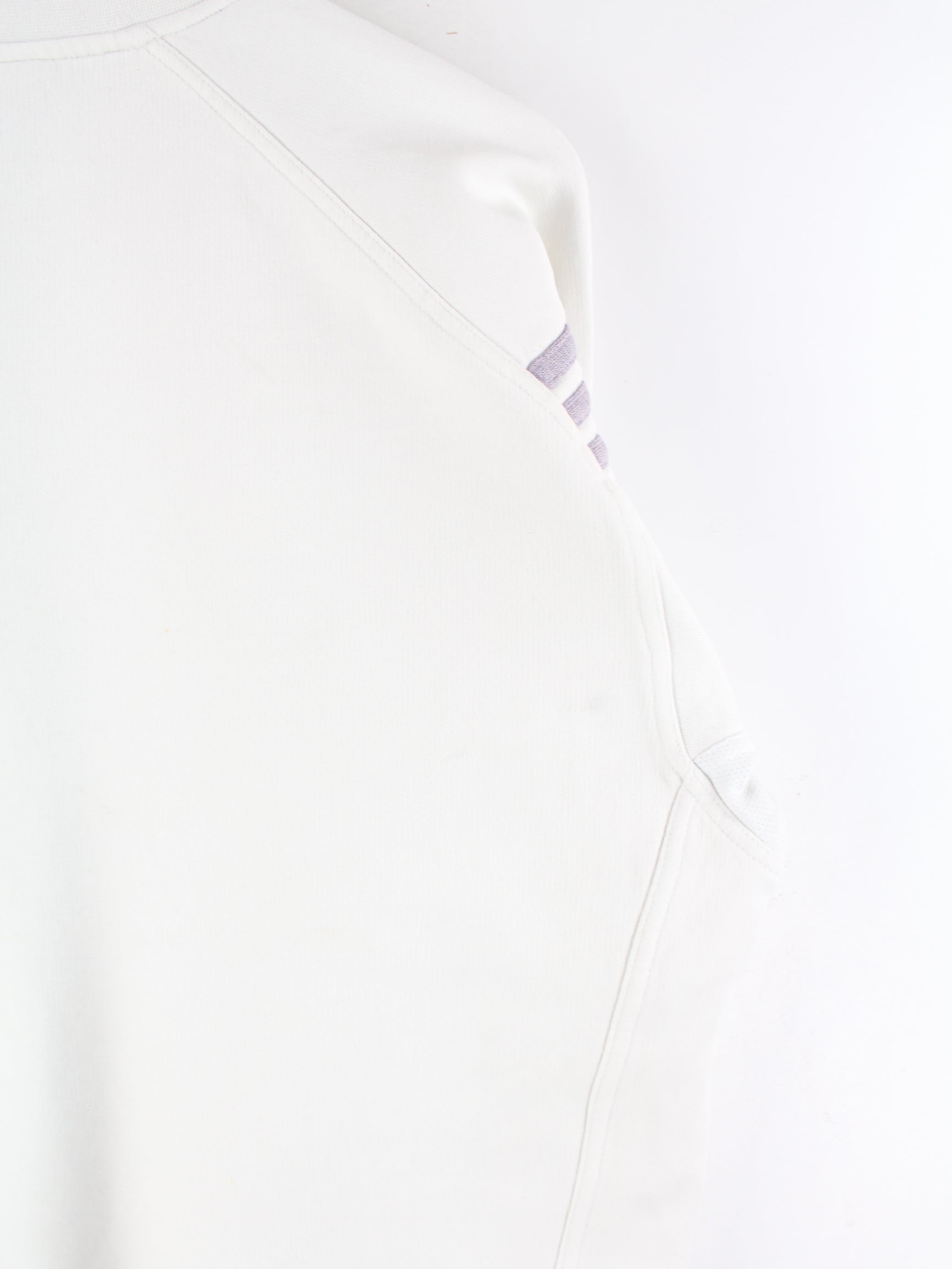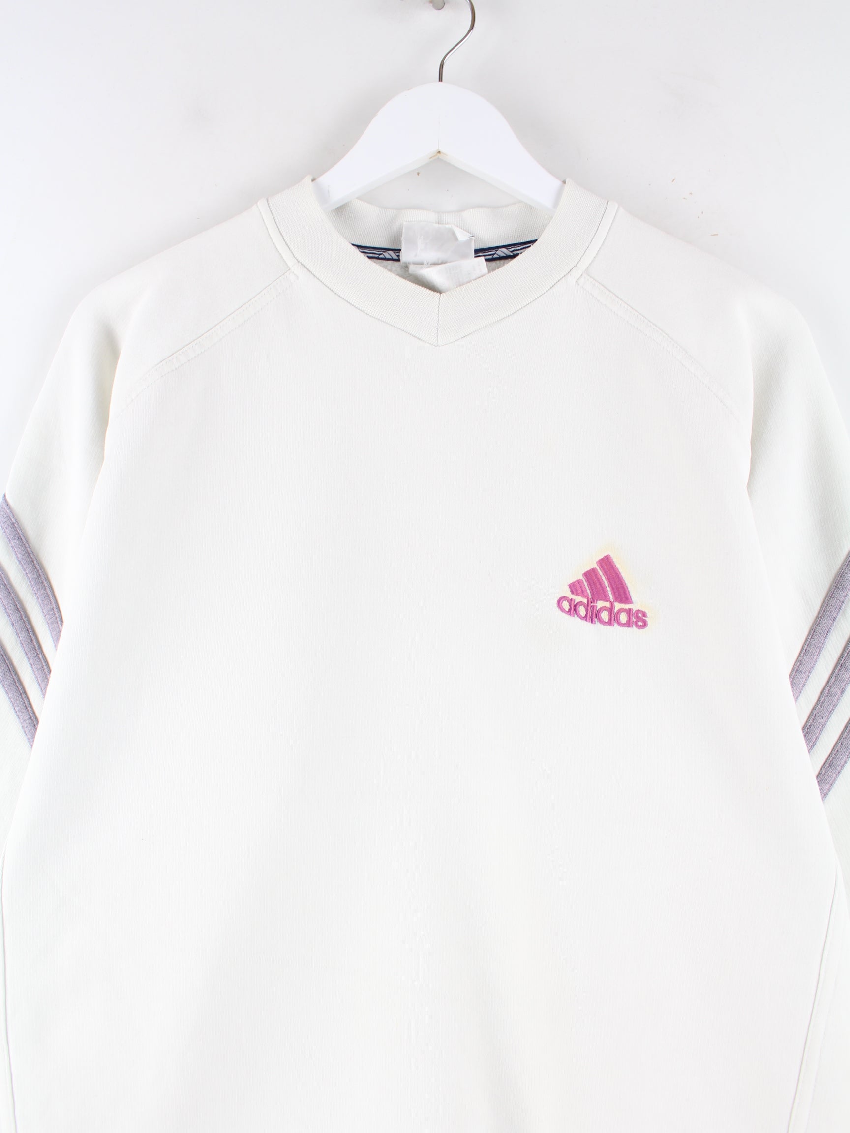 Weißer Sweater der Marke Adidas aus den 90'ern in Größe M. Er ist aus einer Baumwollmischung produziert und in gutem Zustand bei uns vorrätig.