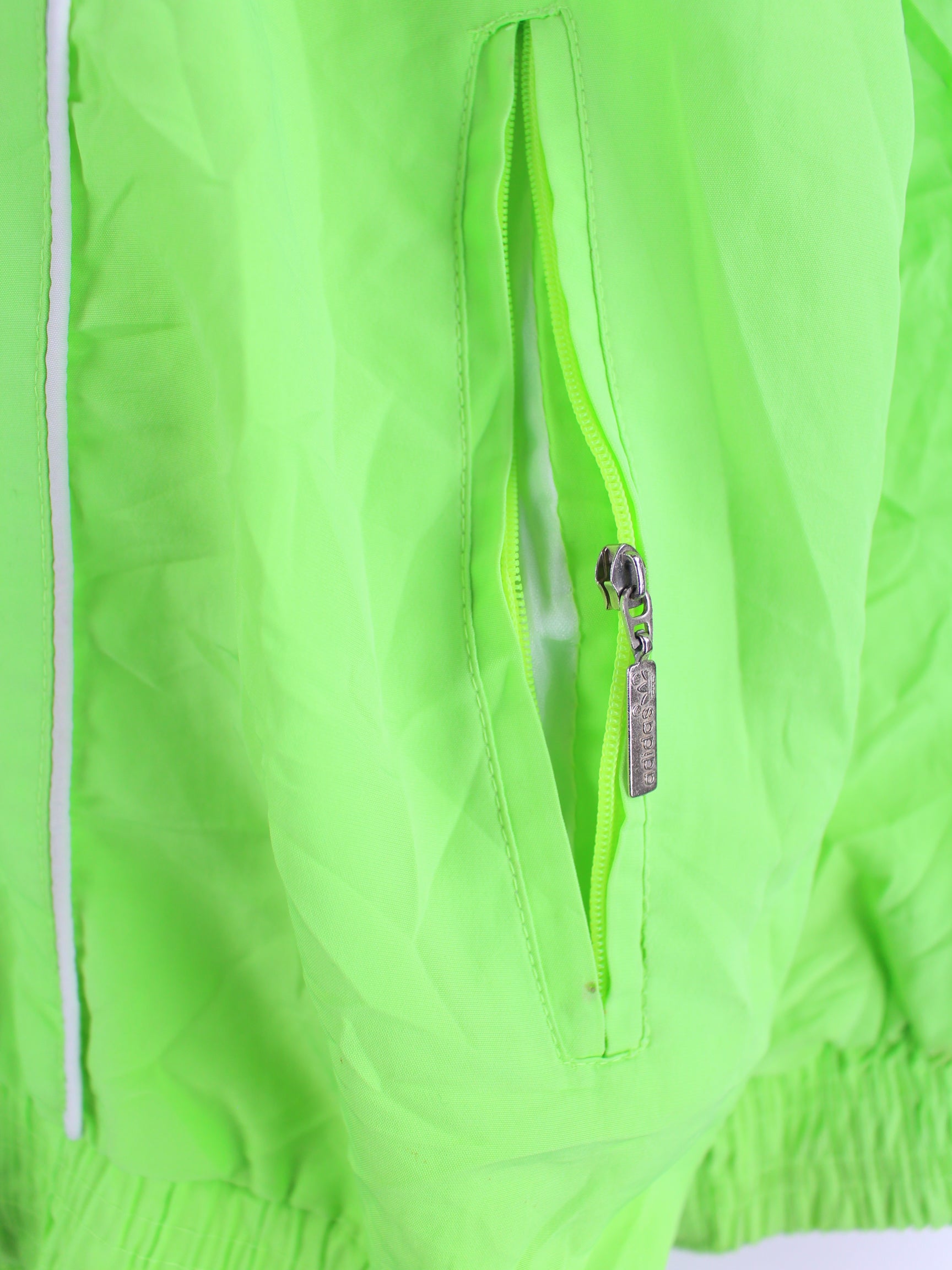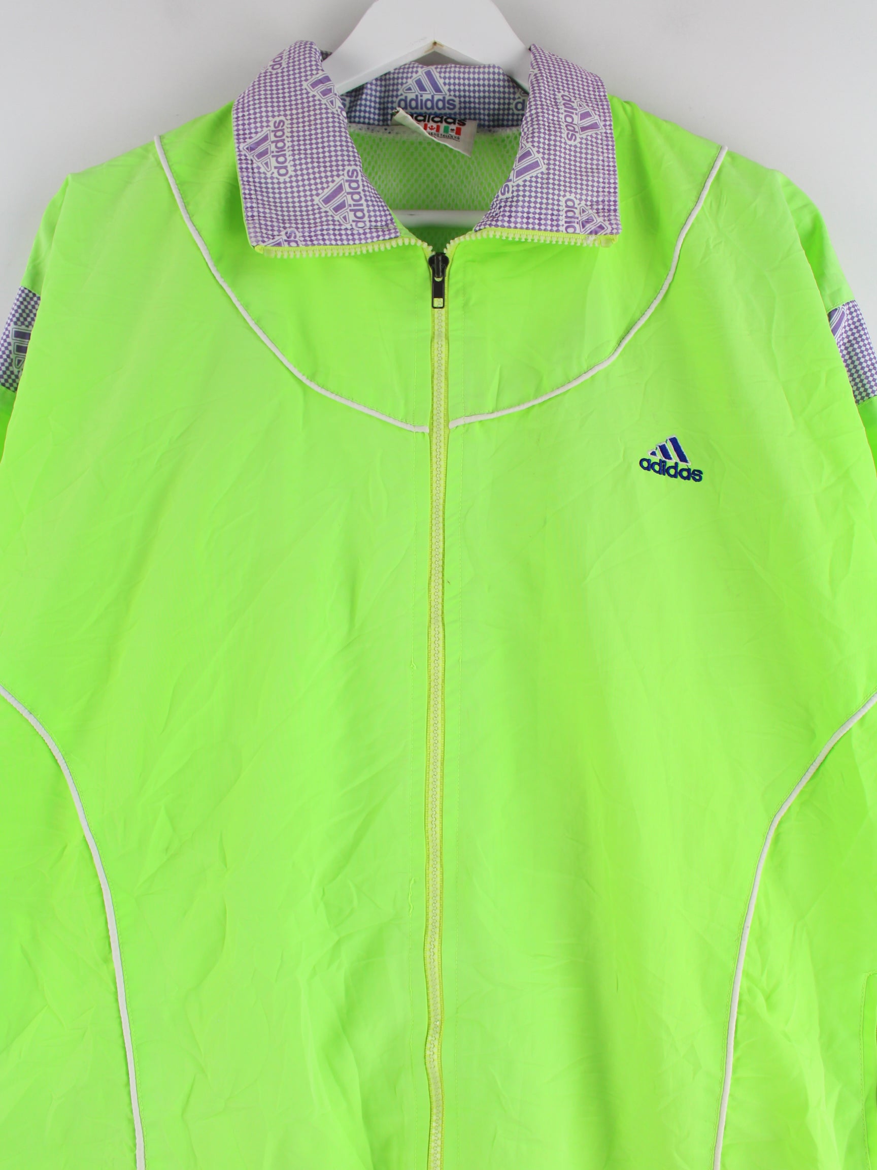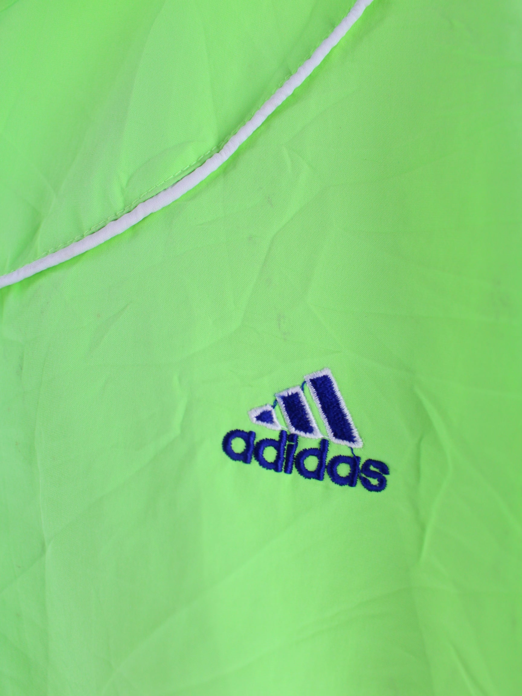 Training jacket from the Adidas label in size XL from the 90's. It is made of synthetic material and is available from us in green.