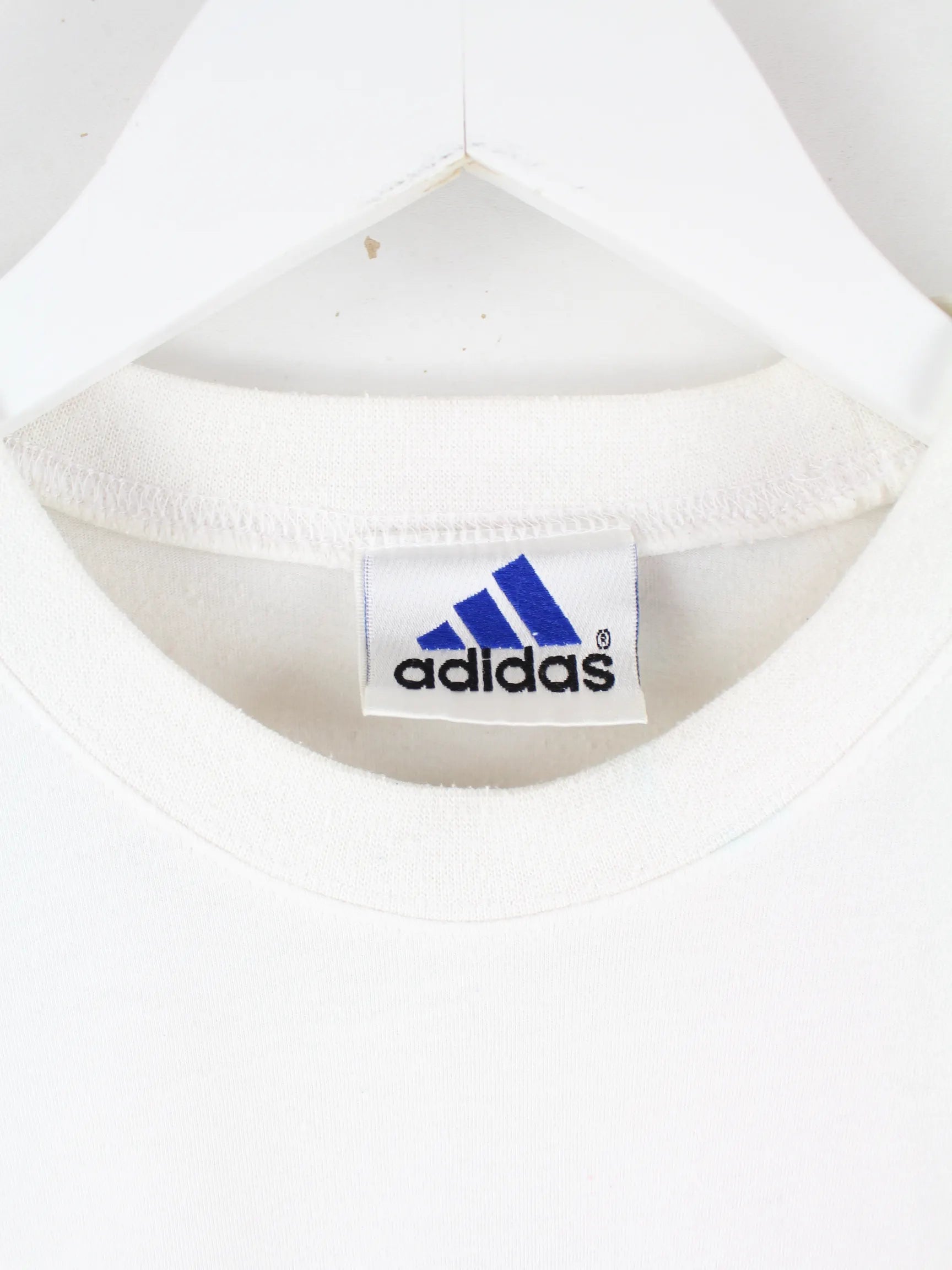 T-Shirt des Labels Adidas in Größe XL aus den 90'ern. Es ist aus Baumwolle gefertigt und in Weiß im Angebot. Mit schickem Vintage Print.