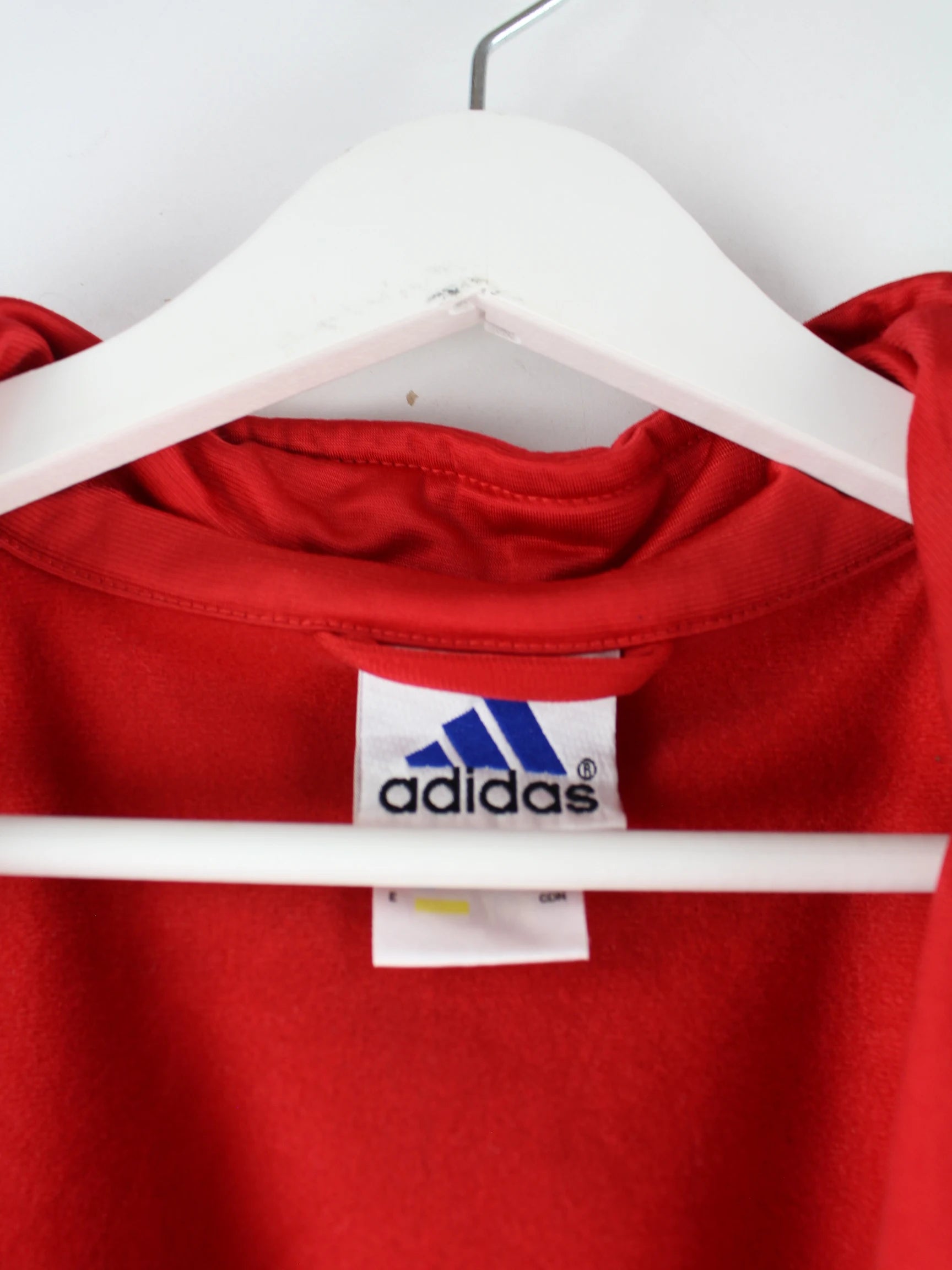 Trainingsjacke aus dem Hause Adidas in Größe XL aus den 90'ern. Sie ist aus Synthetik gemacht und in Rot lieferbar.