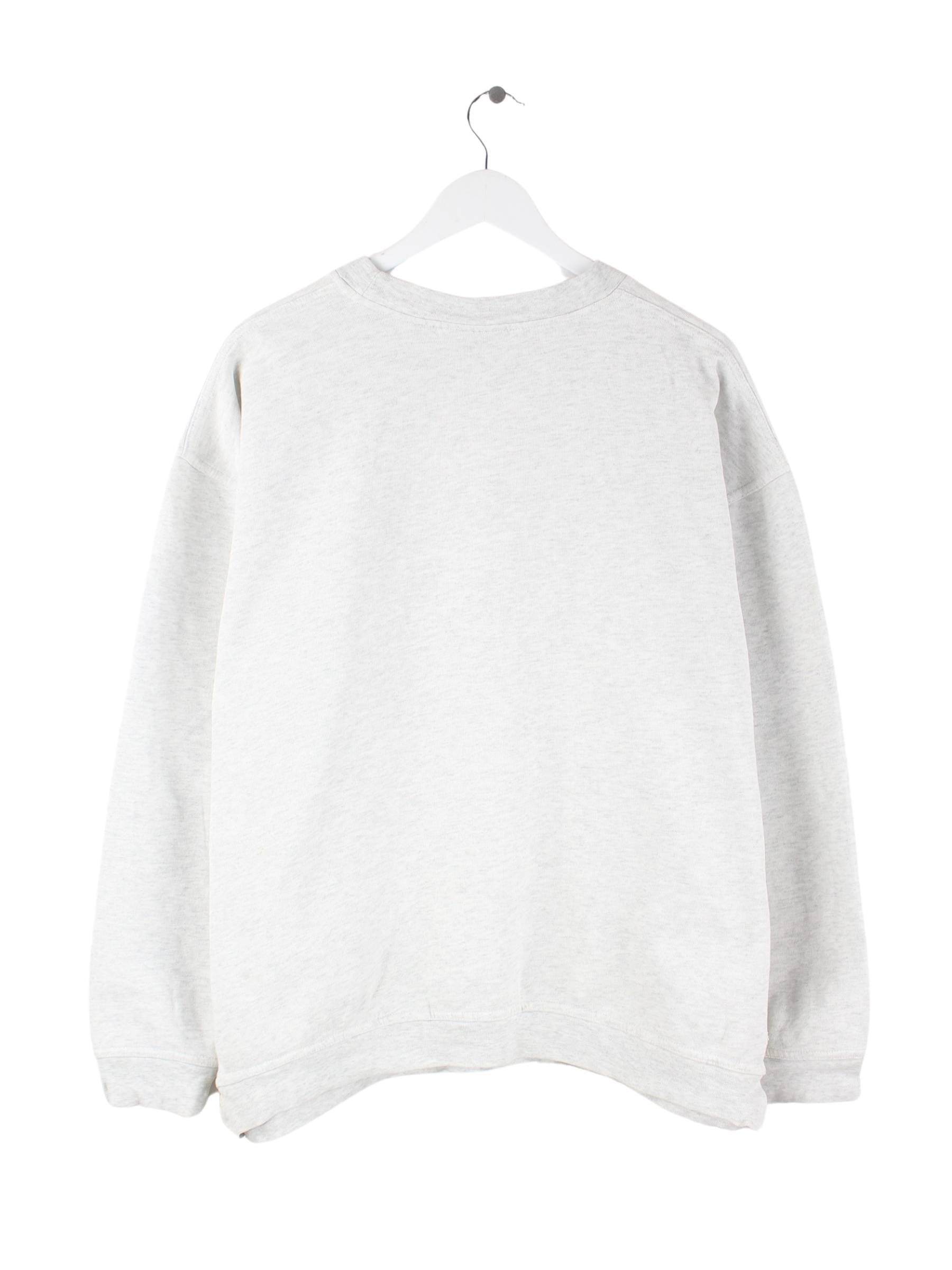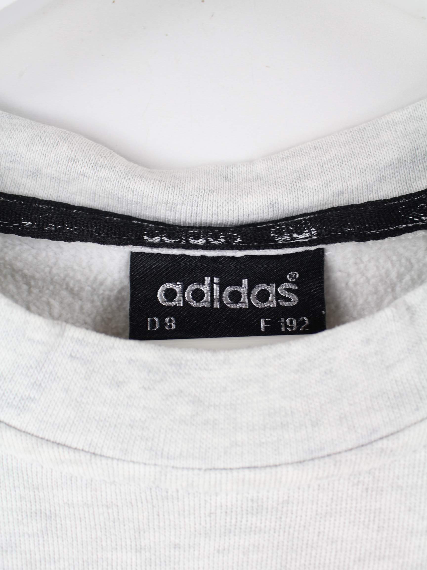 Sweater des Labels Adidas mit Stickereien in Größe L aus den 90'ern. Er ist aus einer Baumwollmischung gemacht und in Grau bei uns zu bekommen.