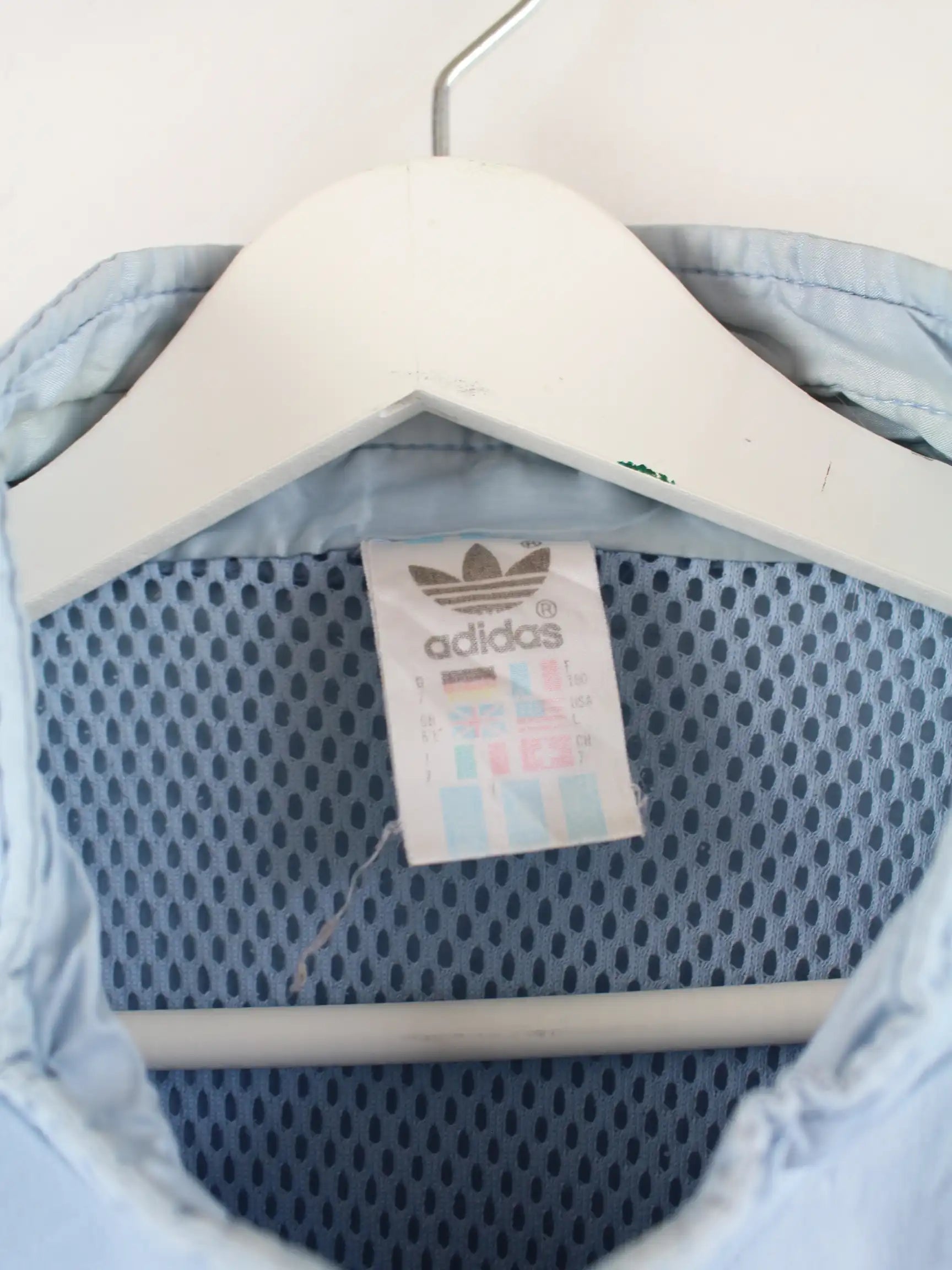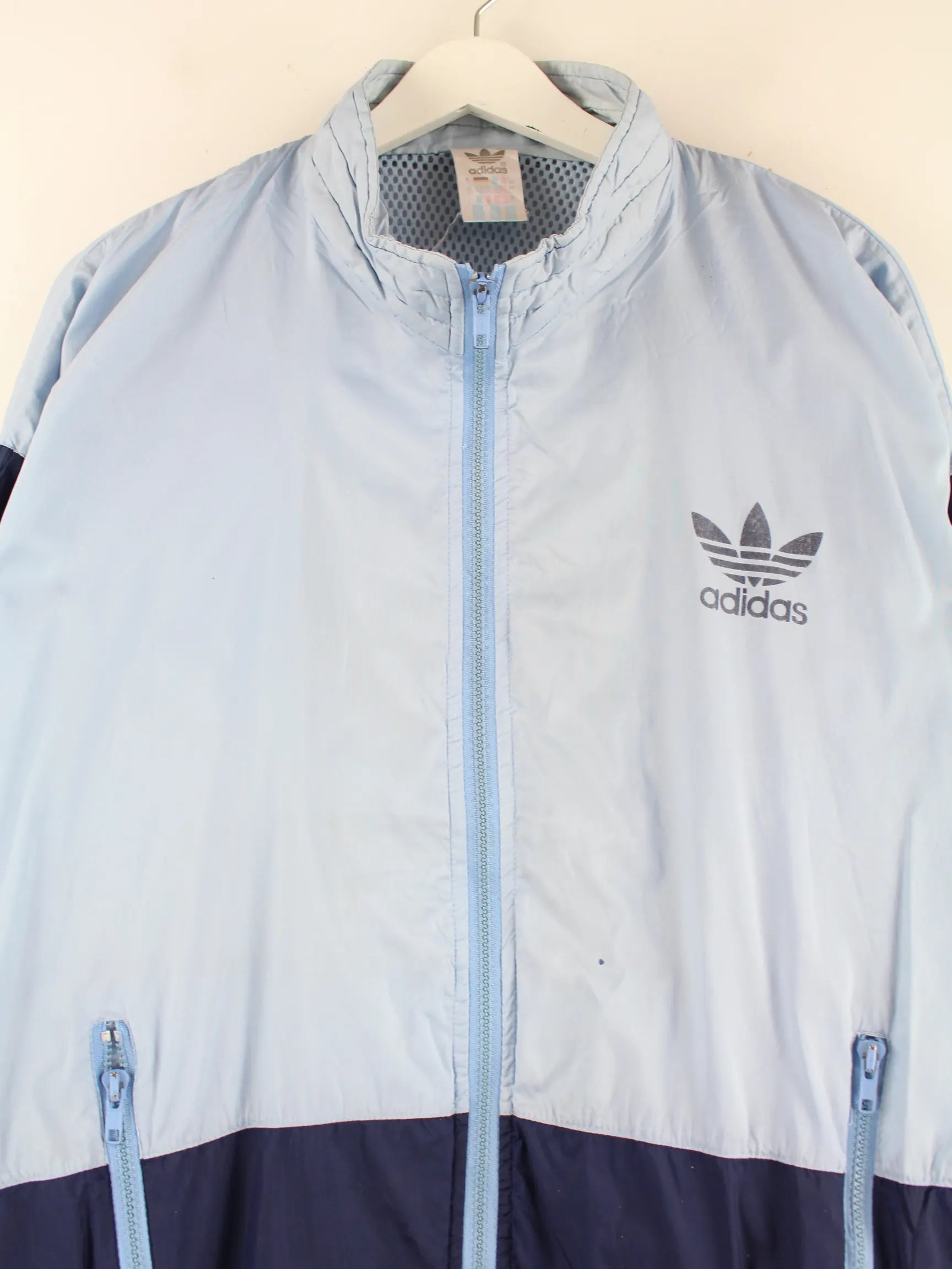 Blaue Trainingsjacke vom Brand Adidas aus den 90'ern in Größe L. Sie ist aus Synthetik angefertigt. Den Zustand würden wir als 'In Ordnung' bezeichnen (vergl. Bilder).Mit schönem Trefoil Print.