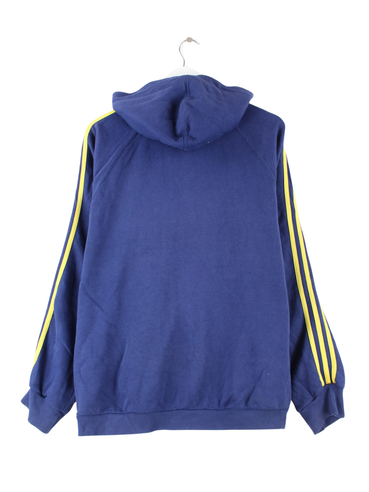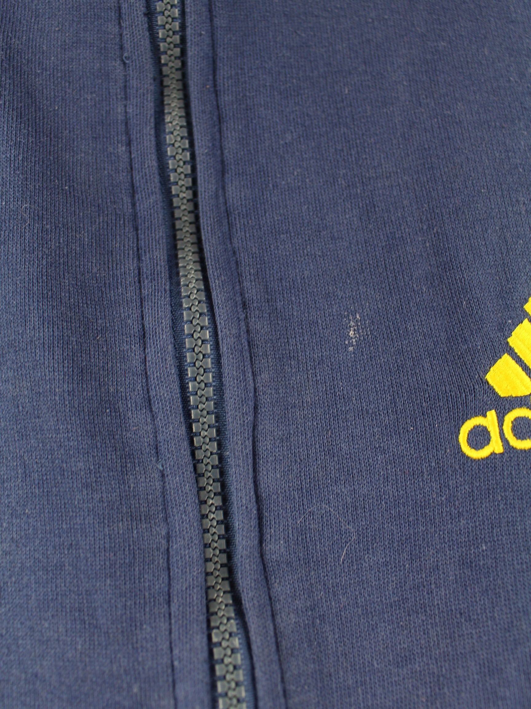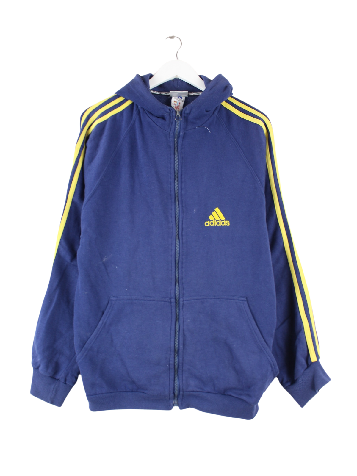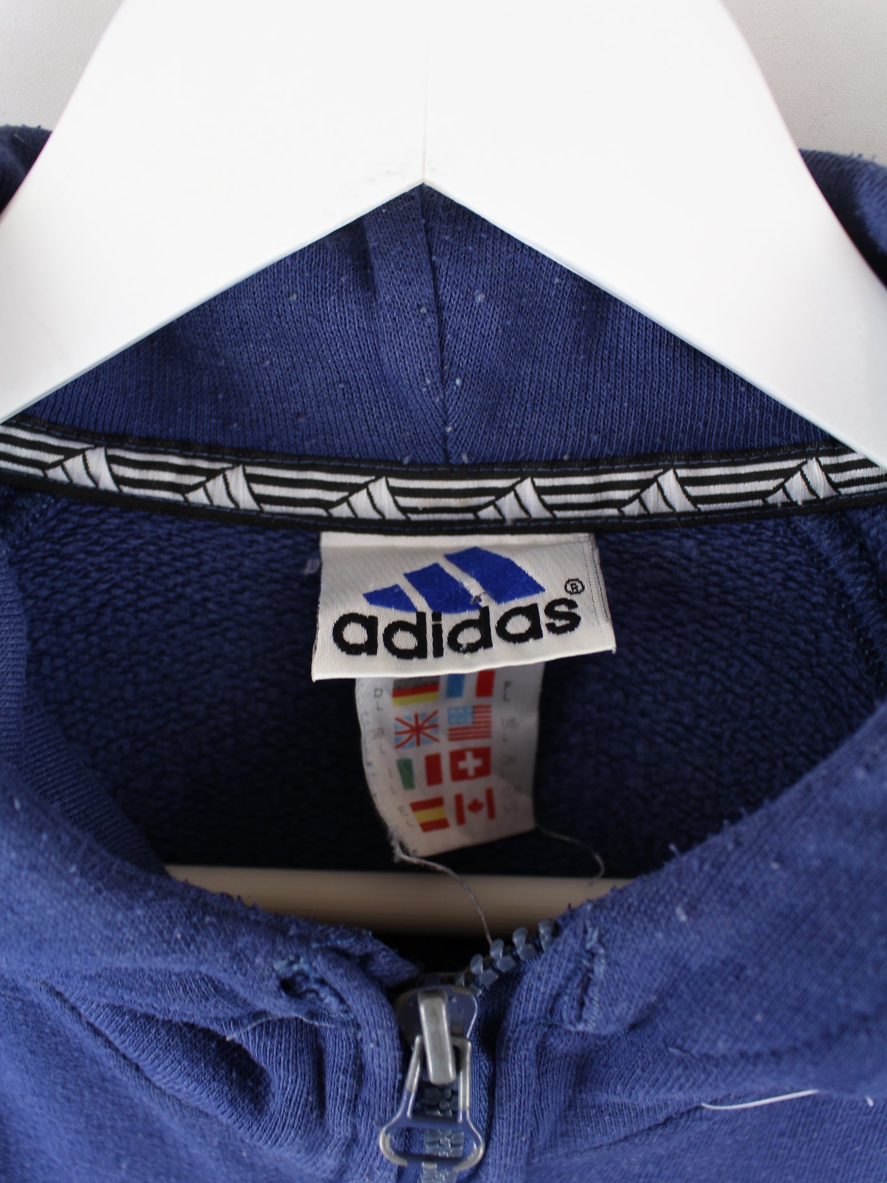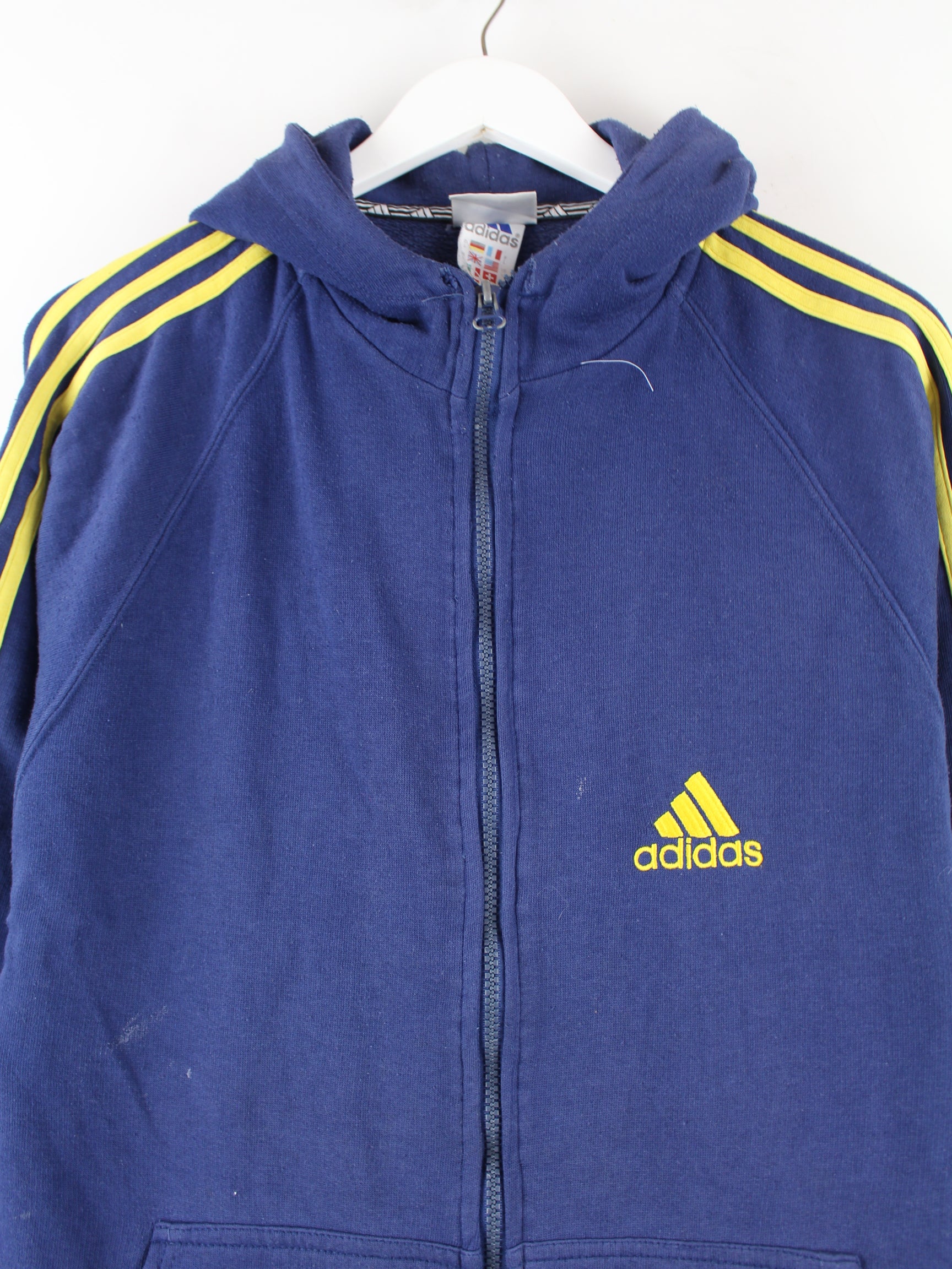 Blue hoodie with full-length zip from the Adidas label from the 90's in size L. It is made from a cotton blend. We would describe the condition as 'fine' (see pictures).