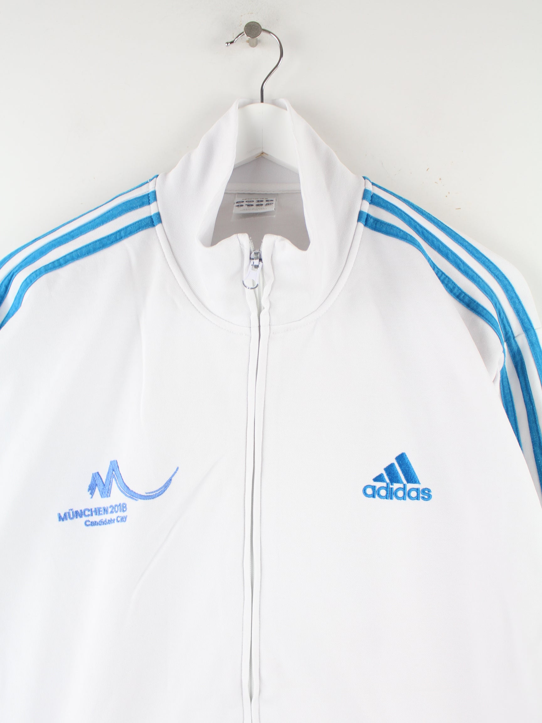 Weiße Trainingsjacke mit gesticktem Logo aus dem Hause Adidas in Größe XL. Sie ist aus Synthetik hergestellt und in sehr gutem Zustand bei uns vorrätig.