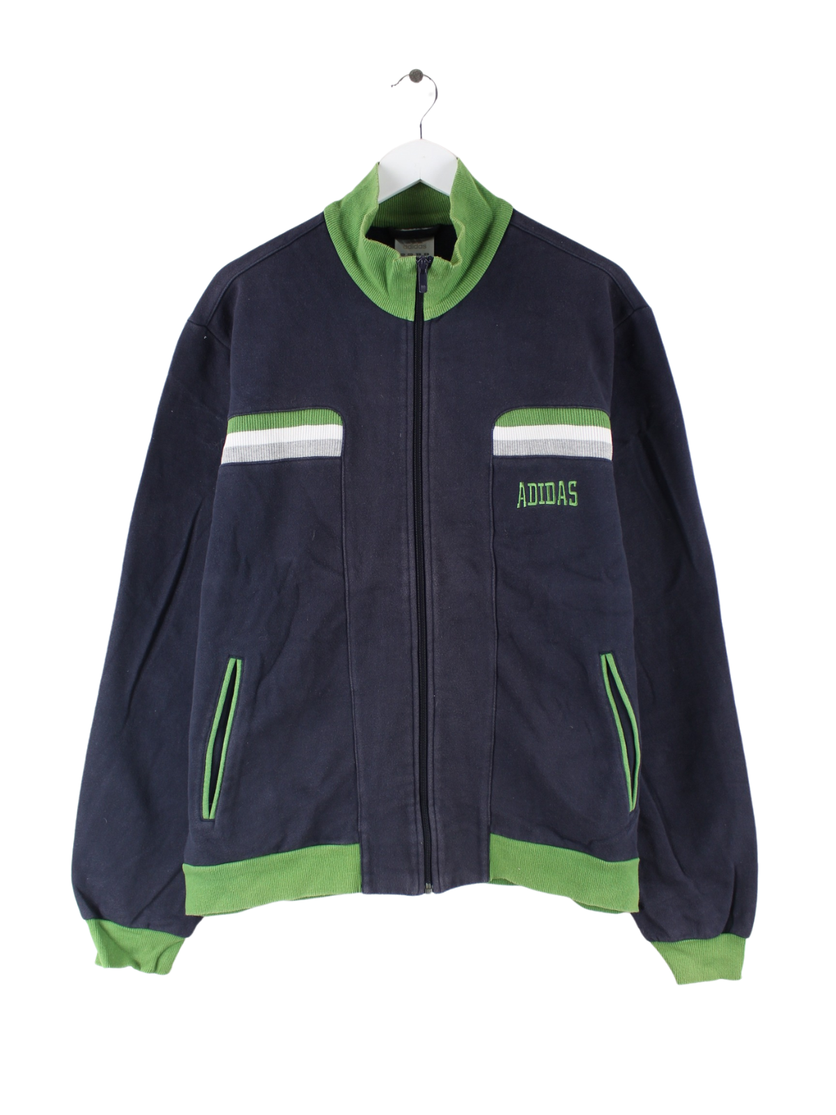 Sweatjacke vom Brand Adidas mit gesticktem Logo in Größe L. Sie ist aus einer Baumwollmischung hergestellt und in Blau im Bestand.