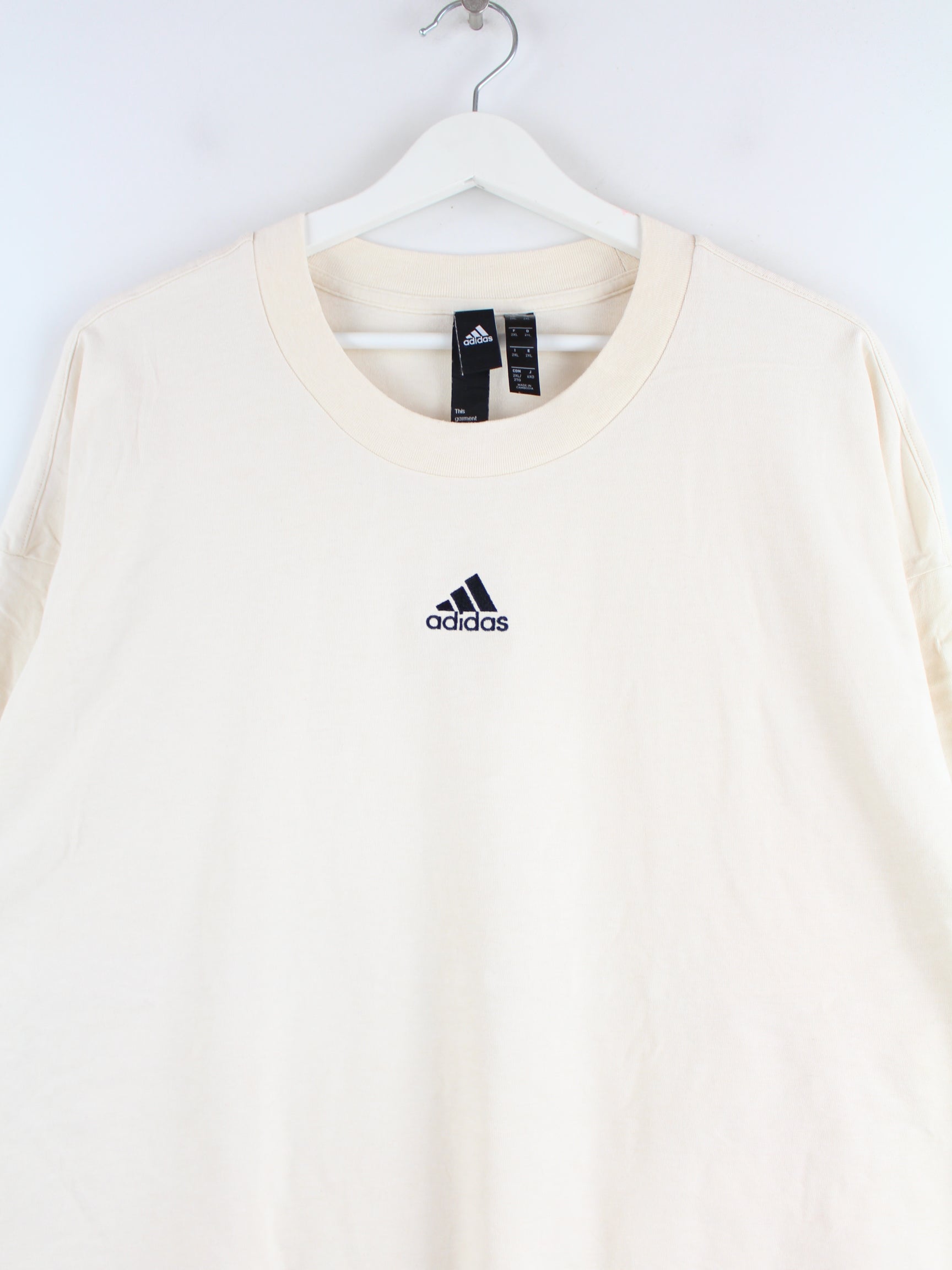 T-shirt from the Adidas label with embroidery in size XXL. It is made from a cotton blend and comes in beige.